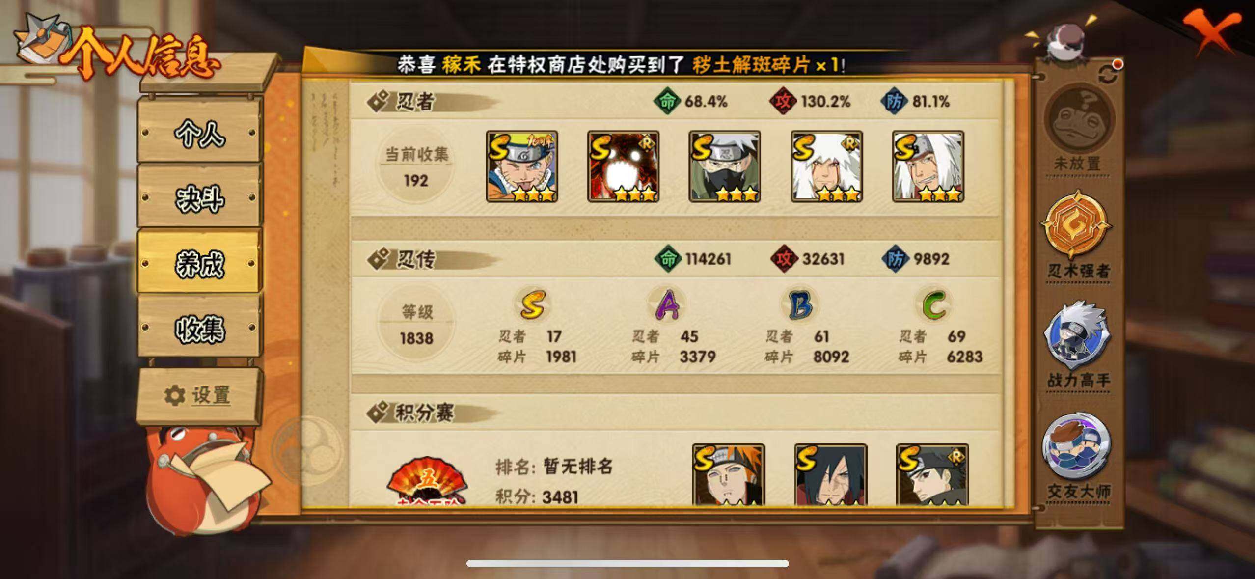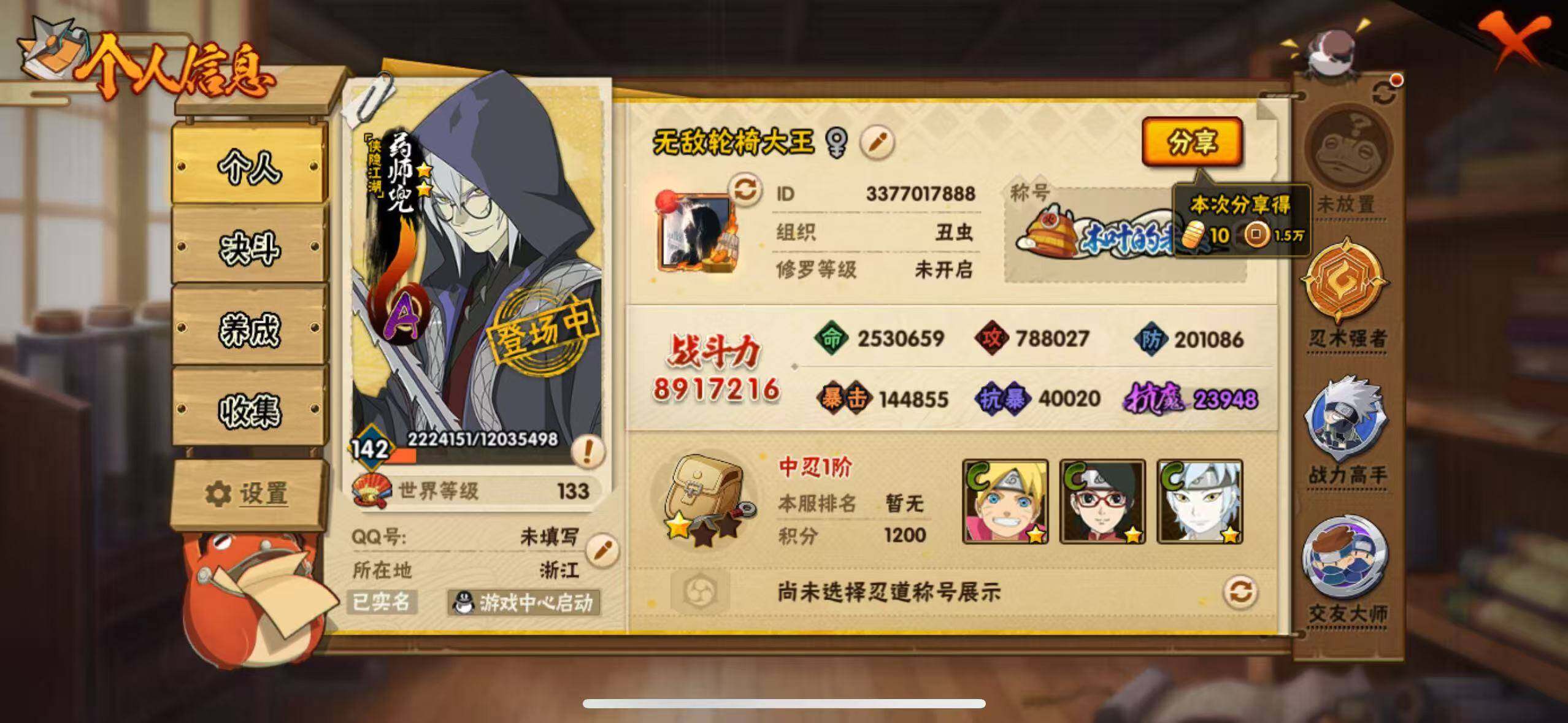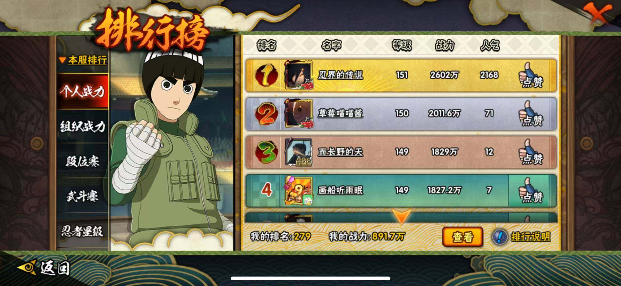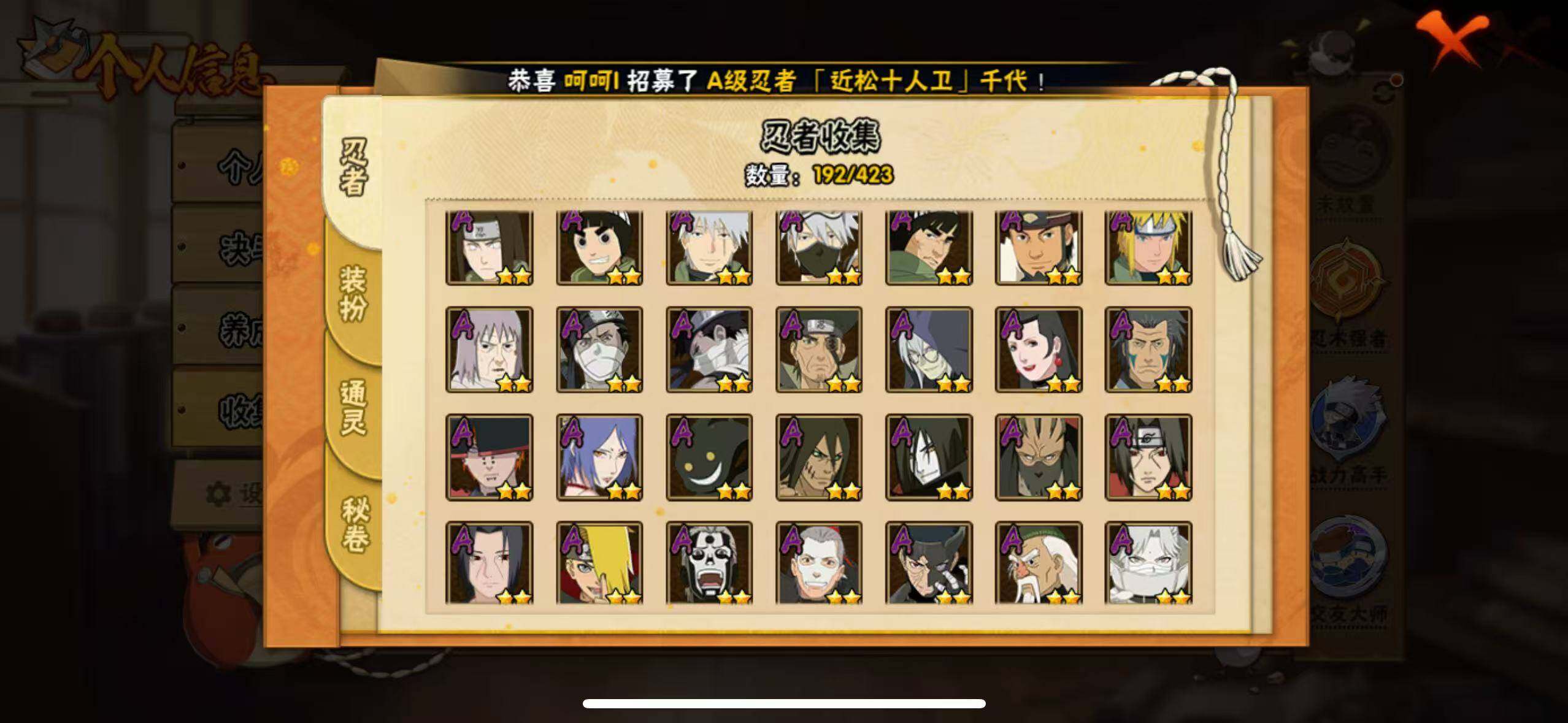 [16527379]17s级忍者数-45a级忍者数 【s级忍者】:长门「秽土转生」3星,宇智波斑「秽土转生·解」3星,艾「忍界大战」3星,宇智波鼬「须佐能乎」3星,宇智波止水「须佐能乎」3星,旗木卡卡西「须佐能乎」3星,自来也「舞之豪杰」3星,自来也「传说中的三忍」3星,波风水门3星,佩恩「天道」3星,宇智波斑 「白面具」3星宇智波斑「白面具」,大筒木桃式3星,大筒木舍人「最终章」3星,漩涡鸣人「暴怒·第六尾」3星,波风水门「九喇嘛连结」3星,宇智波斑「五影会谈」3星,漩涡鸣人·宇智波佐助3星 【a级忍者】:波风水门「青年」2星,达鲁伊「博人传」2星,迪达拉2星,大蛇丸「晓」2星,飞段3星,飞段「死司凭血」2星,飞段「恶灵之影」2星,干柿鬼鲛5星,漩涡博人「桃式显现」2星,机械鸣人「初始形态」2星,迈特凯5星,旗木卡卡西「元气夏日」2星,旗木卡卡西「幻之真容」2星,桃地再不斩2星,桃地再不斩「秽土转生」2星,我爱罗「疾风传」3星,蝎3星,蝎「绯流琥」2星,小南「漂泊浪客」2星,角都「秽土转生」2星,猿飞阿斯玛5星,猿飞阿斯玛「七夕限定」2星,宇智波鼬2星,宇智波鼬「夏日限定」2星,宇智波佐助「侠隐江湖」2星,药师兜「侠隐江湖」2星,日向宁次「忍界大战」2星,黑绝2星,宇智波带土「漂泊浪客」2星,长十郎「六代目水影」2星,卑留呼「火之意志继承者」2星,神秘面具男「忍者之路」2星,佩恩·六道「漂泊浪客」2星,李洛克「忍界大战」2星,黑土「夏日限定」2星,秋道丁次「忍界大战」2星,千代「近松十人卫」2星,神农「羁绊」2星,土台「忍界大战」2星,不缘2星,宇智波泉奈2星,不动2星,大野木「侠隐江湖」2星,巳月「仙人模式」2星,迈特凯「青春爆炸」2星