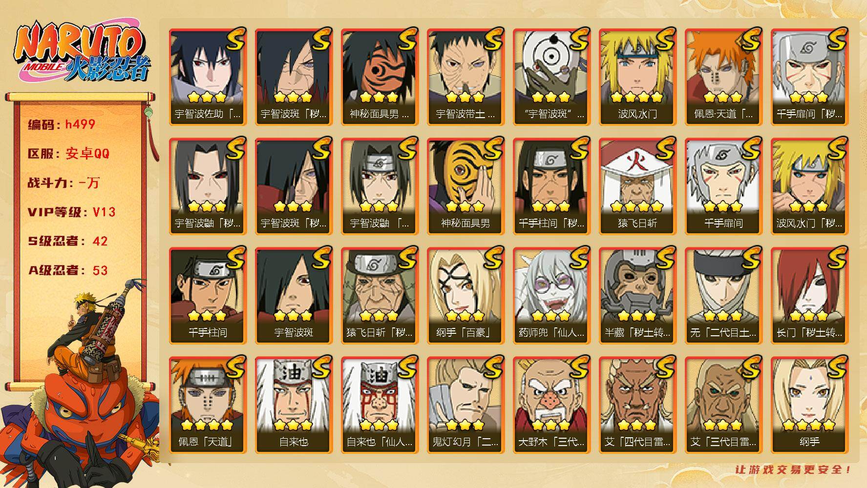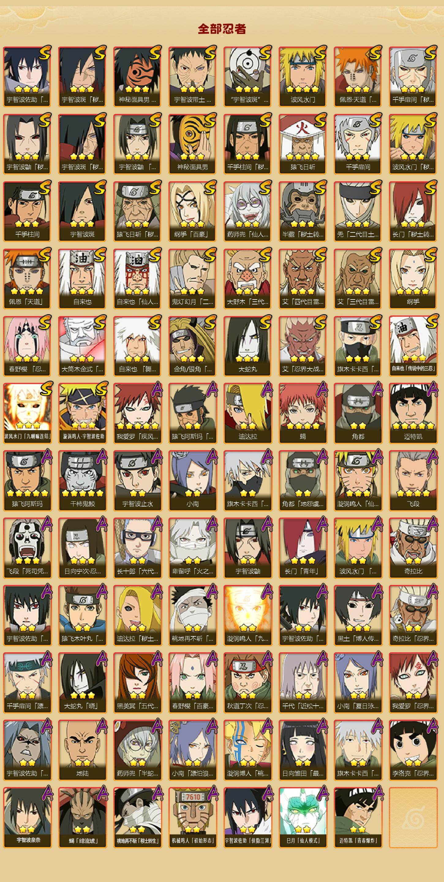 [16527756]42s级忍者数-53a级忍者数 【s级忍者】:长门「秽土转生」3星,半藏「秽土转生」3星,金角·银角「秽土转生」3星,猿飞日斩「秽土转生」3星,波风水门「秽土转生」3星,千手扉间「秽土转生」3星,千手柱间「秽土转生」3星,宇智波鼬「秽土转生」3星,宇智波斑「秽土转生」3星,宇智波斑「秽土转生·解」3星,春野樱「忍界大战」3星,宇智波带土「忍界大战」3星,艾「忍界大战」3星,宇智波鼬「须佐能乎」3星,旗木卡卡西「须佐能乎」3星,无「二代目土影」3星,艾「四代目雷影」3星,鬼灯幻月「二代目水影」3星,大野木「三代目土影」3星,艾「三代目雷影」3星,自来也3星,自来也「仙人模式」3星,自来也「舞之豪杰」3星,大蛇丸3星,自来也「传说中的三忍」3星,纲手4星,纲手「百豪」3星,千手柱间3星,千手扉间3星,猿飞日斩4星,宇智波斑3星,波风水门4星,药师兜「仙人模式」3星,神秘面具男3星,神秘面具男「红夜之刃」3星,佩恩「天道」4星,佩恩·天道「超」3星,宇智波佐助「永恒万花筒」3星,宇智波斑 「白面具」3星宇智波斑「白面具」,大筒木金式3星,波风水门「九喇嘛连结」3星,漩涡鸣人·宇智波佐助3星 【a级忍者】:长门「青年」3星,波风水门「青年」2星,迪达拉2星,迪达拉「秽土转生」2星,大蛇丸「晓」3星,奇拉比2星,奇拉比「忍界大战」2星,飞段4星,飞段「死司凭血」3星,干柿鬼鲛5星,漩涡博人「桃式显现」2星,漩涡鸣人「仙人模式」3星,漩涡鸣人「九尾查克拉」2星,机械鸣人「初始形态」2星,迈特凯5星,旗木卡卡西「万花筒写轮眼」2星,旗木卡卡西「幻之真容」2星,桃地再不斩「漂泊武士」2星,桃地再不斩「秽土转生」2星,我爱罗「疾风传」5星,我爱罗「忍界大战」2星,蝎4星,蝎「绯流琥」2星,小南2星,小南「夏日泳装」2星,小南「漂泊浪客」2星,角都2星,角都「地怨虞」2星,猿飞阿斯玛5星,猿飞阿斯玛「秽土转生」2星,宇智波止水2星,宇智波鼬2星,宇智波佐助「须佐能乎」2星,宇智波佐助「疾风