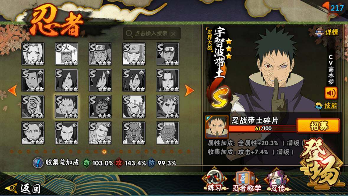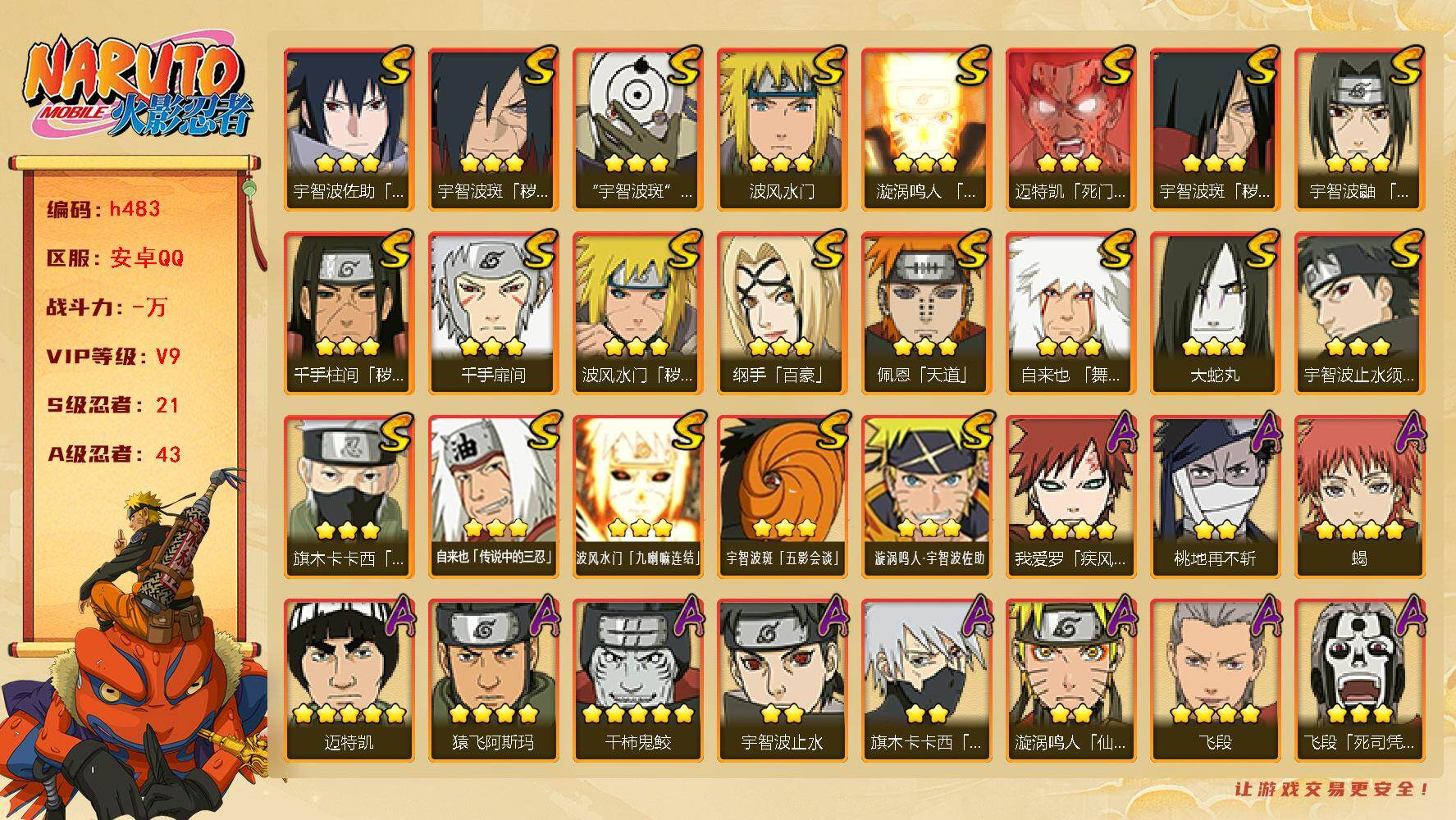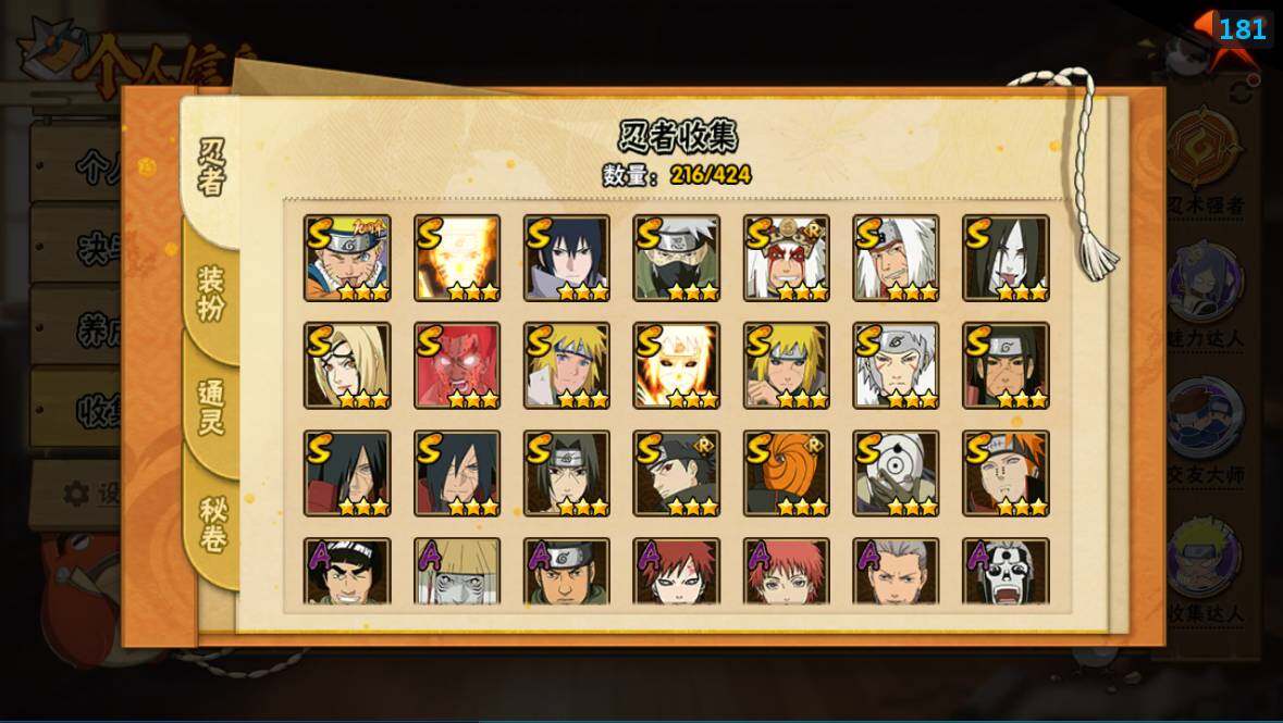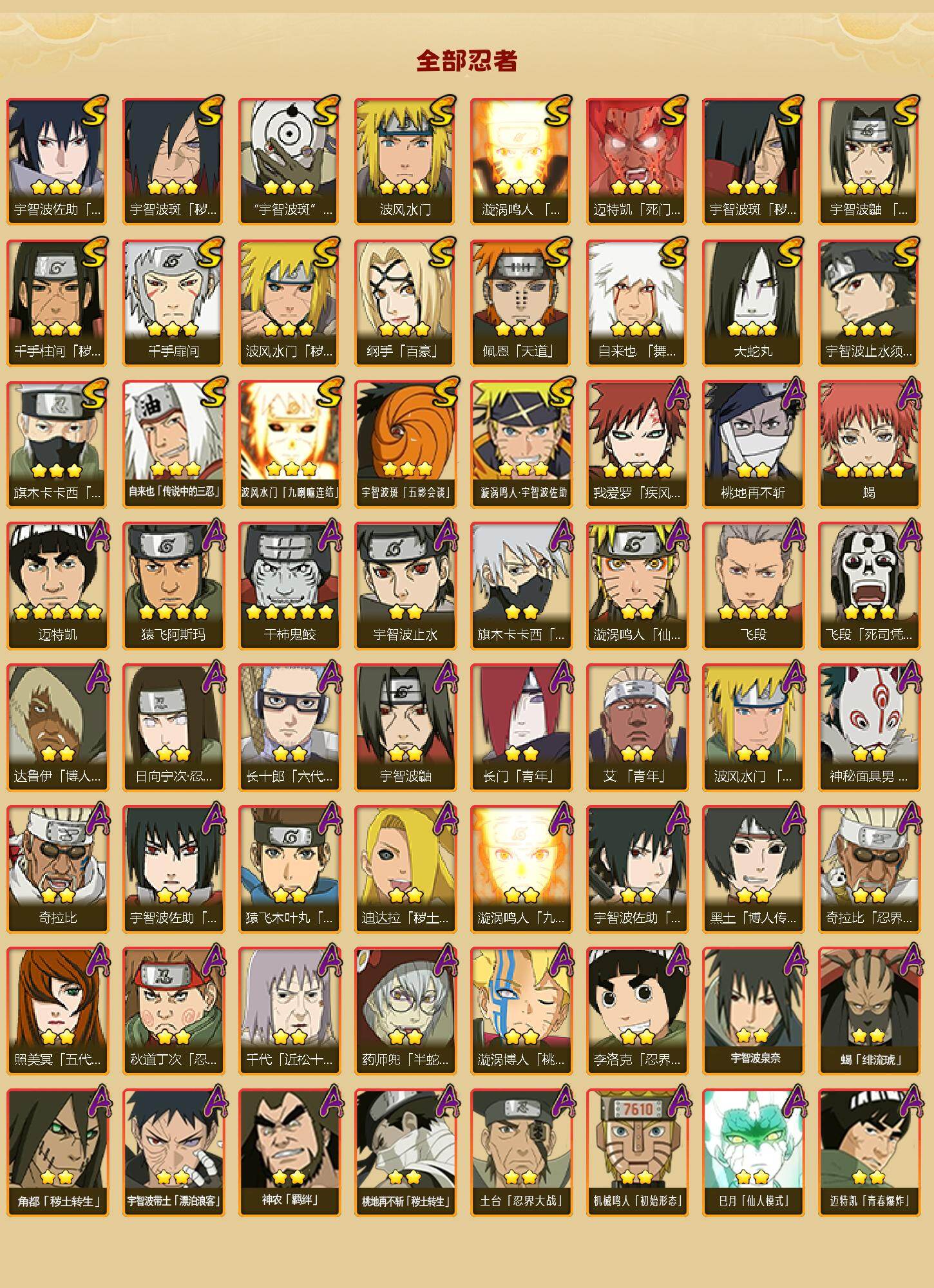 [16528776]21s级忍者数-43a级忍者数 【s级忍者】:波风水门「秽土转生」3星,千手柱间「秽土转生」3星,宇智波斑「秽土转生」3星,宇智波斑「秽土转生·解」3星,宇智波鼬「须佐能乎」3星,宇智波止水「须佐能乎」3星,旗木卡卡西「须佐能乎」3星,自来也「舞之豪杰」3星,大蛇丸3星,自来也「传说中的三忍」3星,纲手「百豪」3星,千手扉间3星,波风水门3星,漩涡鸣人「九喇嘛连结」3星,迈特凯「死门」3星,佩恩「天道」3星,宇智波佐助「永恒万花筒」3星,宇智波斑 「白面具」3星宇智波斑「白面具」,波风水门「九喇嘛连结」3星,宇智波斑「五影会谈」3星,漩涡鸣人·宇智波佐助3星 【a级忍者】:艾「青年」2星,长门「青年」2星,波风水门「青年」2星,达鲁伊「博人传」2星,迪达拉「秽土转生」2星,奇拉比2星,奇拉比「忍界大战」2星,飞段4星,飞段「死司凭血」3星,干柿鬼鲛5星,漩涡博人「桃式显现」2星,漩涡鸣人「仙人模式」2星,漩涡鸣人「九尾查克拉」2星,机械鸣人「初始形态」2星,迈特凯5星,旗木卡卡西「万花筒写轮眼」2星,桃地再不斩2星,桃地再不斩「秽土转生」2星,我爱罗「疾风传」4星,蝎4星,蝎「绯流琥」2星,角都「秽土转生」2星,猿飞阿斯玛4星,宇智波止水2星,宇智波鼬2星,宇智波佐助「须佐能乎」2星,宇智波佐助「万花筒写轮眼」2星,药师兜「半蛇斗篷」2星,照美冥「五代目水影」2星,日向宁次「忍界大战」2星,宇智波带土「漂泊浪客」2星,长十郎「六代目水影」2星,神秘面具男「忍者之路」2星,李洛克「忍界大战」2星,猿飞木叶丸「博人传」2星,黑土「博人传」2星,秋道丁次「忍界大战」2星,千代「近松十人卫」2星,神农「羁绊」2星,土台「忍界大战」2星,宇智波泉奈2星,巳月「仙人模式」2星,迈特凯「青春爆炸」2星