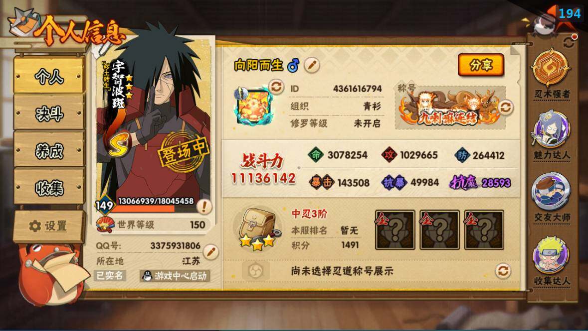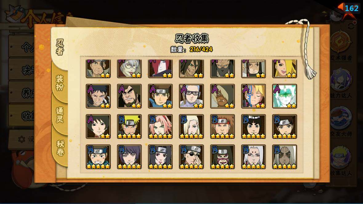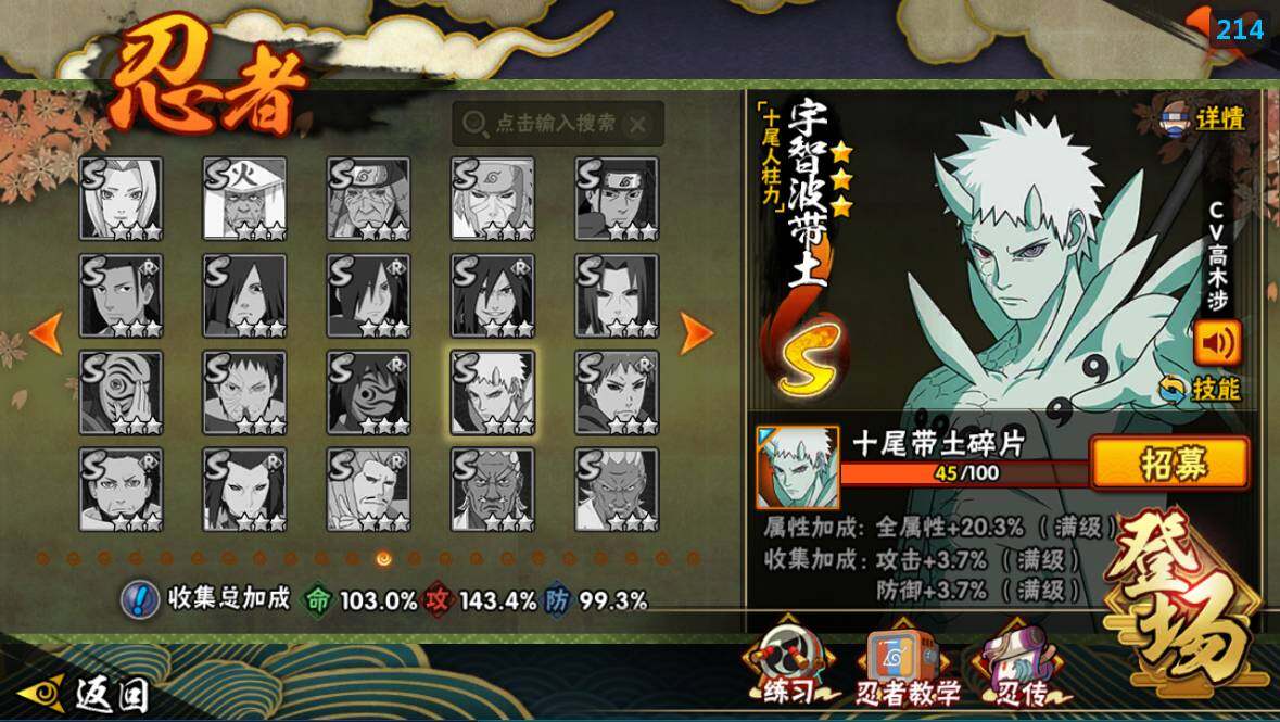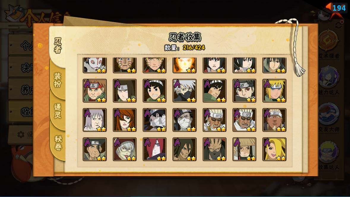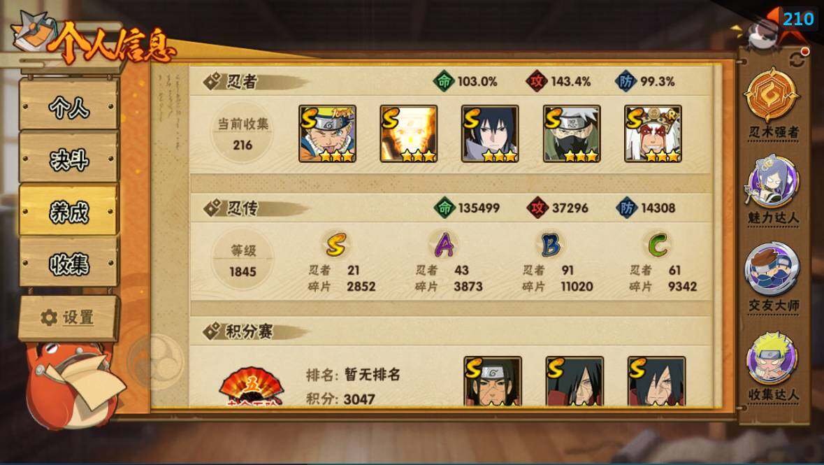 [16528776]21s级忍者数-43a级忍者数 【s级忍者】:波风水门「秽土转生」3星,千手柱间「秽土转生」3星,宇智波斑「秽土转生」3星,宇智波斑「秽土转生·解」3星,宇智波鼬「须佐能乎」3星,宇智波止水「须佐能乎」3星,旗木卡卡西「须佐能乎」3星,自来也「舞之豪杰」3星,大蛇丸3星,自来也「传说中的三忍」3星,纲手「百豪」3星,千手扉间3星,波风水门3星,漩涡鸣人「九喇嘛连结」3星,迈特凯「死门」3星,佩恩「天道」3星,宇智波佐助「永恒万花筒」3星,宇智波斑 「白面具」3星宇智波斑「白面具」,波风水门「九喇嘛连结」3星,宇智波斑「五影会谈」3星,漩涡鸣人·宇智波佐助3星 【a级忍者】:艾「青年」2星,长门「青年」2星,波风水门「青年」2星,达鲁伊「博人传」2星,迪达拉「秽土转生」2星,奇拉比2星,奇拉比「忍界大战」2星,飞段4星,飞段「死司凭血」3星,干柿鬼鲛5星,漩涡博人「桃式显现」2星,漩涡鸣人「仙人模式」2星,漩涡鸣人「九尾查克拉」2星,机械鸣人「初始形态」2星,迈特凯5星,旗木卡卡西「万花筒写轮眼」2星,桃地再不斩2星,桃地再不斩「秽土转生」2星,我爱罗「疾风传」4星,蝎4星,蝎「绯流琥」2星,角都「秽土转生」2星,猿飞阿斯玛4星,宇智波止水2星,宇智波鼬2星,宇智波佐助「须佐能乎」2星,宇智波佐助「万花筒写轮眼」2星,药师兜「半蛇斗篷」2星,照美冥「五代目水影」2星,日向宁次「忍界大战」2星,宇智波带土「漂泊浪客」2星,长十郎「六代目水影」2星,神秘面具男「忍者之路」2星,李洛克「忍界大战」2星,猿飞木叶丸「博人传」2星,黑土「博人传」2星,秋道丁次「忍界大战」2星,千代「近松十人卫」2星,神农「羁绊」2星,土台「忍界大战」2星,宇智波泉奈2星,巳月「仙人模式」2星,迈特凯「青春爆炸」2星