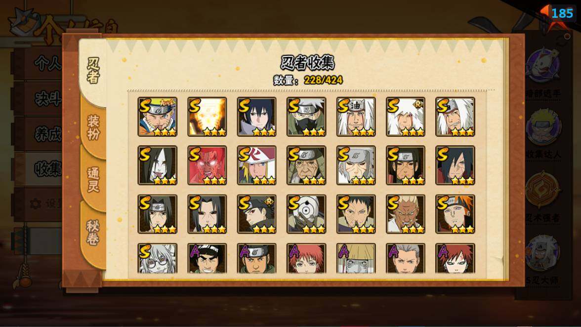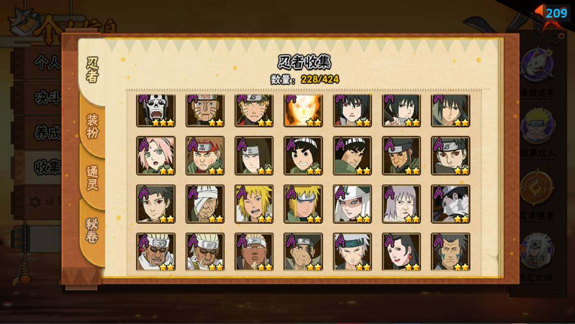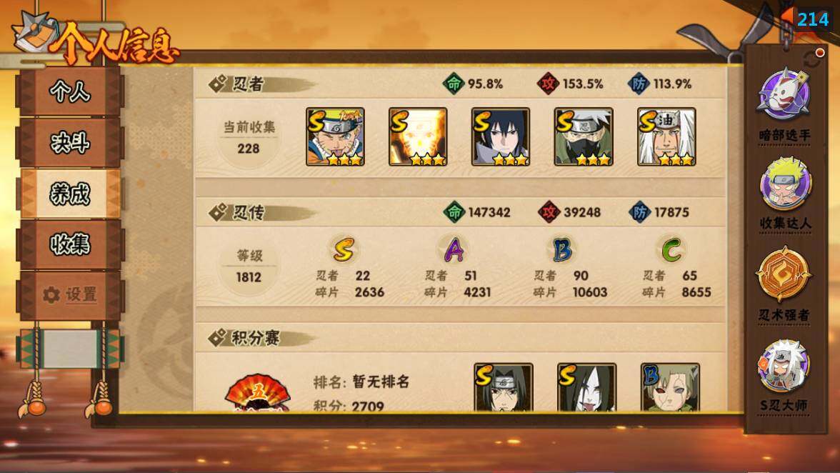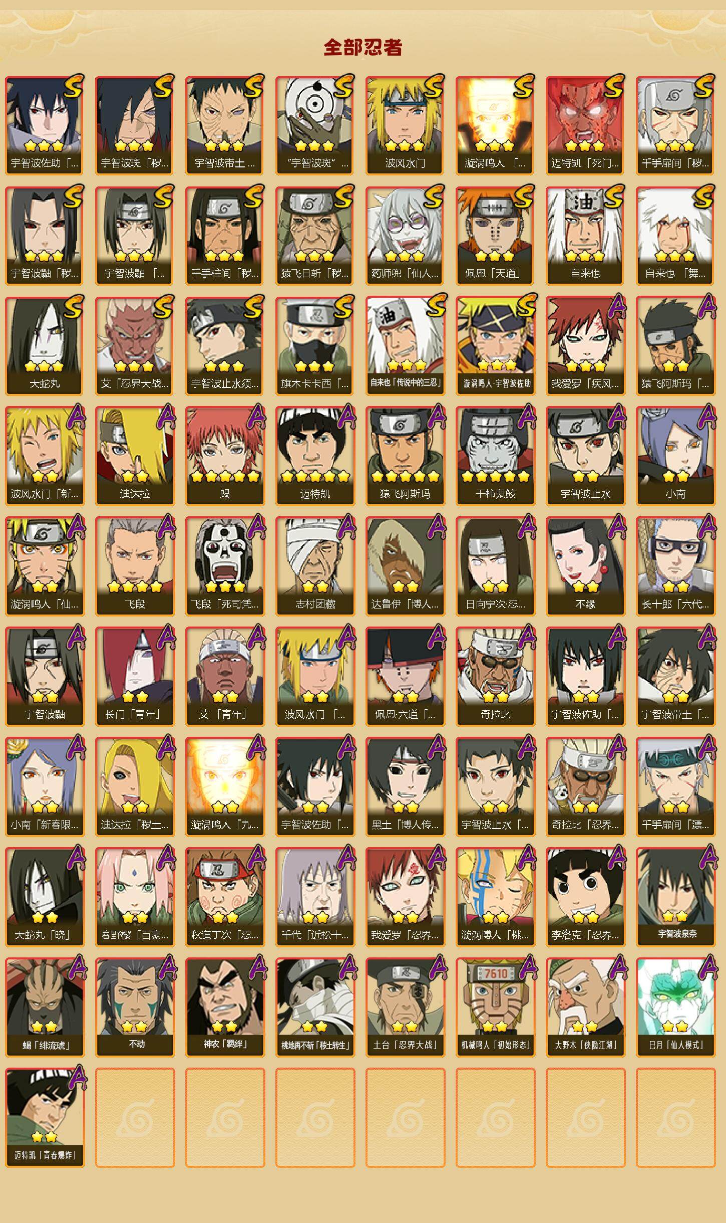 [16529274]22s级忍者数-51a级忍者数 【s级忍者】:猿飞日斩「秽土转生」3星,千手扉间「秽土转生」3星,千手柱间「秽土转生」3星,宇智波鼬「秽土转生」3星,宇智波斑「秽土转生·解」3星,宇智波带土「忍界大战」3星,艾「忍界大战」3星,宇智波鼬「须佐能乎」3星,宇智波止水「须佐能乎」3星,旗木卡卡西「须佐能乎」3星,自来也3星,自来也「舞之豪杰」3星,大蛇丸3星,自来也「传说中的三忍」3星,波风水门3星,药师兜「仙人模式」3星,漩涡鸣人「九喇嘛连结」3星,迈特凯「死门」3星,佩恩「天道」3星,宇智波佐助「永恒万花筒」3星,宇智波斑 「白面具」3星宇智波斑「白面具」,漩涡鸣人·宇智波佐助3星 【a级忍者】:艾「青年」2星,长门「青年」2星,波风水门「青年」2星,波风水门「新春限定」2星,达鲁伊「博人传」2星,迪达拉2星,迪达拉「秽土转生」2星,大蛇丸「晓」2星,奇拉比2星,奇拉比「忍界大战」2星,飞段4星,飞段「死司凭血」3星,干柿鬼鲛5星,漩涡博人「桃式显现」2星,漩涡鸣人「仙人模式」2星,漩涡鸣人「九尾查克拉」2星,机械鸣人「初始形态」2星,迈特凯5星,桃地再不斩「秽土转生」2星,我爱罗「疾风传」3星,我爱罗「忍界大战」2星,蝎5星,蝎「绯流琥」2星,小南2星,小南「新春限定」2星,猿飞阿斯玛5星,猿飞阿斯玛「秽土转生」2星,宇智波止水2星,宇智波止水「新春限定」2星,宇智波鼬2星,宇智波佐助「须佐能乎」2星,宇智波佐助「万花筒写轮眼」2星,日向宁次「忍界大战」2星,宇智波带土「暴怒」2星,长十郎「六代目水影」2星,佩恩·六道「漂泊浪客」2星,李洛克「忍界大战」2星,黑土「博人传」2星,千手扉间「漂泊武士」2星,春野樱「百豪」2星,秋道丁次「忍界大战」2星,千代「近松十人卫」2星,神农「羁绊」2星,土台「忍界大战」2星,志村团藏2星,不缘2星,宇智波泉奈2星,不动2星,大野木「侠隐江湖」2星,巳月「仙人模式」2星,迈特凯「青春爆炸」2星
