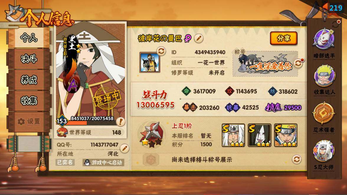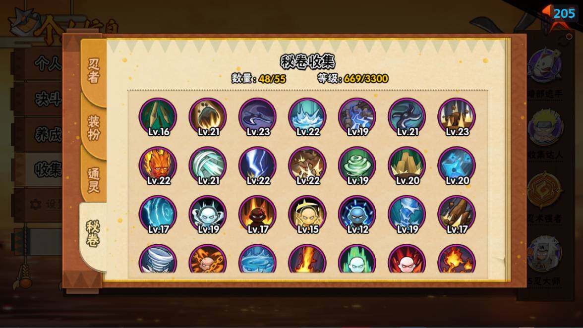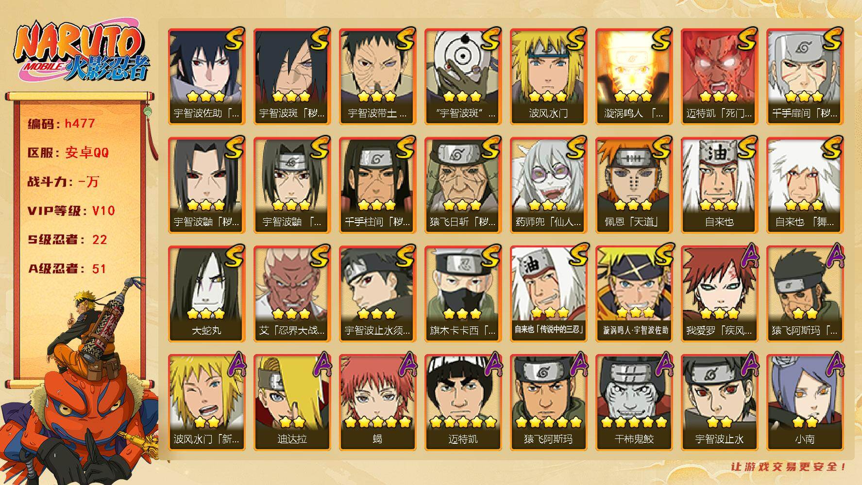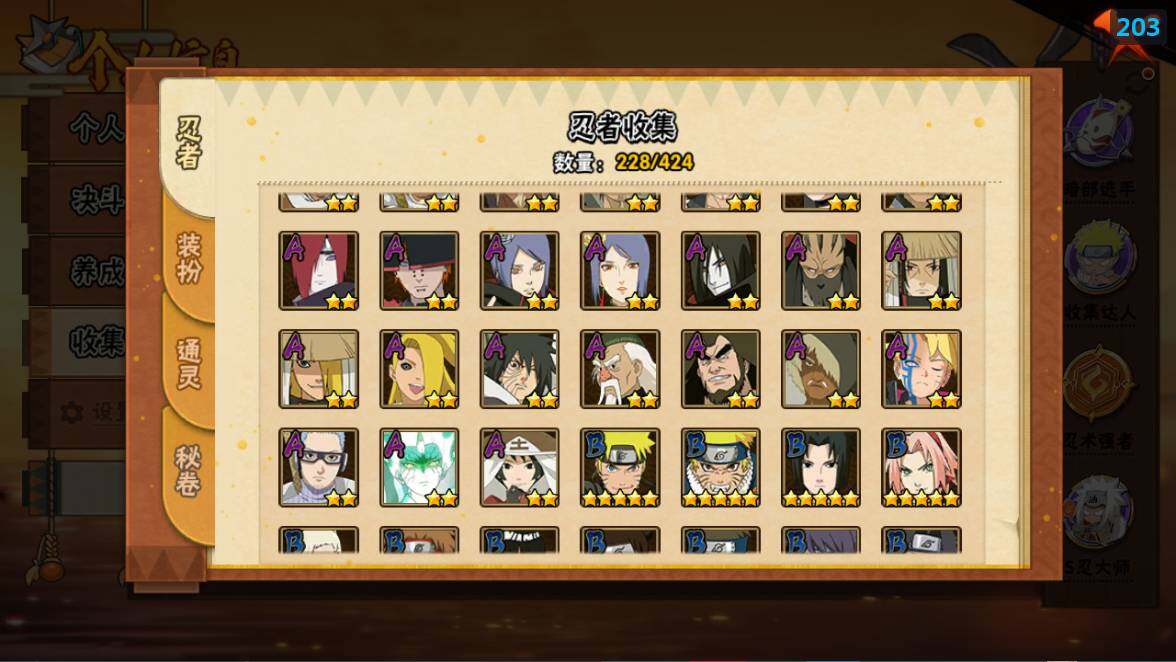 [16529274]22s级忍者数-51a级忍者数 【s级忍者】:猿飞日斩「秽土转生」3星,千手扉间「秽土转生」3星,千手柱间「秽土转生」3星,宇智波鼬「秽土转生」3星,宇智波斑「秽土转生·解」3星,宇智波带土「忍界大战」3星,艾「忍界大战」3星,宇智波鼬「须佐能乎」3星,宇智波止水「须佐能乎」3星,旗木卡卡西「须佐能乎」3星,自来也3星,自来也「舞之豪杰」3星,大蛇丸3星,自来也「传说中的三忍」3星,波风水门3星,药师兜「仙人模式」3星,漩涡鸣人「九喇嘛连结」3星,迈特凯「死门」3星,佩恩「天道」3星,宇智波佐助「永恒万花筒」3星,宇智波斑 「白面具」3星宇智波斑「白面具」,漩涡鸣人·宇智波佐助3星 【a级忍者】:艾「青年」2星,长门「青年」2星,波风水门「青年」2星,波风水门「新春限定」2星,达鲁伊「博人传」2星,迪达拉2星,迪达拉「秽土转生」2星,大蛇丸「晓」2星,奇拉比2星,奇拉比「忍界大战」2星,飞段4星,飞段「死司凭血」3星,干柿鬼鲛5星,漩涡博人「桃式显现」2星,漩涡鸣人「仙人模式」2星,漩涡鸣人「九尾查克拉」2星,机械鸣人「初始形态」2星,迈特凯5星,桃地再不斩「秽土转生」2星,我爱罗「疾风传」3星,我爱罗「忍界大战」2星,蝎5星,蝎「绯流琥」2星,小南2星,小南「新春限定」2星,猿飞阿斯玛5星,猿飞阿斯玛「秽土转生」2星,宇智波止水2星,宇智波止水「新春限定」2星,宇智波鼬2星,宇智波佐助「须佐能乎」2星,宇智波佐助「万花筒写轮眼」2星,日向宁次「忍界大战」2星,宇智波带土「暴怒」2星,长十郎「六代目水影」2星,佩恩·六道「漂泊浪客」2星,李洛克「忍界大战」2星,黑土「博人传」2星,千手扉间「漂泊武士」2星,春野樱「百豪」2星,秋道丁次「忍界大战」2星,千代「近松十人卫」2星,神农「羁绊」2星,土台「忍界大战」2星,志村团藏2星,不缘2星,宇智波泉奈2星,不动2星,大野木「侠隐江湖」2星,巳月「仙人模式」2星,迈特凯「青春爆炸」2星