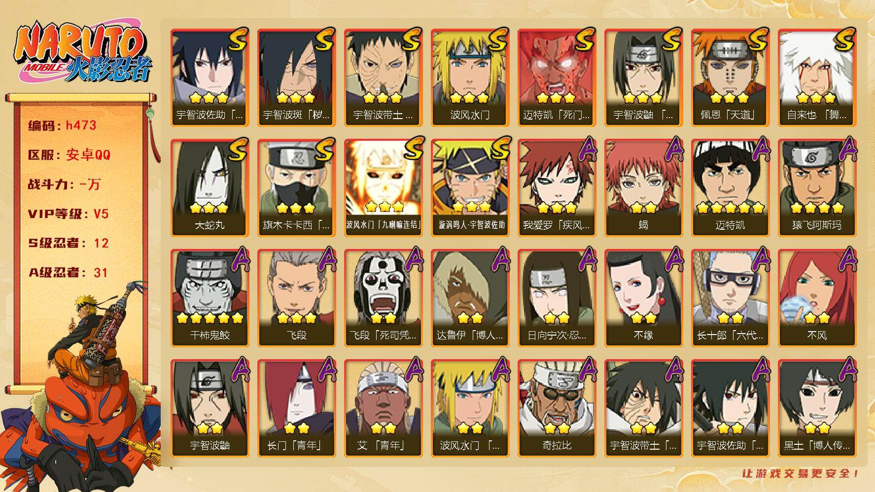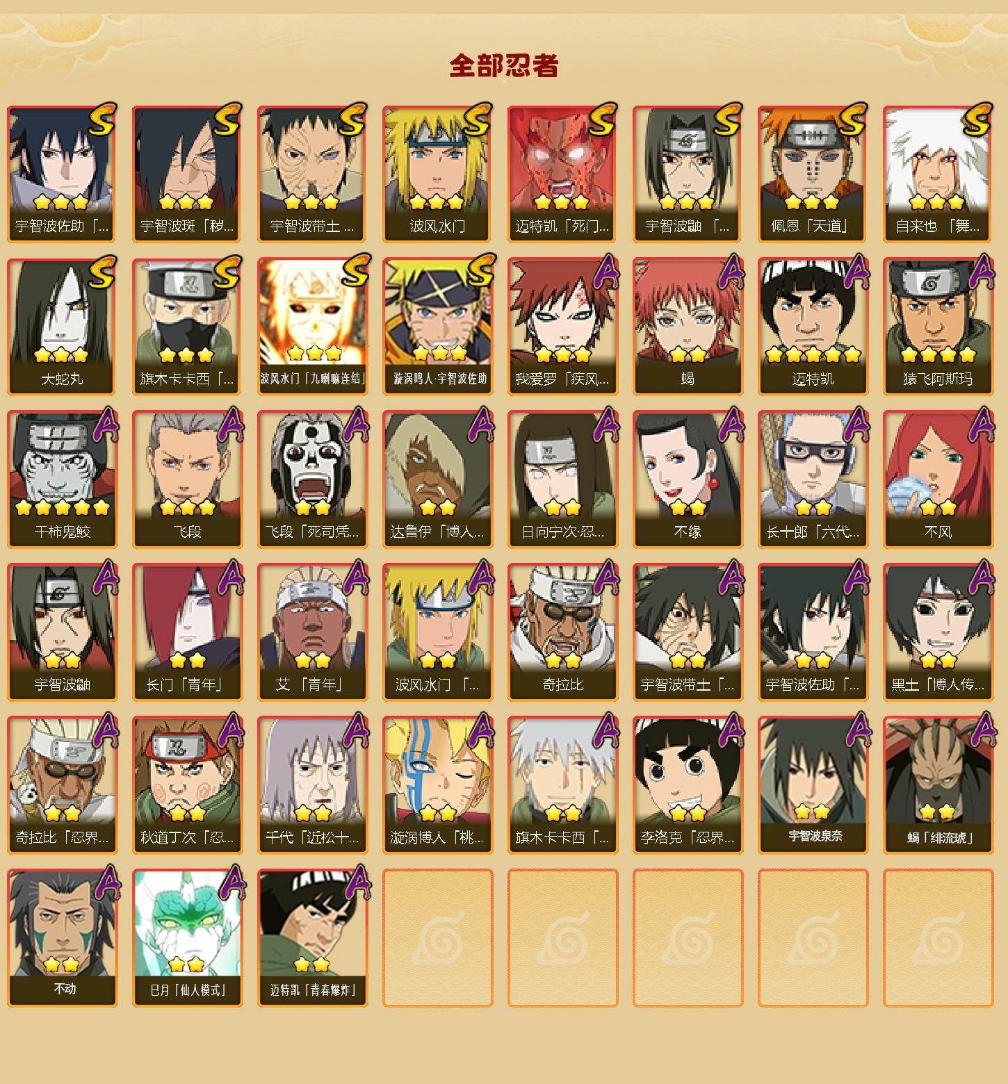 [16529816]12s级忍者数-31a级忍者数 【s级忍者】:宇智波斑「秽土转生·解」3星,宇智波带土「忍界大战」3星,宇智波鼬「须佐能乎」3星,旗木卡卡西「须佐能乎」3星,自来也「舞之豪杰」3星,大蛇丸3星,波风水门3星,迈特凯「死门」3星,佩恩「天道」3星,宇智波佐助「永恒万花筒」3星,波风水门「九喇嘛连结」3星,漩涡鸣人·宇智波佐助3星 【a级忍者】:艾「青年」2星,长门「青年」2星,波风水门「青年」2星,达鲁伊「博人传」2星,奇拉比2星,奇拉比「忍界大战」2星,飞段3星,飞段「死司凭血」2星,干柿鬼鲛5星,漩涡博人「桃式显现」2星,迈特凯5星,旗木卡卡西「幻之真容」2星,我爱罗「疾风传」3星,蝎2星,蝎「绯流琥」2星,猿飞阿斯玛4星,宇智波鼬2星,宇智波佐助「须佐能乎」2星,日向宁次「忍界大战」2星,宇智波带土「暴怒」2星,长十郎「六代目水影」2星,李洛克「忍界大战」2星,黑土「博人传」2星,秋道丁次「忍界大战」2星,千代「近松十人卫」2星,不缘2星,不风2星,宇智波泉奈2星,不动2星,巳月「仙人模式」2星,迈特凯「青春爆炸」2星