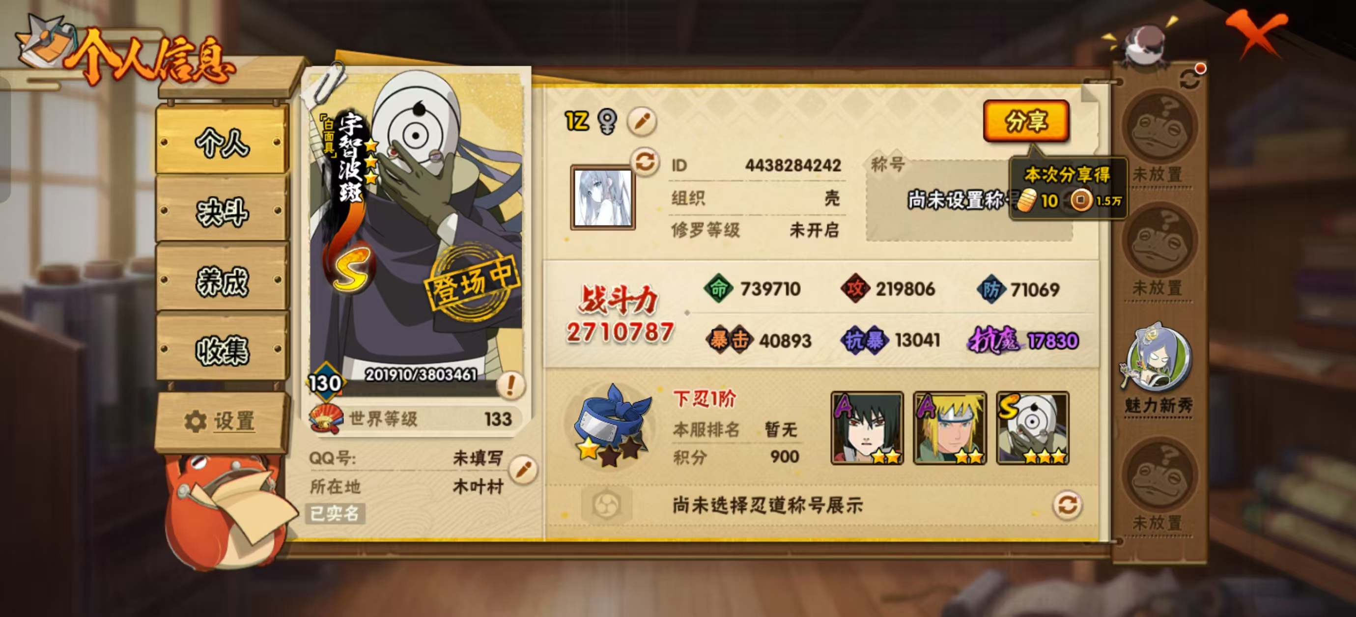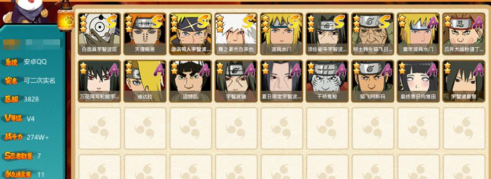 [16534559]hy449战斗力:274w;段位:中忍1阶;本服排名:4486;战区排名:未上榜;vip4级;s忍7个;a忍11个;通灵兽11个;s忍:白面具宇智波斑天道佩恩漩涡鸣人宇智波佐助舞之豪杰自来也波风水门须佐能乎宇智波鼬秽土转生猿飞日斩;a忍:青年波风水门忍界大战秋道丁次万花筒写轮眼宇智波佐助迪达拉迈特凯宇智波鼬夏日限定宇智波鼬干柿鬼鲛猿飞阿斯玛最终章日向雏田宇智波泉奈;通灵兽:忍犬蓝蛇蛤蟆吉忍龟镰鼬砂之守鹤猿魔山椒鱼蜃蛤蟆仙人鲛鲨;时装:百战宇智波鼬须佐能乎百战佩恩天道百战波风水门蜀面豪杰舞之豪杰自来也太极灵韵日向花火武当宗师熊猫少女天天峨眉宗师血雾怪人干柿鬼鲛绯樱绽放春野樱百豪;详情看图【3828】【安卓qq】【可二次实名】【官方截图】