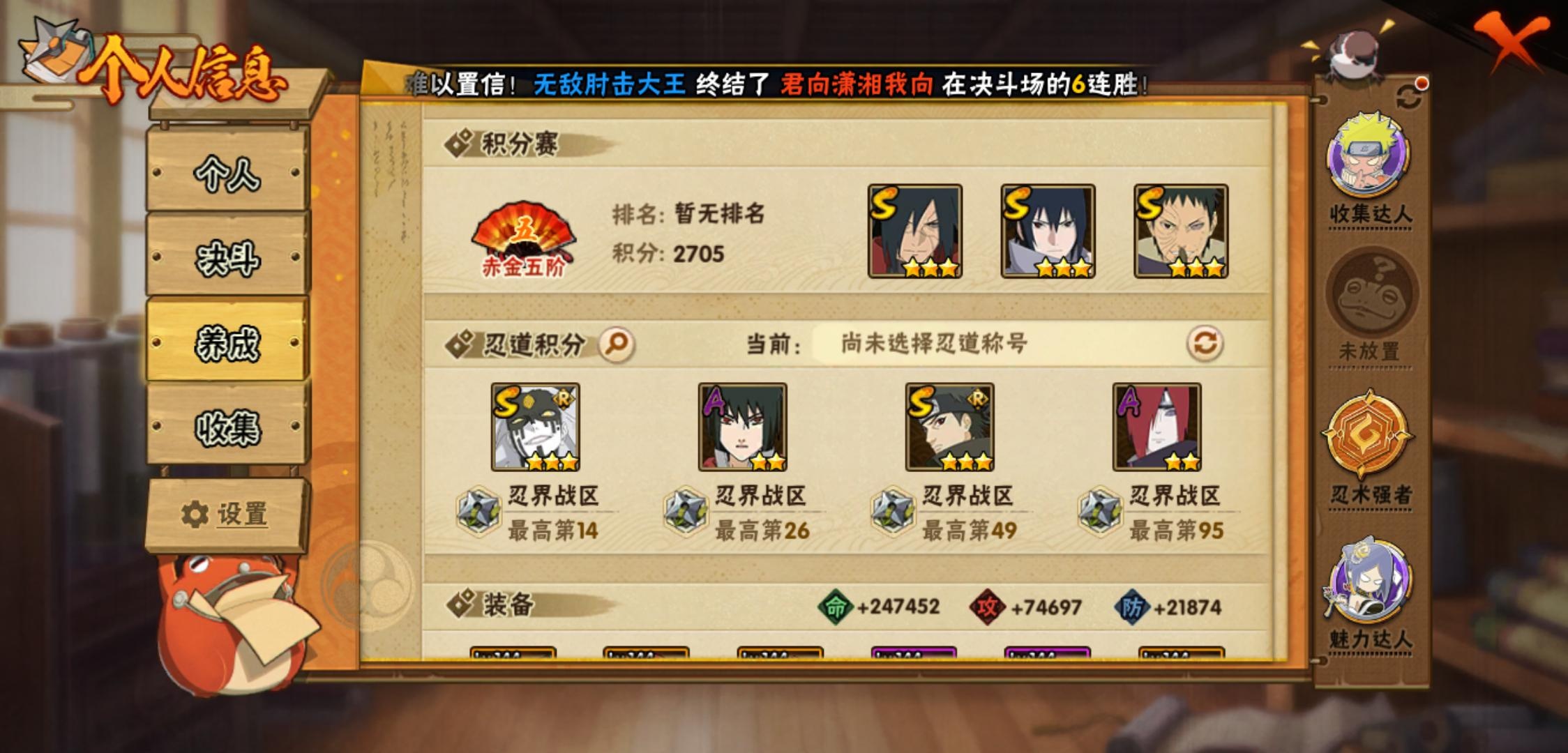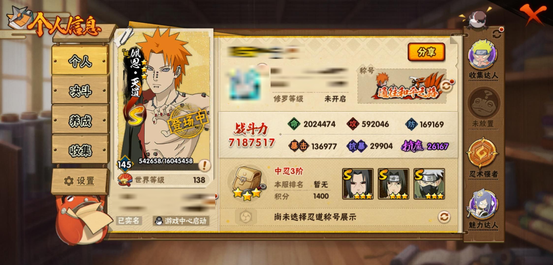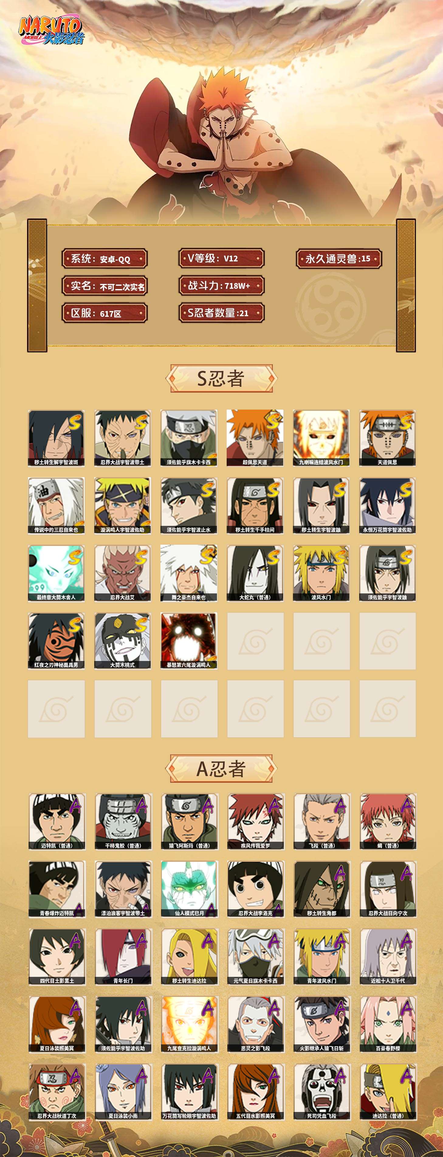 【火影忍者】【lyhy11425】战斗力:718w;段位:中忍3阶;本服排名:716;vip:v12级;s忍:21个;a忍:41个;通灵兽:15个,s忍:秽土转生解宇智波斑|忍界大战宇智波带土|须佐能乎旗木卡卡西|超佩恩天道|九喇嘛连结波风水门|天道佩恩|传说中的三忍自来也|漩涡鸣人宇智波佐助|须佐能乎宇智波止水|秽土转生千手柱间|秽土转生宇智波鼬|永恒万花筒宇智波佐助|最终章大筒木舍人|忍界大战艾|舞之豪杰自来也|大蛇丸(普通)|波风水门|须佐能乎宇智波鼬|红夜之刃神秘面具男|大筒木桃式|暴怒第六尾漩涡鸣人__a忍:青春爆炸迈特凯|漂泊浪客宇智波带土|仙人模式巳月|忍界大战李洛克|秽土转生角都|忍界大战日向宁次|四代目土影黑土|青年长门|秽土转生迪达拉|元气夏日旗木卡卡西|青年波风水门|近松十人卫千代|夏日泳装照美冥|须佐能乎宇智波佐助|九尾查克拉漩涡鸣人|恶灵之影飞段|火影继承人猿飞日斩|百豪春野樱|忍界大战秋道丁次|夏日泳装小南|万花筒写轮眼宇智波佐助|五代目水影照美冥|死司凭血飞段|疾风传我爱罗 3星|迪达拉(普通)|飞段(普通) 3星|迈特凯(普通) 5星|夏日限定宇智波鼬|干柿鬼鲛(普通) 5星|秽土转生桃地再不斩|蝎(普通) 3星|绯流琥蝎|猿飞阿斯玛(普通) 5星|桃式显现漩涡博人|最终章日向雏田|六代目水影长十郎|不缘|宇智波泉奈|羁绊神农|夏日限定黑土|初始形态机械鸣人__通灵兽:忍犬(普通)|蓝蛇|蛤蟆吉|忍龟|镰鼬|猿魔|山椒鱼|蜃|蛤蟆仙人|鲛鲨|砂之守鹤|蛤蟆健|蛞蝓(普通)|乌鸦(普通)|蛤蟆龙