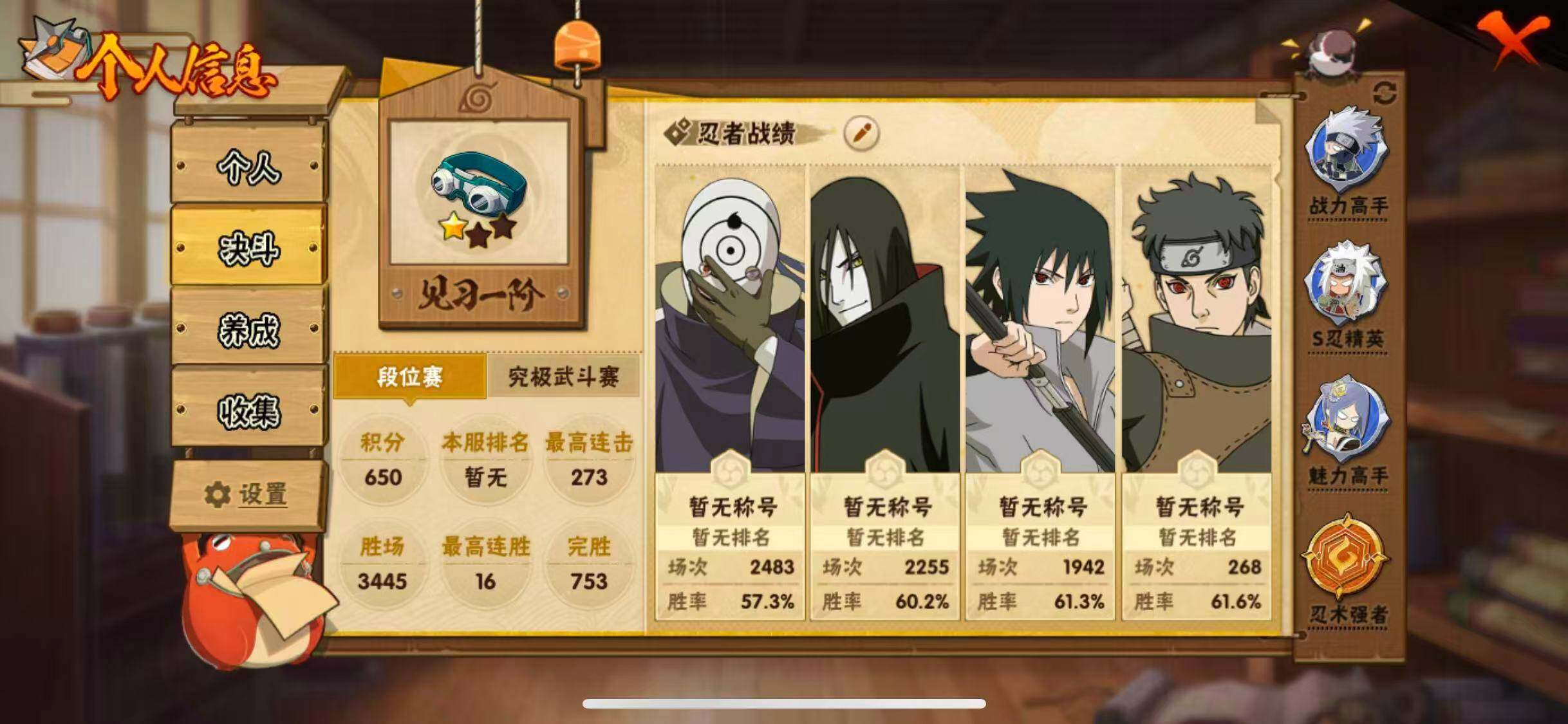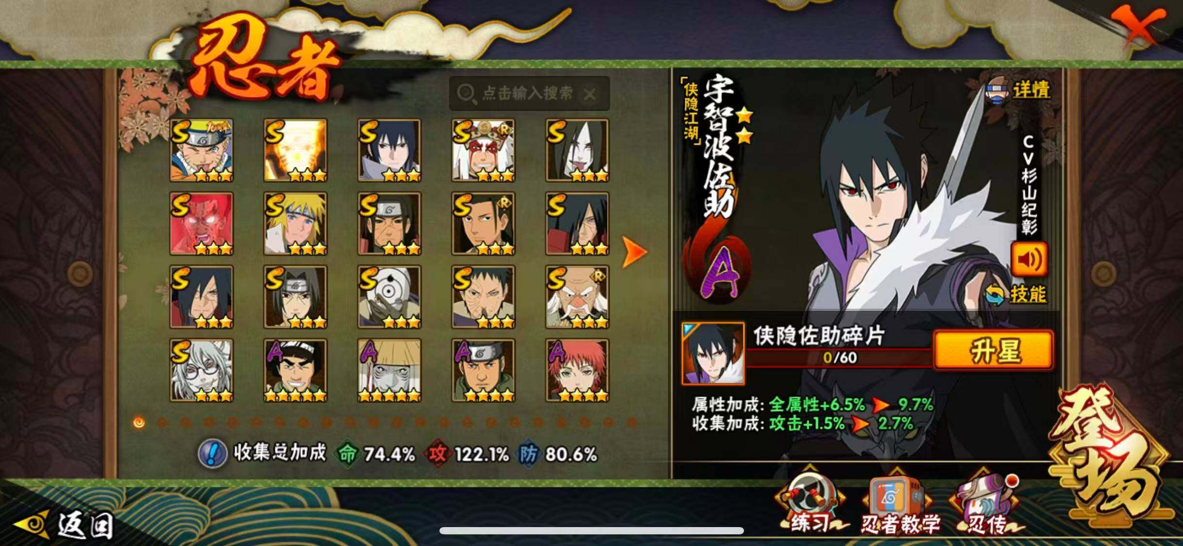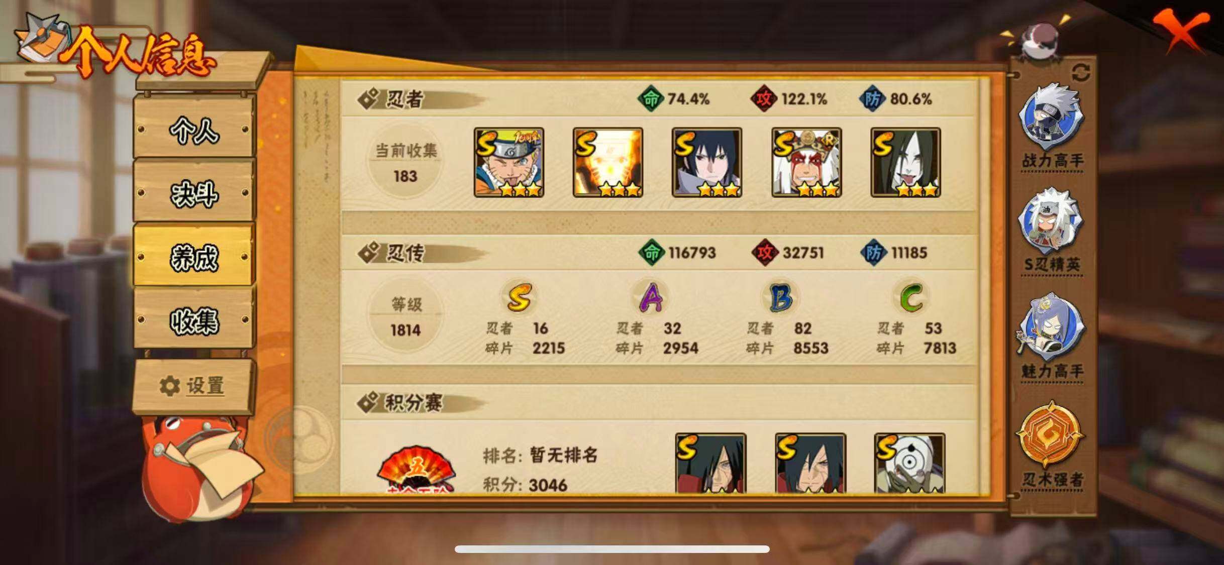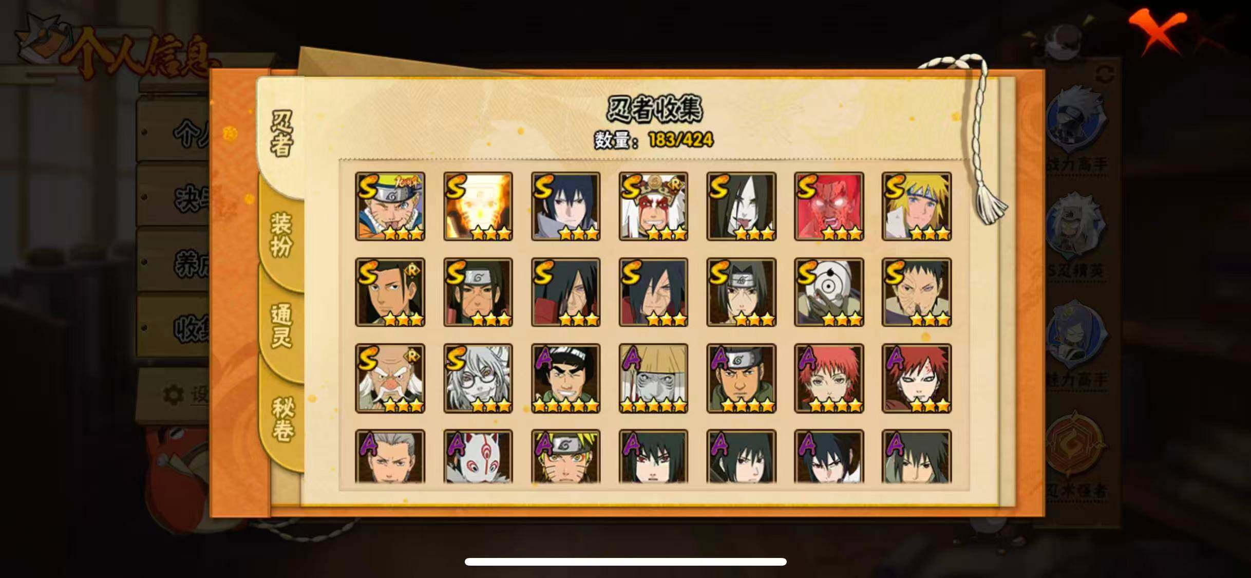 【hysa1114】v10/战力1120w/s忍16/a忍32/通灵兽17/3星宇智波斑「秽土转生」/2星日向宁次「忍界大战」/2星达鲁伊「博人传」/2星飞段「死司凭血」/2星宇智波鼬/2星宇智波止水/3星宇智波佐助「永恒万花筒」/2星长门「青年」/3星宇智波带土「忍界大战」/3星飞段/2星宇智波佐助「侠隐江湖」/3星漩涡鸣人·宇智波佐助/4星蝎/2星照美冥「五代目水影」/3星波风水门/3星漩涡鸣人「九喇嘛连结」/2星秋道丁次「忍界大战」/5星迈特凯/2星漩涡博人「桃式显现」/2星奇拉比「忍界大战」/2星旗木卡卡西「万花筒写轮眼」/3星千手柱间「木叶创立」/3星千手柱间「秽土转生」/3星我爱罗「疾风传」/2星神秘面具男「忍者之路」/3星药师兜「仙人模式」/2星长十郎「六代目水影」/2星波风水门「青年」/4星猿飞阿斯玛/3星自来也「舞之豪杰」/3星宇智波斑「白面具」/3星迈特凯「死门」/2星黑土「博人传」/2星奇拉比/2星漩涡鸣人「仙人模式」/2星宇智波佐助「万花筒写轮眼」/2星宇智波泉奈/2星小南/3星大蛇丸/3星宇智波斑「秽土转生·解」/2星艾「青年」/3星大野木「忍界大战」/2星宇智波佐助「须佐能乎」/2星猿飞木叶丸「博人传」/5星干柿鬼鲛/2星千代「近松十人卫」/2星大蛇丸「晓」/3星宇智波鼬「须佐能乎」