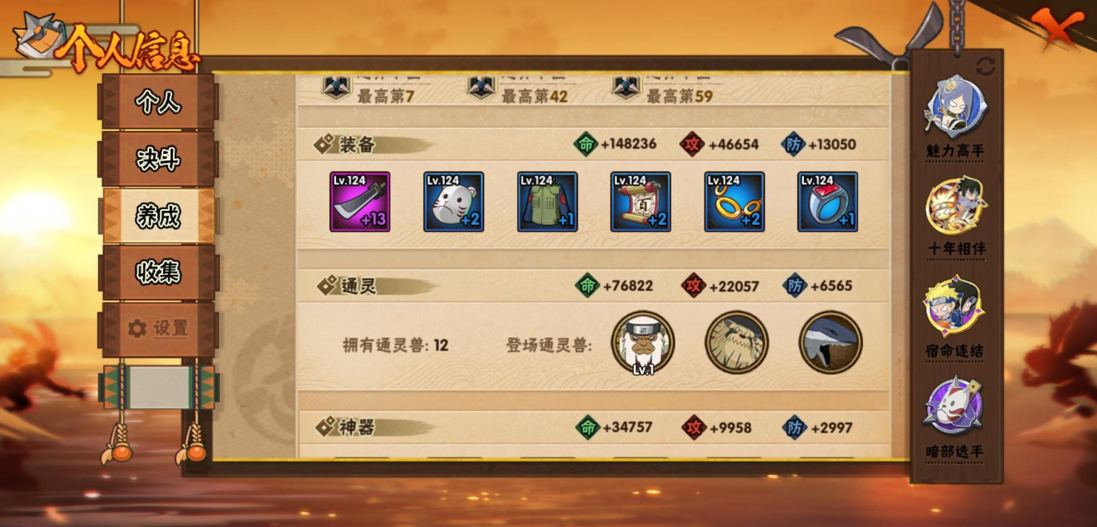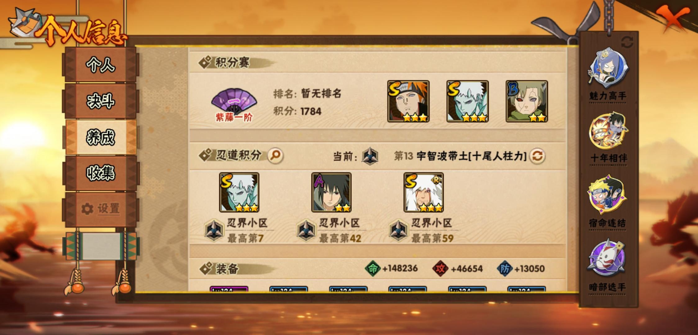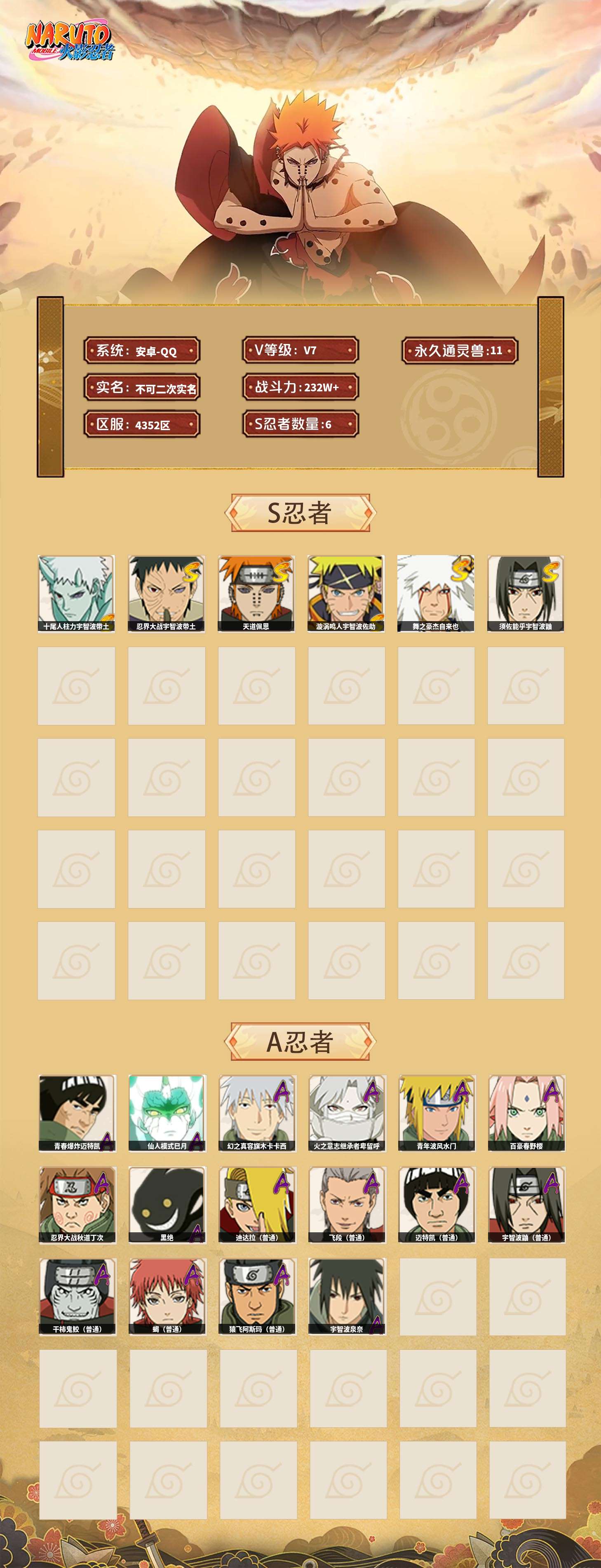 【火影忍者】【lyhy11420】战斗力:232w;段位:中忍3阶;本服排名:1866;vip:v7级;s忍:6个;a忍:16个;通灵兽:11个,s忍:十尾人柱力宇智波带土|忍界大战宇智波带土|天道佩恩|漩涡鸣人宇智波佐助|舞之豪杰自来也|须佐能乎宇智波鼬__a忍:青春爆炸迈特凯|仙人模式巳月|幻之真容旗木卡卡西|火之意志继承者卑留呼|青年波风水门|百豪春野樱|忍界大战秋道丁次|黑绝|迪达拉(普通)|飞段(普通)|迈特凯(普通)|宇智波鼬(普通)|干柿鬼鲛(普通)|蝎(普通)|猿飞阿斯玛(普通)|宇智波泉奈__通灵兽:忍犬(普通)|蓝蛇|蛤蟆吉|忍龟|镰鼬|猿魔|山椒鱼|蜃|蛤蟆仙人|鲛鲨|砂之守鹤