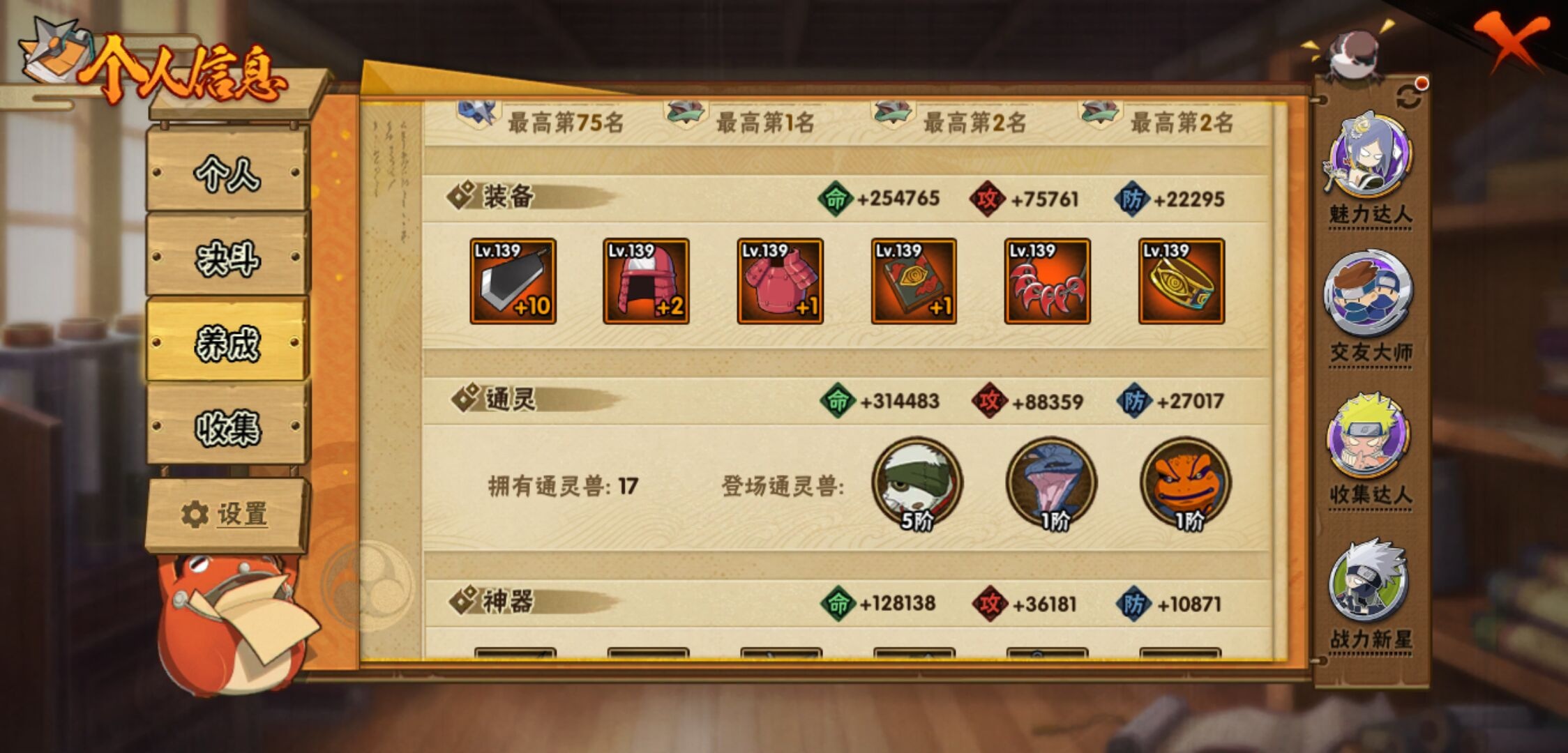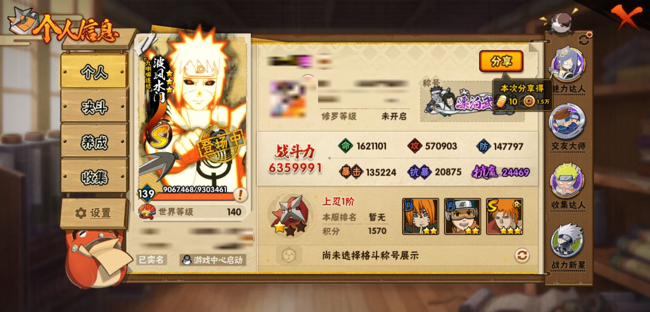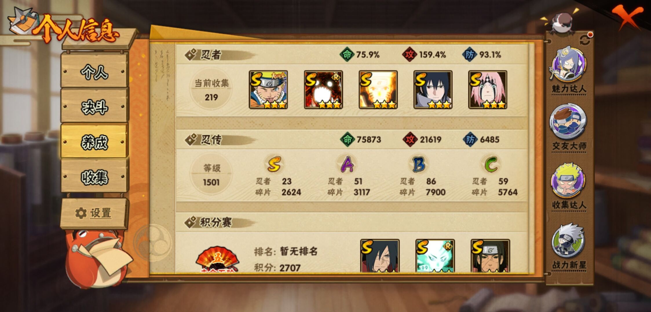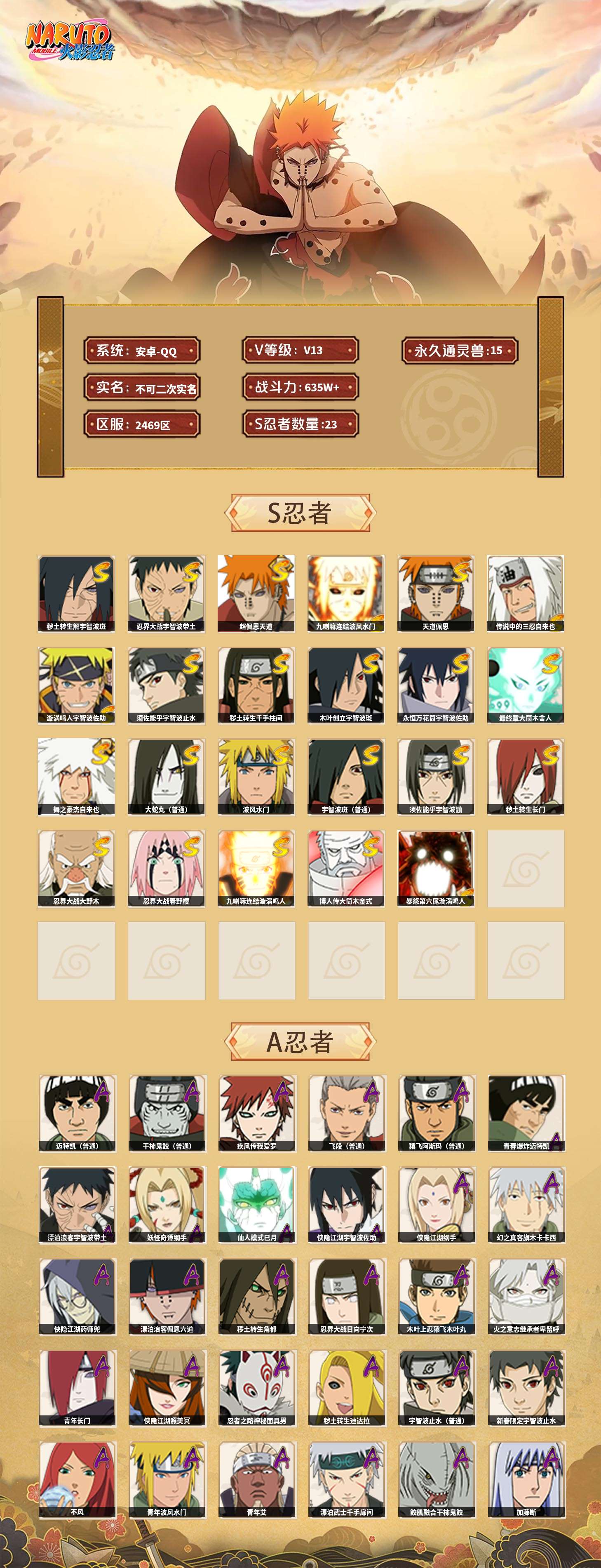 【火影忍者】【lyhy11443】战斗力:635w;段位:上忍1阶;本服排名:920;vip:v13级;s忍:23个;a忍:51个;通灵兽:15个,s忍:秽土转生解宇智波斑|忍界大战宇智波带土|超佩恩天道|九喇嘛连结波风水门|天道佩恩|传说中的三忍自来也|漩涡鸣人宇智波佐助|须佐能乎宇智波止水|秽土转生千手柱间|木叶创立宇智波斑|永恒万花筒宇智波佐助|最终章大筒木舍人|舞之豪杰自来也|大蛇丸(普通)|波风水门|宇智波斑(普通)|须佐能乎宇智波鼬|秽土转生长门|忍界大战大野木|忍界大战春野樱|九喇嘛连结漩涡鸣人|博人传大筒木金式|暴怒第六尾漩涡鸣人__a忍:青春爆炸迈特凯|漂泊浪客宇智波带土|妖怪奇谭纲手|仙人模式巳月|侠隐江湖宇智波佐助|侠隐江湖纲手|幻之真容旗木卡卡西|侠隐江湖药师兜|漂泊浪客佩恩六道|秽土转生角都|忍界大战日向宁次|木叶上忍猿飞木叶丸|火之意志继承者卑留呼|青年长门|侠隐江湖照美冥|忍者之路神秘面具男|秽土转生迪达拉|宇智波止水(普通)|新春限定宇智波止水|不风|青年波风水门|青年艾|漂泊武士千手扉间|鲛肌融合干柿鬼鲛|加藤断|漂泊武士桃地再不斩|近松十人卫千代|晓创生角都|暴怒宇智波带土|地陆|忍界大战秋道丁次|疾风传咒印宇智波佐助|新春限定宇智波鼬|奇拉比(普通)|五代目水影照美冥|死司凭血飞段|疾风传我爱罗 3星|飞段(普通) 3星|迈特凯(普通) 4星|宇智波鼬(普通)|干柿鬼鲛(普通) 4星|秽土转生桃地再不斩|蝎(普通)|猿飞阿斯玛(普通) 3星|桃式显现漩涡博人|最终章日向雏田|六代目水影长十郎|新春限定大蛇丸|宇智波泉奈|羁绊神农|初始形态机械鸣人__通灵兽:忍犬(普通)|蓝蛇|蛤蟆吉|砂之守鹤|忍龟|镰鼬|猿魔|山椒鱼|蜃|蛤蟆仙人|鲛鲨|蛤蟆健|乌鸦(普通)|蛞蝓(普通)|蛤蟆龙