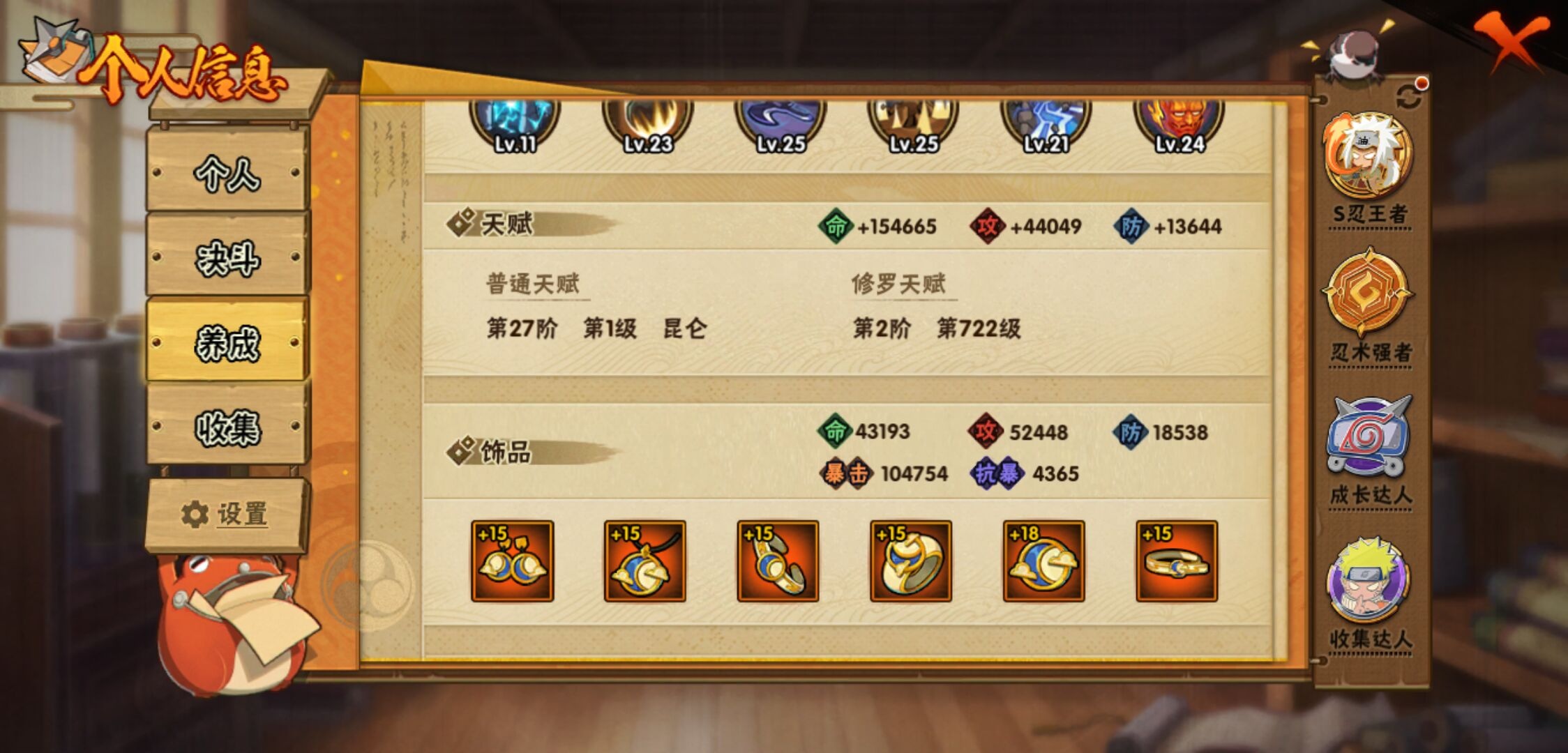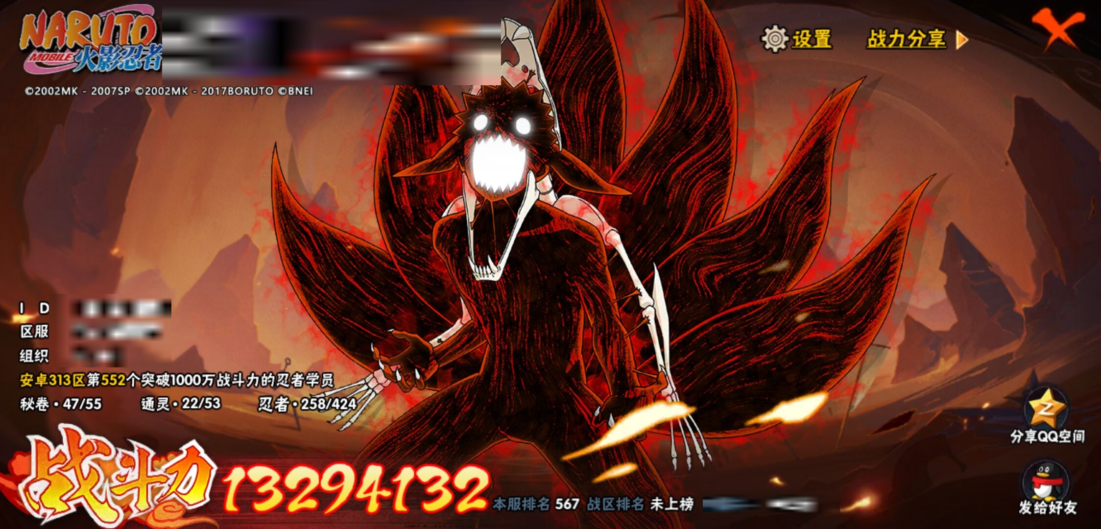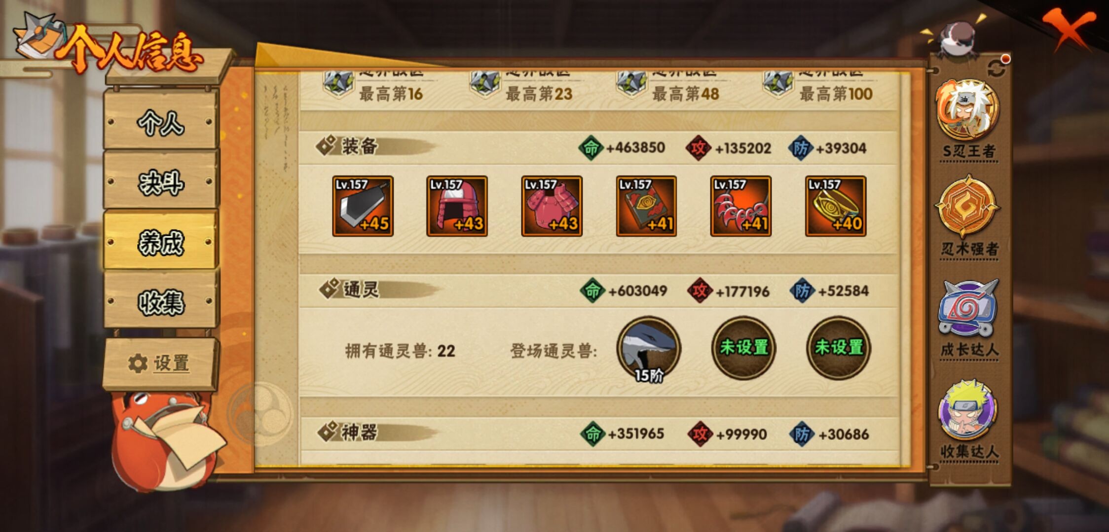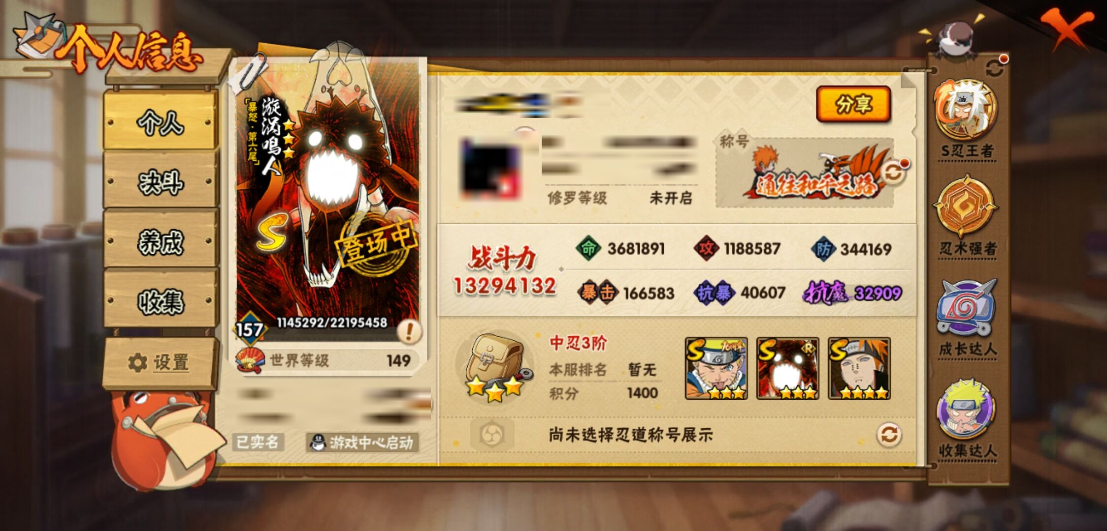 【火影忍者】【lyhy11419】战斗力:1329w;段位:中忍3阶;本服排名:567;vip:v10级;s忍:30个;a忍:56个;通灵兽:19个,s忍:秽土转生解宇智波斑|白面具宇智波斑|忍界大战宇智波带土|须佐能乎旗木卡卡西|超佩恩天道|九喇嘛连结波风水门|天道佩恩 4星|传说中的三忍自来也|漩涡鸣人宇智波佐助|秽土转生千手柱间|木叶创立宇智波斑|秽土转生宇智波鼬|永恒万花筒宇智波佐助|忍界大战艾|舞之豪杰自来也|大蛇丸(普通) 4星|波风水门|秽土转生波风水门|千手扉间(普通)|千手柱间(普通)|秽土转生宇智波斑|宇智波斑(普通)|须佐能乎宇智波鼬 4星|神秘面具男(普通)|死门迈特凯|忍界大战春野樱|九喇嘛连结漩涡鸣人|秽土转生猿飞日斩|自来也(普通)|暴怒第六尾漩涡鸣人__a忍:青春爆炸迈特凯|仙人模式巳月|幻之真容旗木卡卡西|忍界大战李洛克|忍界大战日向宁次|四代目土影黑土|木叶上忍猿飞木叶丸|青年长门|秽土转生迪达拉|宇智波止水(普通)|忍界大战奇拉比|青年波风水门 3星|青年艾|漂泊武士千手扉间|近松十人卫千代|晓创生角都|半蛇斗篷药师兜|须佐能乎宇智波佐助|九尾查克拉漩涡鸣人|晓大蛇丸|地陆|火影继承人猿飞日斩|百豪春野樱|忍界大战秋道丁次|忍界大战我爱罗|秽土转生猿飞阿斯玛|奇拉比(普通)|万花筒写轮眼宇智波佐助|五代目水影照美冥|五代目雷影达鲁伊|死司凭血飞段|角都(普通)|疾风传我爱罗 5星|迪达拉(普通) 3星|飞段(普通) 5星|小南(普通)|漂泊浪客小南|仙人模式漩涡鸣人|万花筒写轮眼旗木卡卡西|迈特凯(普通) 5星|宇智波鼬(普通)|夏日限定宇智波鼬|干柿鬼鲛(普通) 5星|桃地再不斩|秽土转生桃地再不斩|蝎(普通) 3星|绯流琥蝎|猿飞阿斯玛(普通) 5星|桃式显现漩涡博人|六代目水影长十郎|不缘|宇智波泉奈|羁绊神农|忍界大战土台|初始形态机械鸣人|侠隐江湖大野木__通灵兽:忍犬(普通)|蓝蛇|蛤蟆吉|忍龟|镰鼬|猿魔|山椒鱼|蜃|蛤蟆仙人|鲛鲨|蛤蟆健|乌鸦(普通)|蛤蟆龙|蛤蟆广|砂之守鹤|蛞蝓(普通)|梦貘|鹰|蜘蛛1