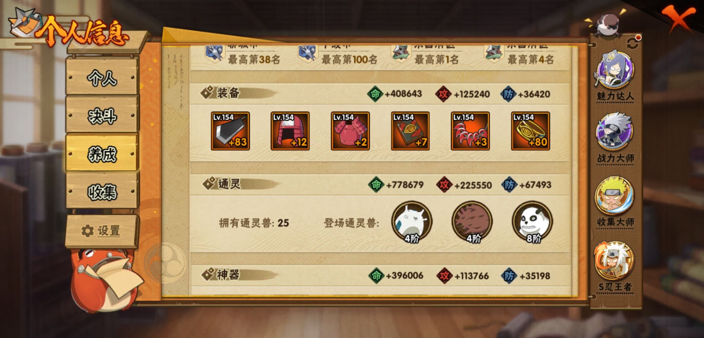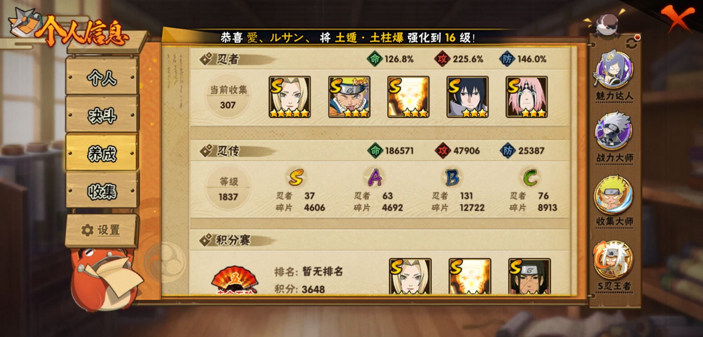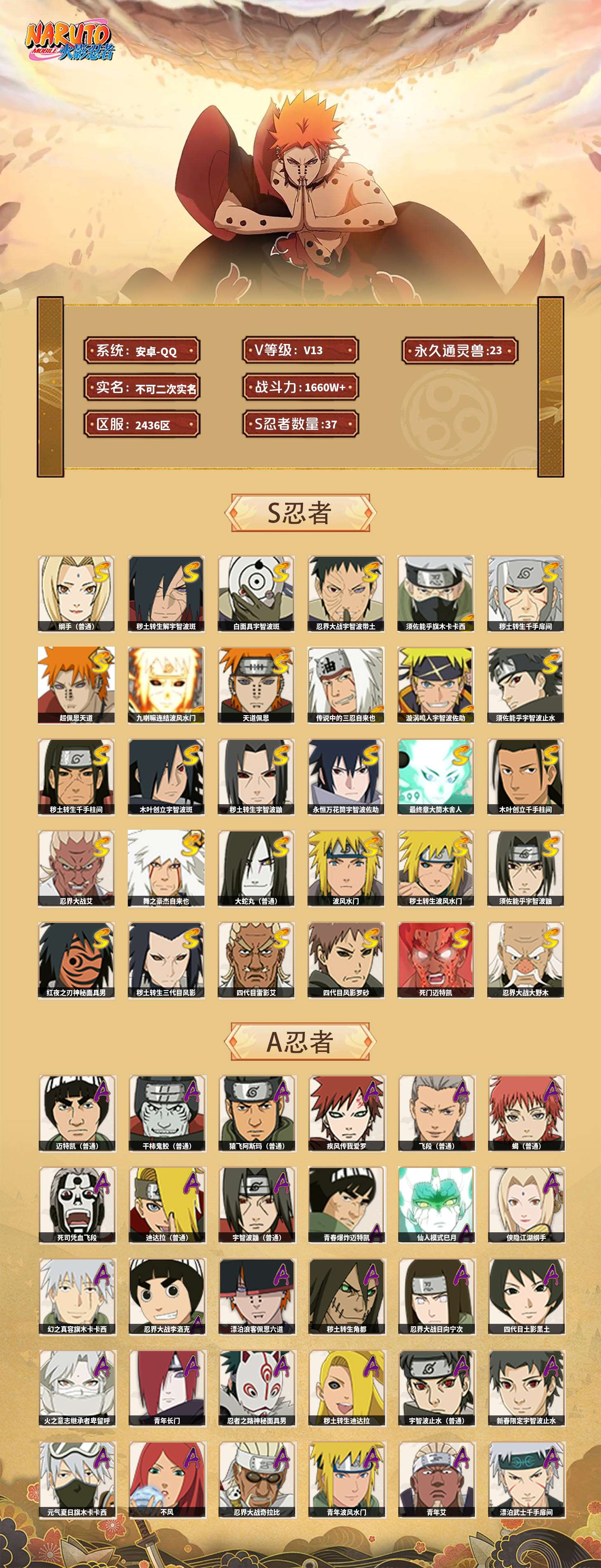 【火影忍者】【lyhy11437】战斗力:1660w;段位:上忍1阶;本服排名:104;vip:v13级;s忍:37个;a忍:63个;通灵兽:23个,s忍:秽土转生解宇智波斑|白面具宇智波斑|忍界大战宇智波带土|须佐能乎旗木卡卡西|秽土转生千手扉间|超佩恩天道|九喇嘛连结波风水门|天道佩恩|传说中的三忍自来也|漩涡鸣人宇智波佐助|须佐能乎宇智波止水|秽土转生千手柱间|木叶创立宇智波斑|秽土转生宇智波鼬|永恒万花筒宇智波佐助|最终章大筒木舍人|木叶创立千手柱间|忍界大战艾|舞之豪杰自来也|大蛇丸(普通)|纲手(普通) 5星|波风水门|秽土转生波风水门|须佐能乎宇智波鼬|红夜之刃神秘面具男|秽土转生三代目风影|四代目雷影艾|四代目风影罗砂|死门迈特凯|忍界大战大野木|忍界大战春野樱|九喇嘛连结漩涡鸣人|博人传大筒木金式|大筒木桃式|猿飞日斩(普通)|秽土转生猿飞日斩|自来也(普通)__a忍:青春爆炸迈特凯|仙人模式巳月|侠隐江湖纲手|幻之真容旗木卡卡西|忍界大战李洛克|漂泊浪客佩恩六道|秽土转生角都|忍界大战日向宁次|四代目土影黑土|火之意志继承者卑留呼|青年长门|忍者之路神秘面具男|秽土转生迪达拉|宇智波止水(普通)|新春限定宇智波止水|元气夏日旗木卡卡西|不风|忍界大战奇拉比|青年波风水门|青年艾|漂泊武士千手扉间|鲛肌融合干柿鬼鲛|忍界大战旗木卡卡西|漂泊武士桃地再不斩|近松十人卫千代|忍界大战迈特凯|须佐能乎宇智波佐助|恶灵之影飞段|暴怒宇智波带土|晓大蛇丸|百豪春野樱|忍界大战秋道丁次|忍界大战我爱罗|秽土转生猿飞阿斯玛|新春限定波风水门|夏日泳装小南|新春限定宇智波鼬|奇拉比(普通)|万花筒写轮眼宇智波佐助|五代目水影照美冥|五代目雷影达鲁伊|死司凭血飞段 3星|疾风传我爱罗 4星|迪达拉(普通) 3星|飞段(普通) 4星|小南(普通)|漂泊浪客小南|迈特凯(普通) 5星|宇智波鼬(普通) 3星|干柿鬼鲛(普通) 5星|秽土转生桃地再不斩|桃地再不斩|蝎(普通) 4星|绯流琥蝎|猿飞阿斯玛(普通) 5星|桃式显现漩涡博人|最终章日向雏田|六代目水影长十郎|宇智波泉奈|羁绊神农|忍界大战土台|初始形态机械鸣人|侠隐江湖大野木__通灵兽:忍犬(普通)|蓝蛇|砂之守鹤|蛤蟆吉|忍龟|镰鼬|猿魔|山椒鱼|蛞蝓(普通)|蜃|蛤蟆仙人|鲛鲨|蛤蟆健|熊猫|乌鸦(普通)|螃蟹|蛤蟆龙|蛤蟆广|蛞蝓侠隐江湖|梦貘|辛牙|鹰|蜘蛛