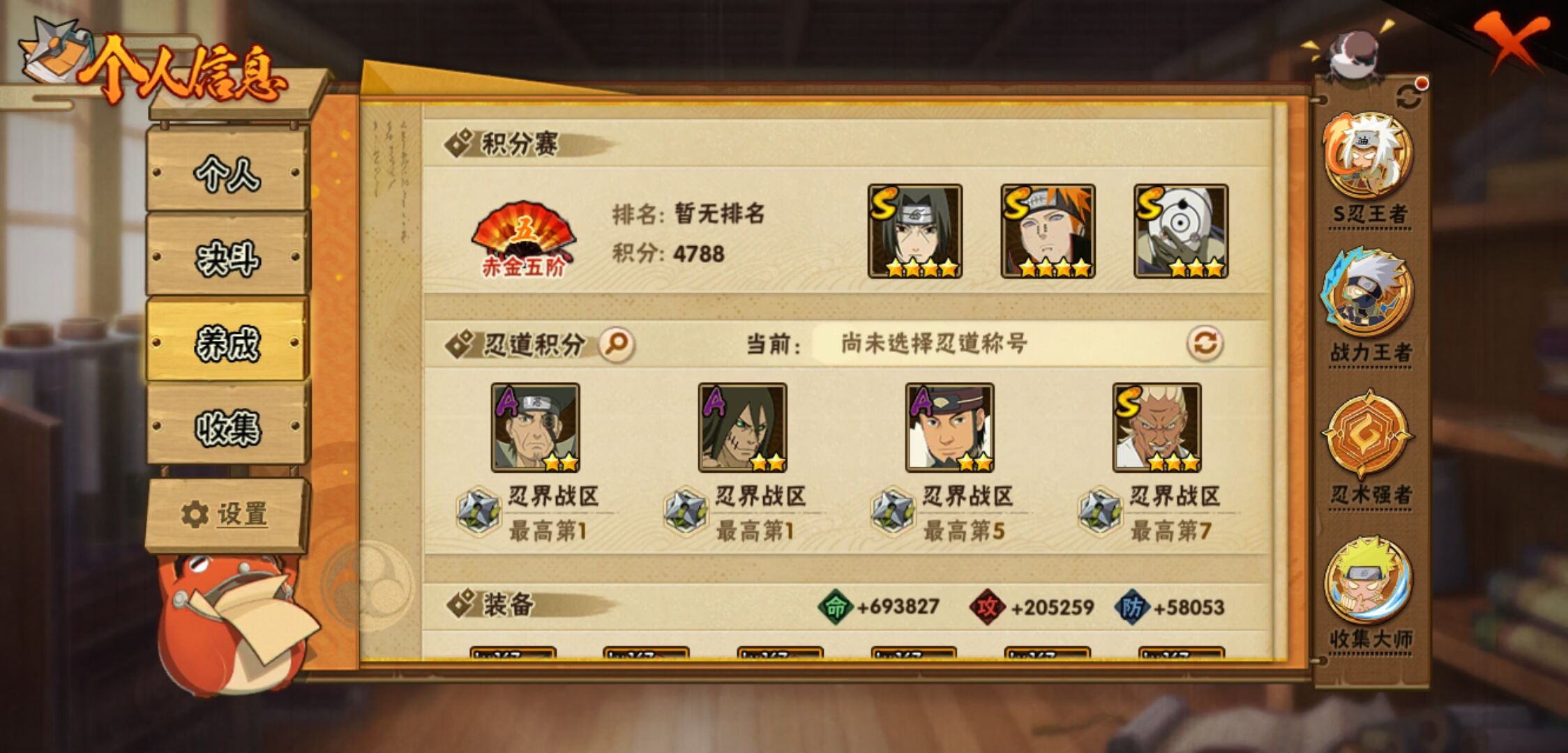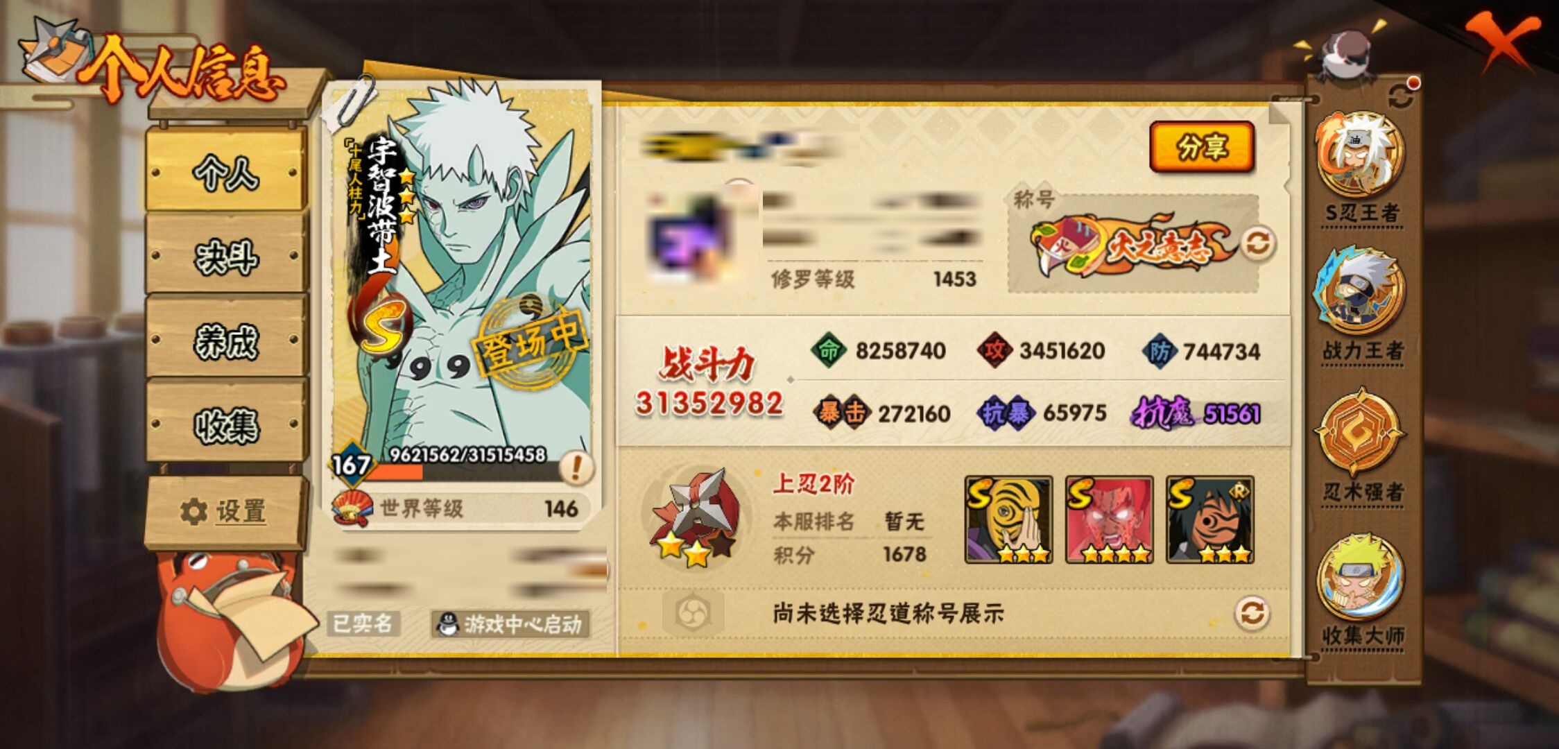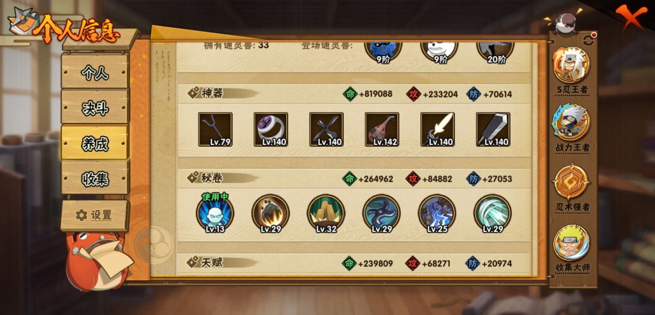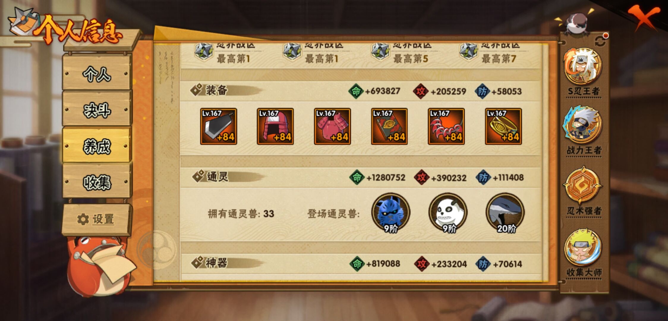【火影忍者】【lyhy11430】战斗力:3135w;段位:上忍2阶;本服排名:7;vip:v14级;s忍:56个;a忍:87个;通灵兽:29个,s忍:十尾人柱力宇智波带土|秽土转生解宇智波斑|白面具宇智波斑|忍界大战宇智波带土|须佐能乎旗木卡卡西|秽土转生千手扉间|超佩恩天道|九喇嘛连结波风水门|五影会谈宇智波斑|天道佩恩 4星|传说中的三忍自来也|漩涡鸣人宇智波佐助|须佐能乎宇智波止水|秽土转生千手柱间|木叶创立宇智波斑|秽土转生宇智波鼬|永恒万花筒宇智波佐助|最终章大筒木舍人|仙人模式自来也 4星|木叶创立千手柱间|忍界大战艾|舞之豪杰自来也|大蛇丸(普通) 4星|纲手(普通) 5星|百豪纲手|波风水门 5星|秽土转生波风水门 4星|千手扉间(普通)|千手柱间(普通)|秽土转生宇智波斑|宇智波斑(普通)|须佐能乎宇智波鼬 4星|神秘面具男(普通)|红夜之刃神秘面具男|秽土转生长门|秽土转生半藏|秽土转生三代目风影|秽土转生金角银角|二代目土影无|二代目水影鬼灯幻月|三代目土影大野木|三代目雷影艾|四代目雷影艾|四代目风影罗砂|仙人模式药师兜|死门迈特凯 4星|忍界大战大野木|忍界大战春野樱 4星|九喇嘛连结漩涡鸣人|博人传大筒木金式|大筒木桃式|猿飞日斩(普通) 5星|秽土转生猿飞日斩|自来也(普通)|暴怒第六尾漩涡鸣人|初代目风影烈斗__a忍:青春爆炸迈特凯|漂泊浪客宇智波带土|妖怪奇谭纲手|仙人模式巳月 3星|侠隐江湖纲手|幻之真容旗木卡卡西|忍界大战李洛克 3星|漂泊浪客佩恩六道|秽土转生角都|忍界大战日向宁次|四代目土影黑土|木叶上忍猿飞木叶丸|火之意志继承者卑留呼|青年长门 3星|侠隐江湖照美冥|忍者之路神秘面具男|秽土转生迪达拉|志村团藏|宇智波止水(普通)|新春限定宇智波止水|不风|新春限定迪达拉|忍界大战奇拉比|青年波风水门|青年艾|漂泊武士千手扉间|加藤断|忍界大战旗木卡卡西|漂泊武士桃地再不斩|近松十人卫千代|夏日泳装照美冥|晓创生蝎|晓创生角都|半蛇斗篷药师兜 3星|须佐能乎宇智波佐助|九尾查克拉漩涡鸣人|新春限定小南|七夕限定猿飞阿斯玛|暴怒宇智波带土|晓大蛇丸|地陆|火影继承人猿飞日斩 3星|百豪春野樱|忍界大战秋道丁次|忍界大战我爱罗|忍界大战勘九郎|秽土转生猿飞阿斯玛|新春限定波风水门|夏日泳装小南|疾风传咒印宇智波佐助|新春限定宇智波鼬|奇拉比(普通)|万花筒写轮眼宇智波佐助|五代目水影照美冥 3星|达鲁伊(普通)|五代目雷影达鲁伊|惊门迈特凯|绝|死司凭血飞段 5星|角都(普通)|地怨虞角都|疾风传我爱罗 5星|迪达拉(普通) 3星|飞段(普通) 5星|小南(普通) 3星|漂泊浪客小南|仙人模式漩涡鸣人 3星|万花筒写轮眼旗木卡卡西|旗木卡卡西(普通) 4星|迈特凯(普通) 5星|宇智波鼬(普通)|干柿鬼鲛(普通) 5星|秽土转生桃地再不斩|桃地再不斩|蝎(普通) 5星|绯流琥蝎 3星|猿飞阿斯玛(普通) 5星|桃式显现漩涡博人 3星|最终章日向雏田|六代目水影长十郎 3星|不缘|不动|宇智波泉奈|羁绊神农|忍界大战土台|初始形态机械鸣人|侠隐江湖大野木__通灵兽:忍犬(普通)|蓝蛇|蛤蟆吉|忍龟|镰鼬|猿魔|万蛇|山椒鱼|蛞蝓(普通)|蜃|蛤蟆仙人|鲛鲨|蛤蟆健|乌鸦(普通)|熊猫|螃蟹|二尾又旅|蛤蟆龙|怒鬼(普通)|蛤蟆广|三尾矶抚|梦貘|砂之守鹤|鹰|蜘蛛|怒鬼无臂|怒鬼爪|蛞蝓侠隐江湖|辛牙