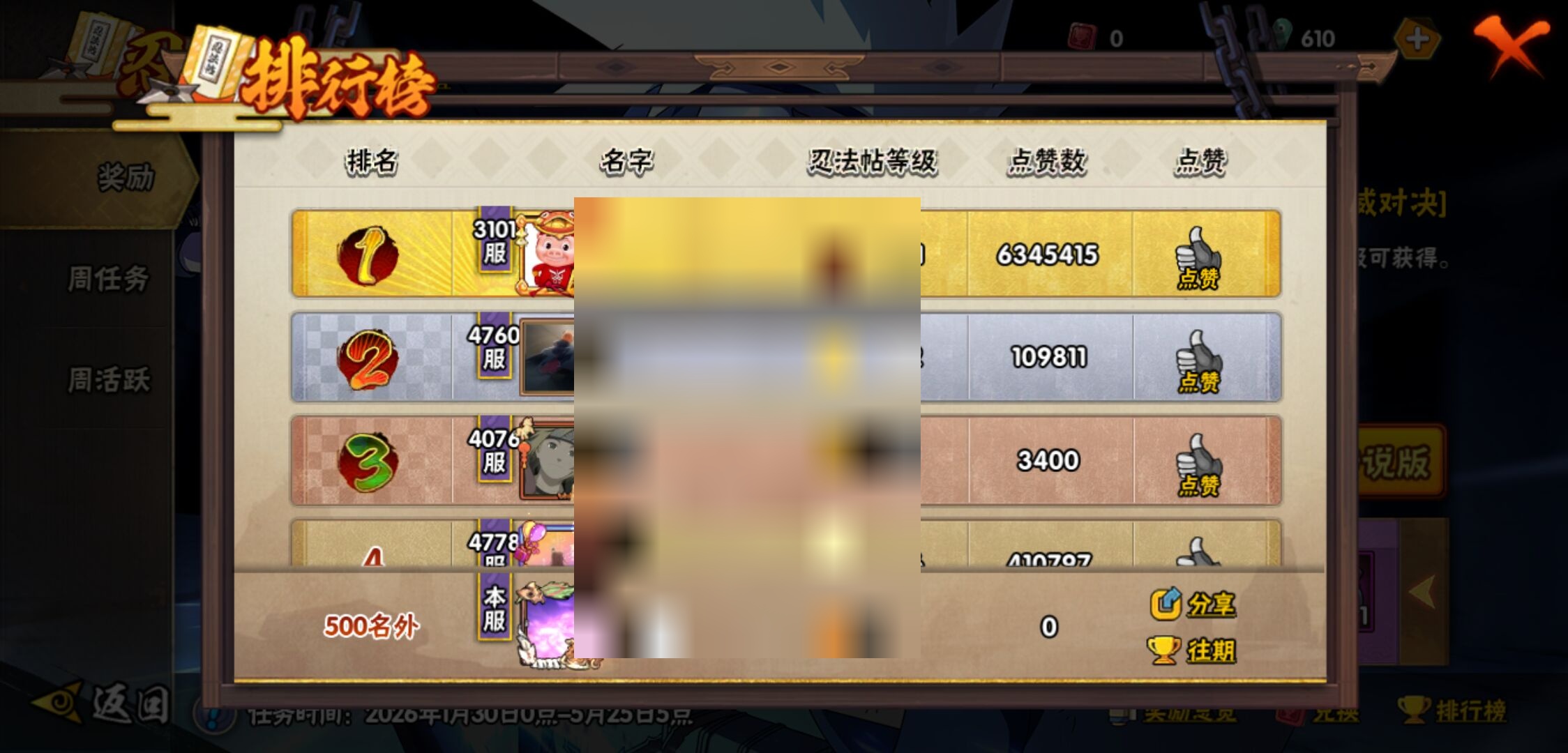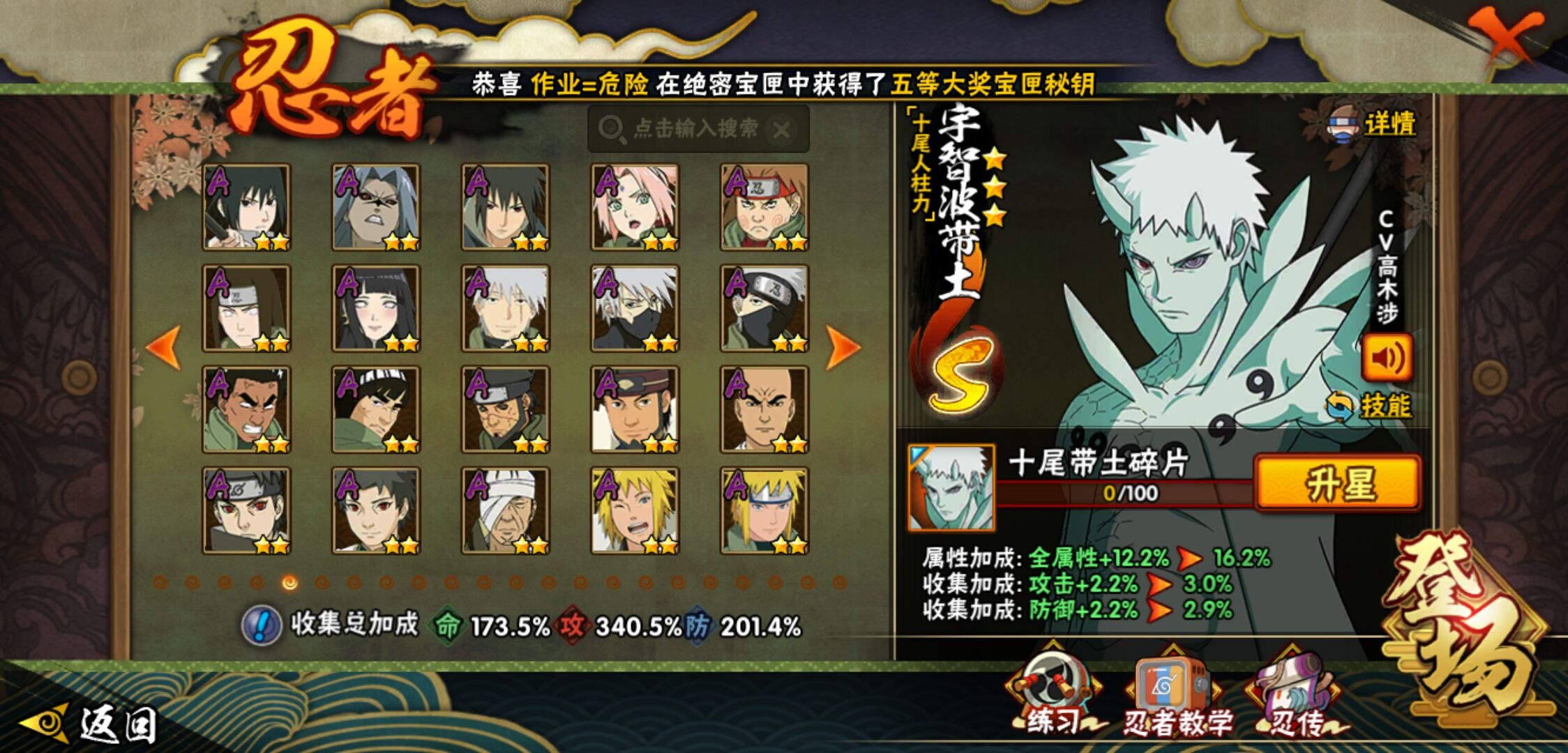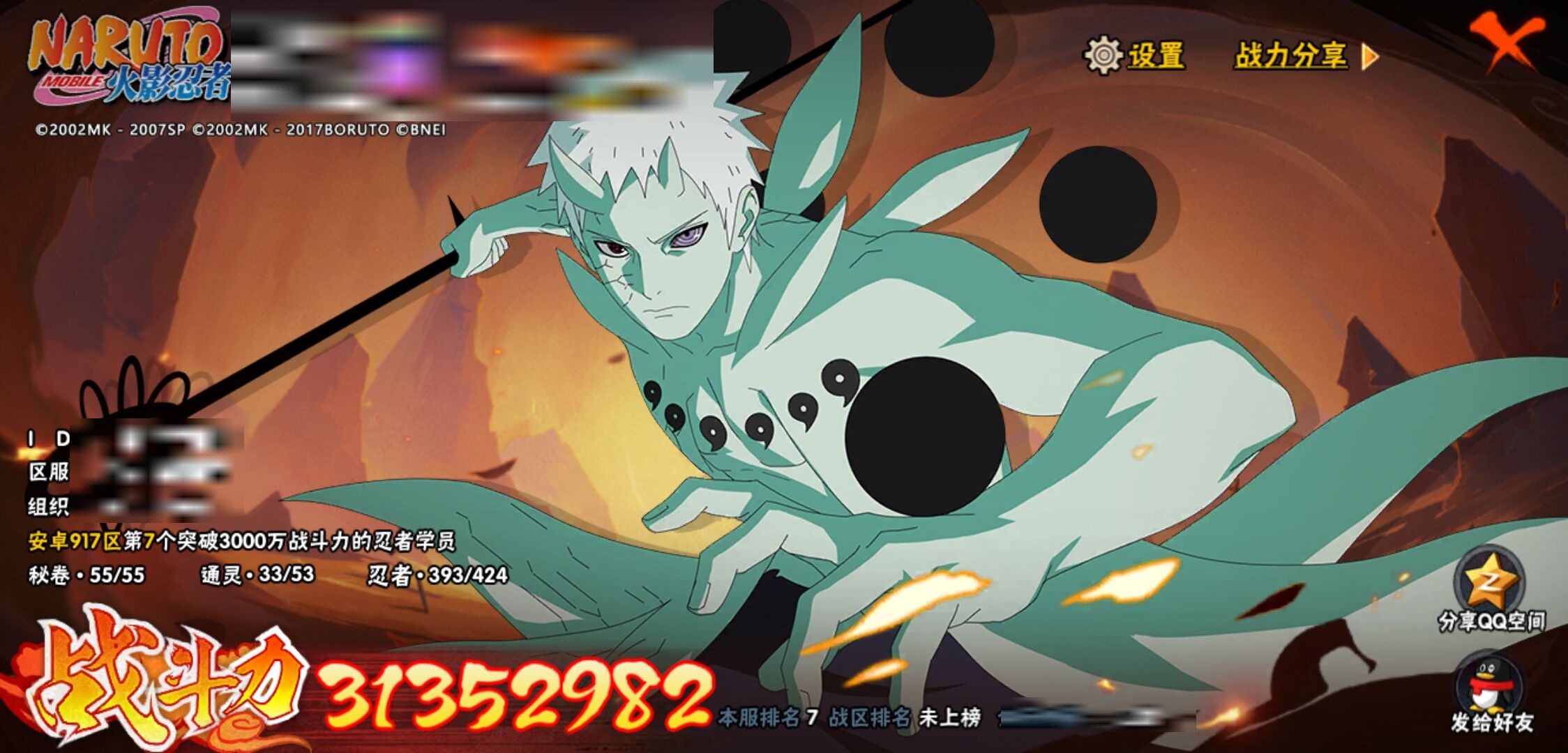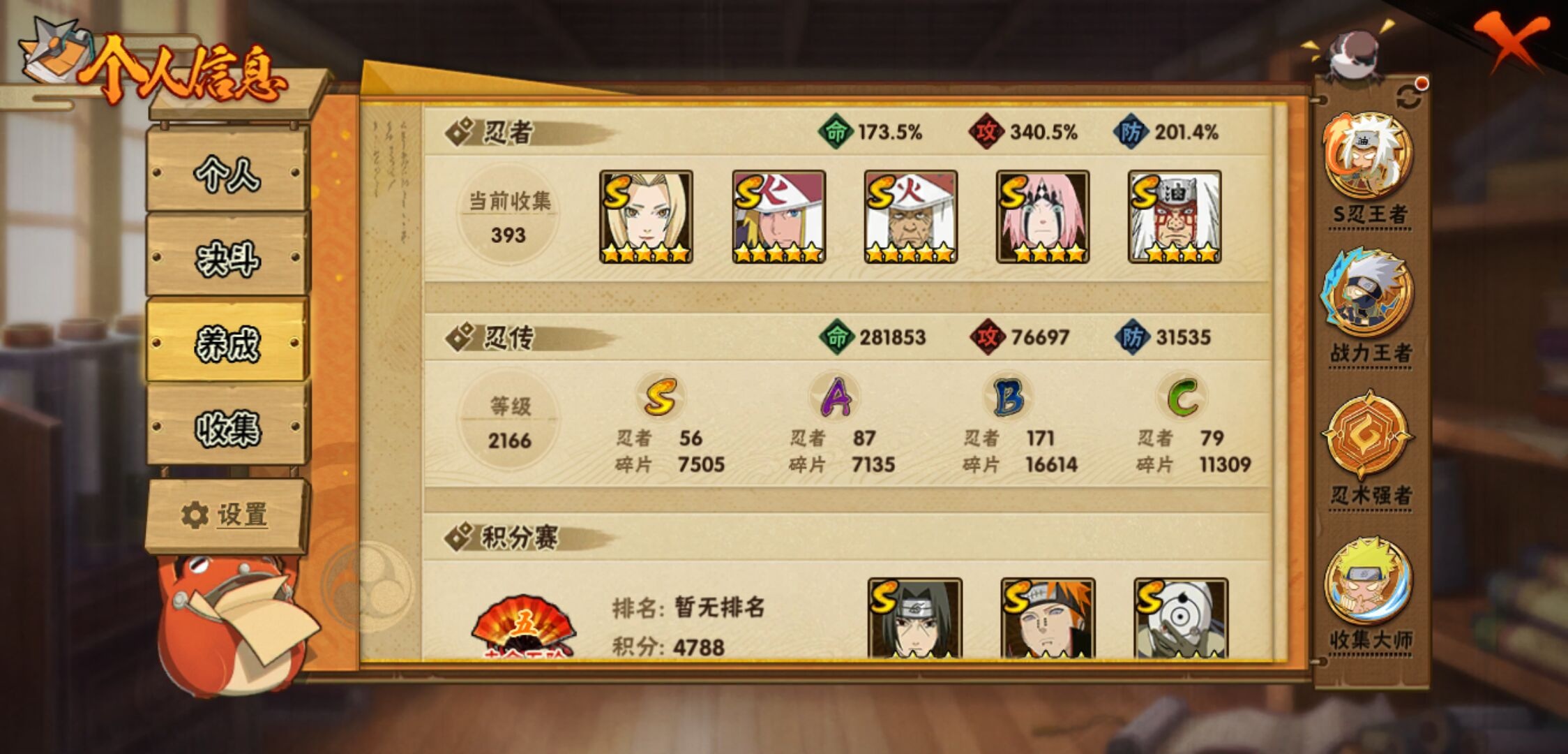 【火影忍者】【lyhy11430】战斗力:3135w;段位:上忍2阶;本服排名:7;vip:v14级;s忍:56个;a忍:87个;通灵兽:29个,s忍:十尾人柱力宇智波带土|秽土转生解宇智波斑|白面具宇智波斑|忍界大战宇智波带土|须佐能乎旗木卡卡西|秽土转生千手扉间|超佩恩天道|九喇嘛连结波风水门|五影会谈宇智波斑|天道佩恩 4星|传说中的三忍自来也|漩涡鸣人宇智波佐助|须佐能乎宇智波止水|秽土转生千手柱间|木叶创立宇智波斑|秽土转生宇智波鼬|永恒万花筒宇智波佐助|最终章大筒木舍人|仙人模式自来也 4星|木叶创立千手柱间|忍界大战艾|舞之豪杰自来也|大蛇丸(普通) 4星|纲手(普通) 5星|百豪纲手|波风水门 5星|秽土转生波风水门 4星|千手扉间(普通)|千手柱间(普通)|秽土转生宇智波斑|宇智波斑(普通)|须佐能乎宇智波鼬 4星|神秘面具男(普通)|红夜之刃神秘面具男|秽土转生长门|秽土转生半藏|秽土转生三代目风影|秽土转生金角银角|二代目土影无|二代目水影鬼灯幻月|三代目土影大野木|三代目雷影艾|四代目雷影艾|四代目风影罗砂|仙人模式药师兜|死门迈特凯 4星|忍界大战大野木|忍界大战春野樱 4星|九喇嘛连结漩涡鸣人|博人传大筒木金式|大筒木桃式|猿飞日斩(普通) 5星|秽土转生猿飞日斩|自来也(普通)|暴怒第六尾漩涡鸣人|初代目风影烈斗__a忍:青春爆炸迈特凯|漂泊浪客宇智波带土|妖怪奇谭纲手|仙人模式巳月 3星|侠隐江湖纲手|幻之真容旗木卡卡西|忍界大战李洛克 3星|漂泊浪客佩恩六道|秽土转生角都|忍界大战日向宁次|四代目土影黑土|木叶上忍猿飞木叶丸|火之意志继承者卑留呼|青年长门 3星|侠隐江湖照美冥|忍者之路神秘面具男|秽土转生迪达拉|志村团藏|宇智波止水(普通)|新春限定宇智波止水|不风|新春限定迪达拉|忍界大战奇拉比|青年波风水门|青年艾|漂泊武士千手扉间|加藤断|忍界大战旗木卡卡西|漂泊武士桃地再不斩|近松十人卫千代|夏日泳装照美冥|晓创生蝎|晓创生角都|半蛇斗篷药师兜 3星|须佐能乎宇智波佐助|九尾查克拉漩涡鸣人|新春限定小南|七夕限定猿飞阿斯玛|暴怒宇智波带土|晓大蛇丸|地陆|火影继承人猿飞日斩 3星|百豪春野樱|忍界大战秋道丁次|忍界大战我爱罗|忍界大战勘九郎|秽土转生猿飞阿斯玛|新春限定波风水门|夏日泳装小南|疾风传咒印宇智波佐助|新春限定宇智波鼬|奇拉比(普通)|万花筒写轮眼宇智波佐助|五代目水影照美冥 3星|达鲁伊(普通)|五代目雷影达鲁伊|惊门迈特凯|绝|死司凭血飞段 5星|角都(普通)|地怨虞角都|疾风传我爱罗 5星|迪达拉(普通) 3星|飞段(普通) 5星|小南(普通) 3星|漂泊浪客小南|仙人模式漩涡鸣人 3星|万花筒写轮眼旗木卡卡西|旗木卡卡西(普通) 4星|迈特凯(普通) 5星|宇智波鼬(普通)|干柿鬼鲛(普通) 5星|秽土转生桃地再不斩|桃地再不斩|蝎(普通) 5星|绯流琥蝎 3星|猿飞阿斯玛(普通) 5星|桃式显现漩涡博人 3星|最终章日向雏田|六代目水影长十郎 3星|不缘|不动|宇智波泉奈|羁绊神农|忍界大战土台|初始形态机械鸣人|侠隐江湖大野木__通灵兽:忍犬(普通)|蓝蛇|蛤蟆吉|忍龟|镰鼬|猿魔|万蛇|山椒鱼|蛞蝓(普通)|蜃|蛤蟆仙人|鲛鲨|蛤蟆健|乌鸦(普通)|熊猫|螃蟹|二尾又旅|蛤蟆龙|怒鬼(普通)|蛤蟆广|三尾矶抚|梦貘|砂之守鹤|鹰|蜘蛛|怒鬼无臂|怒鬼爪|蛞蝓侠隐江湖|辛牙