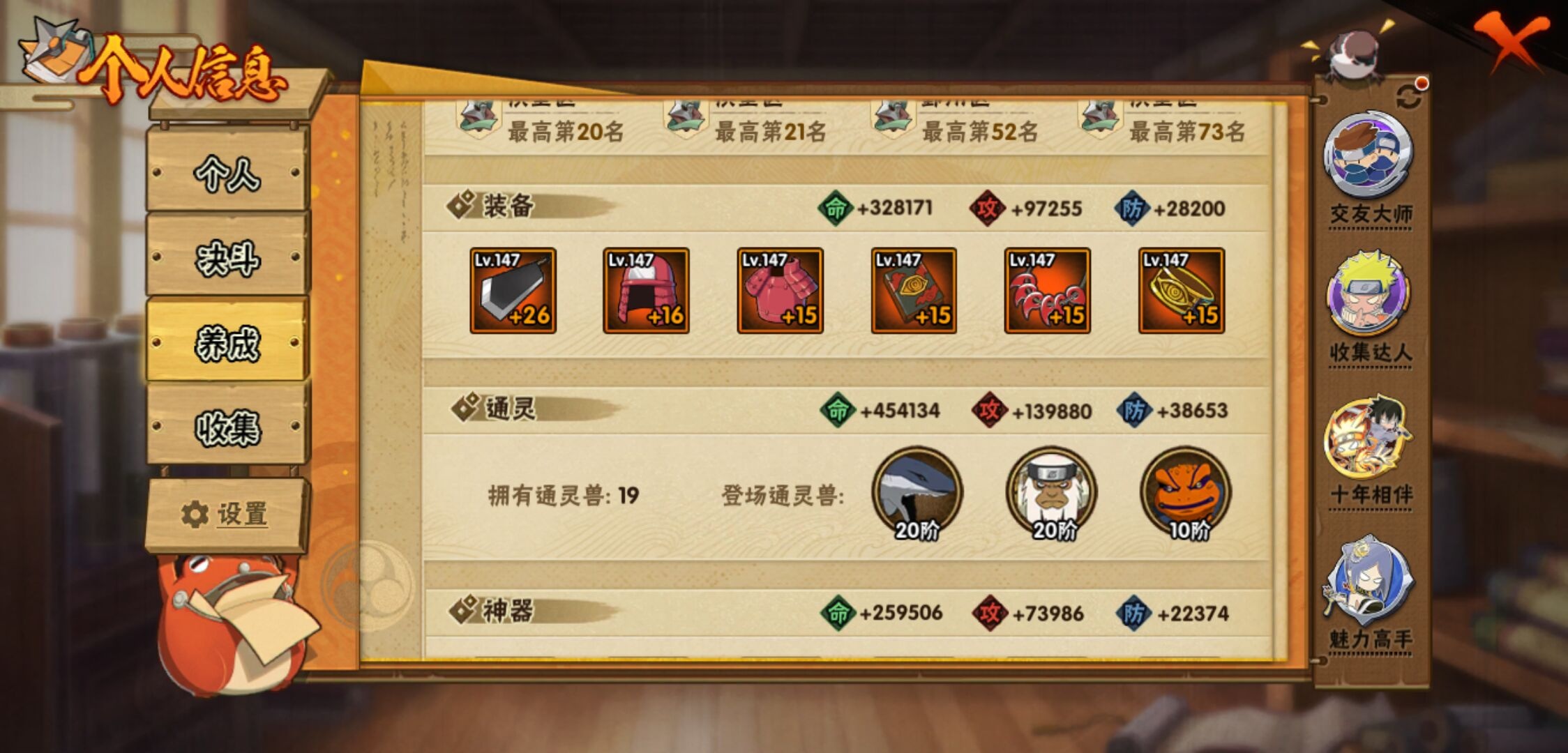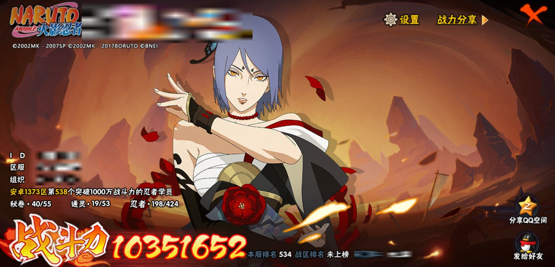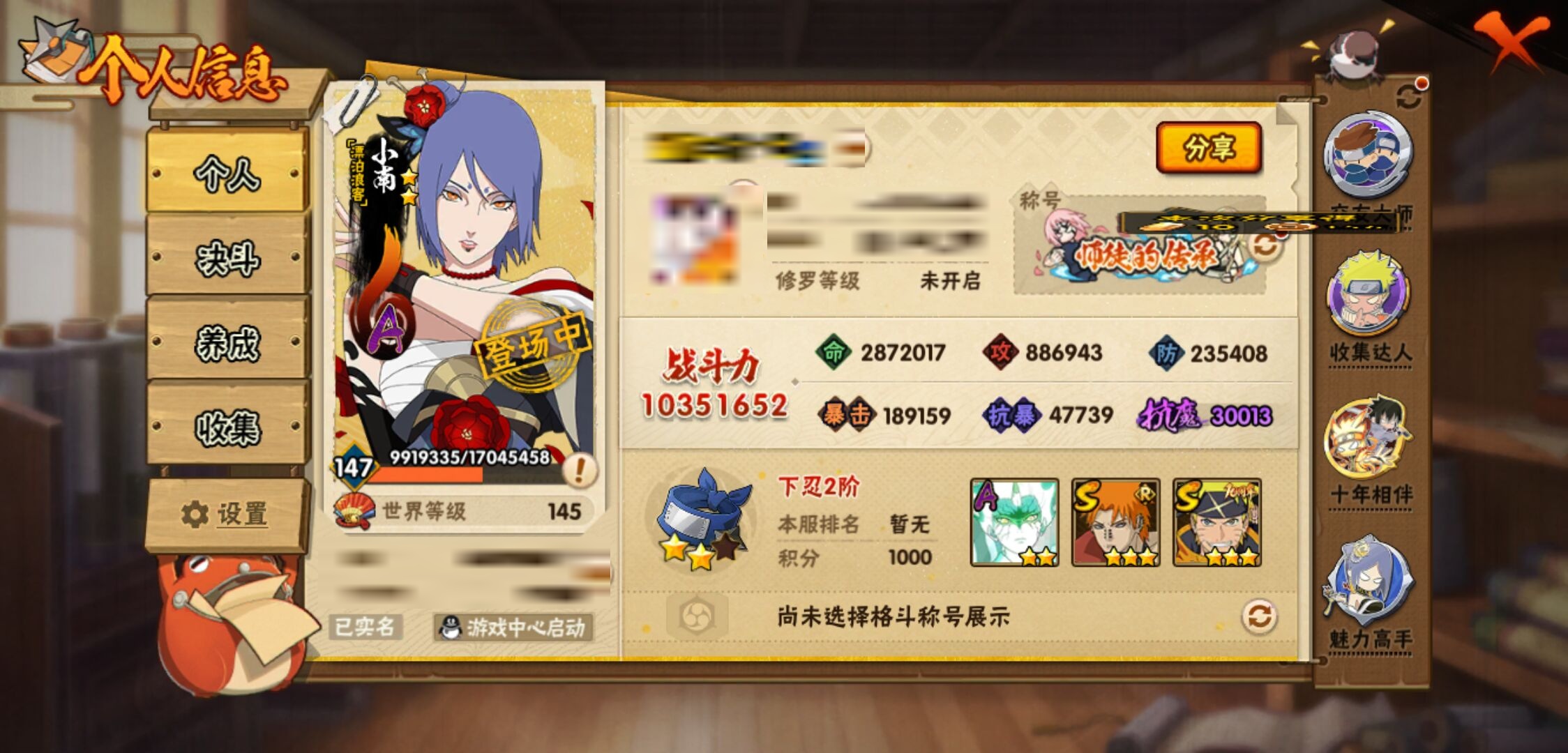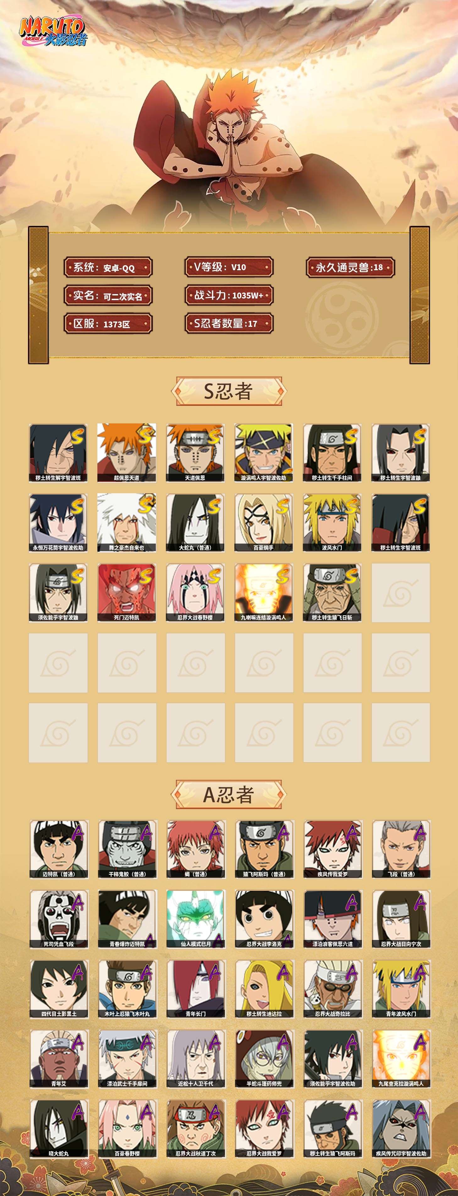 【火影忍者】【lyhy11439】战斗力:1035w;段位:下忍2阶;本服排名:534;vip:v10级;s忍:17个;a忍:46个;通灵兽:18个,s忍:秽土转生解宇智波斑|超佩恩天道|天道佩恩|漩涡鸣人宇智波佐助|秽土转生千手柱间|秽土转生宇智波鼬|永恒万花筒宇智波佐助|舞之豪杰自来也|大蛇丸(普通)|百豪纲手|波风水门|秽土转生宇智波斑|须佐能乎宇智波鼬|死门迈特凯|忍界大战春野樱|九喇嘛连结漩涡鸣人|秽土转生猿飞日斩__a忍:青春爆炸迈特凯|仙人模式巳月|忍界大战李洛克|漂泊浪客佩恩六道|忍界大战日向宁次|四代目土影黑土|木叶上忍猿飞木叶丸|青年长门|秽土转生迪达拉|忍界大战奇拉比|青年波风水门|青年艾|漂泊武士千手扉间|近松十人卫千代|半蛇斗篷药师兜|须佐能乎宇智波佐助|九尾查克拉漩涡鸣人|晓大蛇丸|百豪春野樱|忍界大战秋道丁次|忍界大战我爱罗|秽土转生猿飞阿斯玛|疾风传咒印宇智波佐助|新春限定宇智波鼬|万花筒写轮眼宇智波佐助|五代目水影照美冥|五代目雷影达鲁伊|死司凭血飞段 3星|疾风传我爱罗 4星|迪达拉(普通)|飞段(普通) 4星|小南(普通)|漂泊浪客小南|仙人模式漩涡鸣人|万花筒写轮眼旗木卡卡西|迈特凯(普通) 5星|宇智波鼬(普通)|夏日限定宇智波鼬|干柿鬼鲛(普通) 5星|蝎(普通) 5星|猿飞阿斯玛(普通) 5星|桃式显现漩涡博人|最终章日向雏田|六代目水影长十郎|宇智波泉奈|侠隐江湖大野木__通灵兽:忍犬(普通)|蓝蛇|蛤蟆吉|忍龟|镰鼬|猿魔|山椒鱼|蜃|熊猫|蛤蟆仙人|鲛鲨|二尾又旅|蛤蟆健|砂之守鹤|乌鸦(普通)|蛤蟆龙|蛤蟆广|蛞蝓(普通)