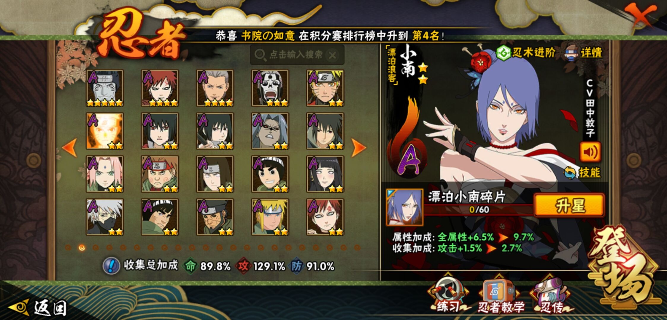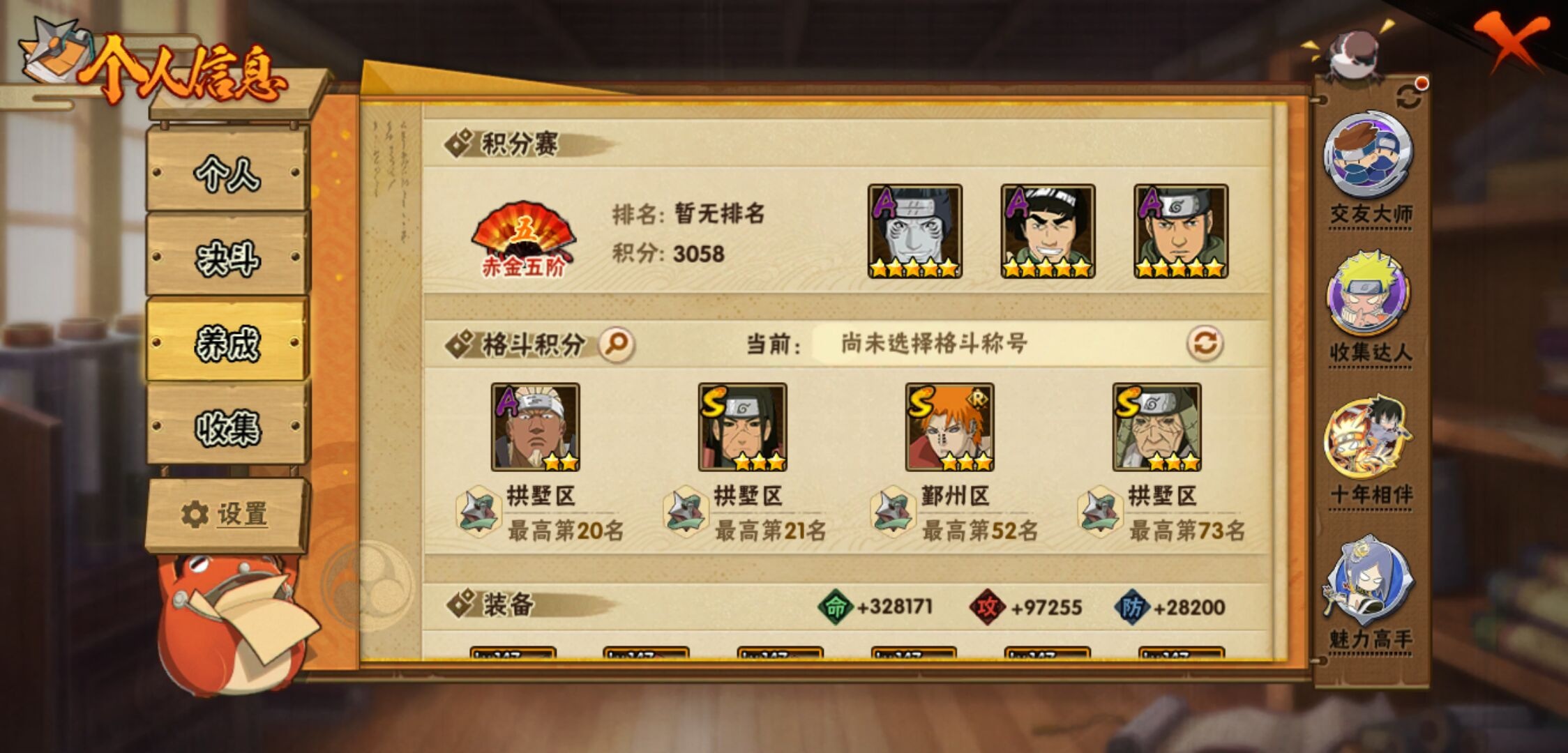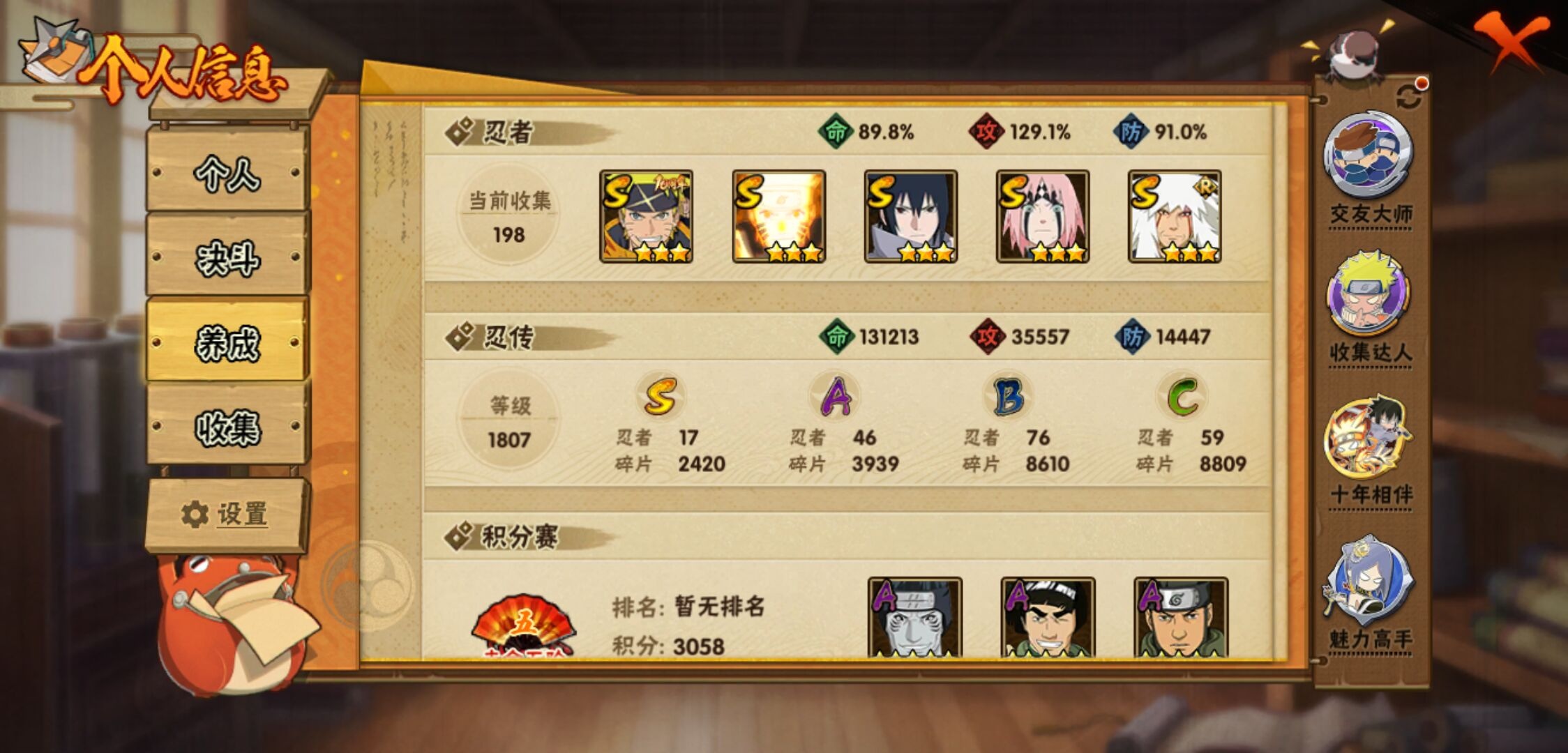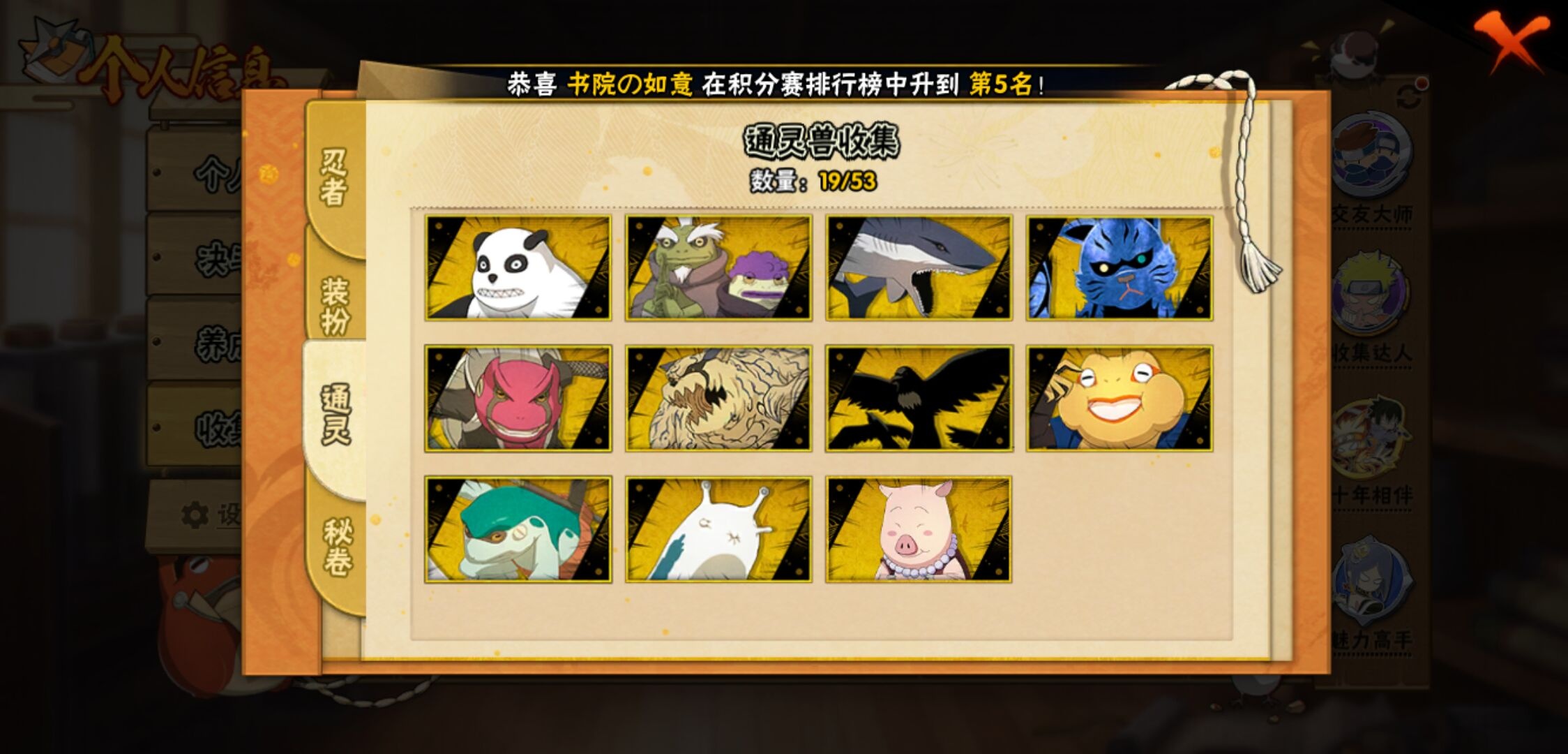 【火影忍者】【lyhy11439】战斗力:1035w;段位:下忍2阶;本服排名:534;vip:v10级;s忍:17个;a忍:46个;通灵兽:18个,s忍:秽土转生解宇智波斑|超佩恩天道|天道佩恩|漩涡鸣人宇智波佐助|秽土转生千手柱间|秽土转生宇智波鼬|永恒万花筒宇智波佐助|舞之豪杰自来也|大蛇丸(普通)|百豪纲手|波风水门|秽土转生宇智波斑|须佐能乎宇智波鼬|死门迈特凯|忍界大战春野樱|九喇嘛连结漩涡鸣人|秽土转生猿飞日斩__a忍:青春爆炸迈特凯|仙人模式巳月|忍界大战李洛克|漂泊浪客佩恩六道|忍界大战日向宁次|四代目土影黑土|木叶上忍猿飞木叶丸|青年长门|秽土转生迪达拉|忍界大战奇拉比|青年波风水门|青年艾|漂泊武士千手扉间|近松十人卫千代|半蛇斗篷药师兜|须佐能乎宇智波佐助|九尾查克拉漩涡鸣人|晓大蛇丸|百豪春野樱|忍界大战秋道丁次|忍界大战我爱罗|秽土转生猿飞阿斯玛|疾风传咒印宇智波佐助|新春限定宇智波鼬|万花筒写轮眼宇智波佐助|五代目水影照美冥|五代目雷影达鲁伊|死司凭血飞段 3星|疾风传我爱罗 4星|迪达拉(普通)|飞段(普通) 4星|小南(普通)|漂泊浪客小南|仙人模式漩涡鸣人|万花筒写轮眼旗木卡卡西|迈特凯(普通) 5星|宇智波鼬(普通)|夏日限定宇智波鼬|干柿鬼鲛(普通) 5星|蝎(普通) 5星|猿飞阿斯玛(普通) 5星|桃式显现漩涡博人|最终章日向雏田|六代目水影长十郎|宇智波泉奈|侠隐江湖大野木__通灵兽:忍犬(普通)|蓝蛇|蛤蟆吉|忍龟|镰鼬|猿魔|山椒鱼|蜃|熊猫|蛤蟆仙人|鲛鲨|二尾又旅|蛤蟆健|砂之守鹤|乌鸦(普通)|蛤蟆龙|蛤蟆广|蛞蝓(普通)