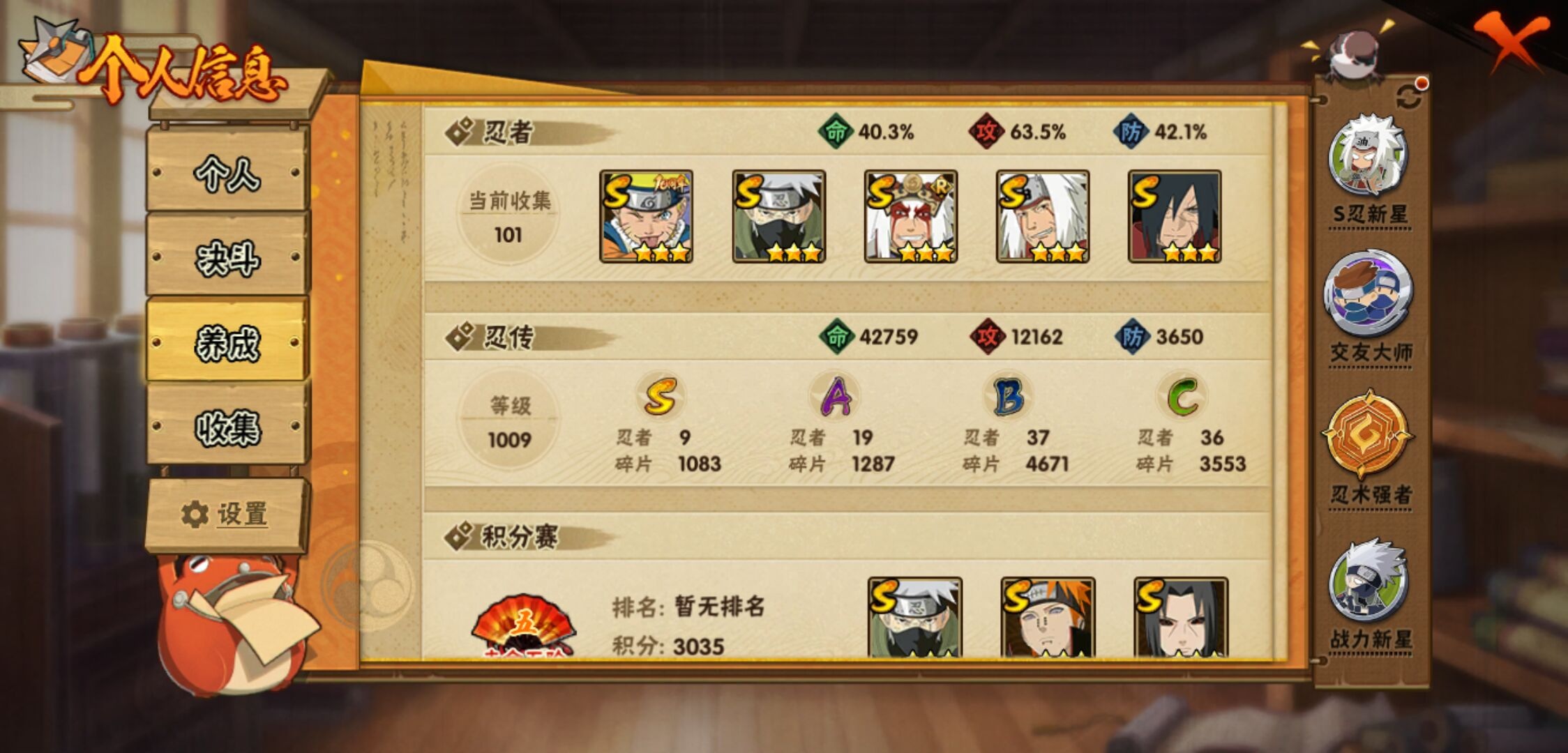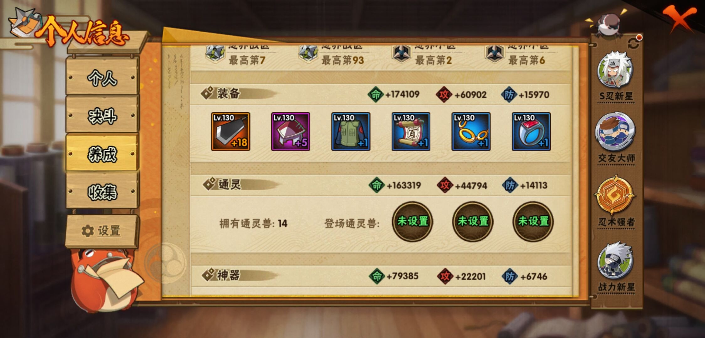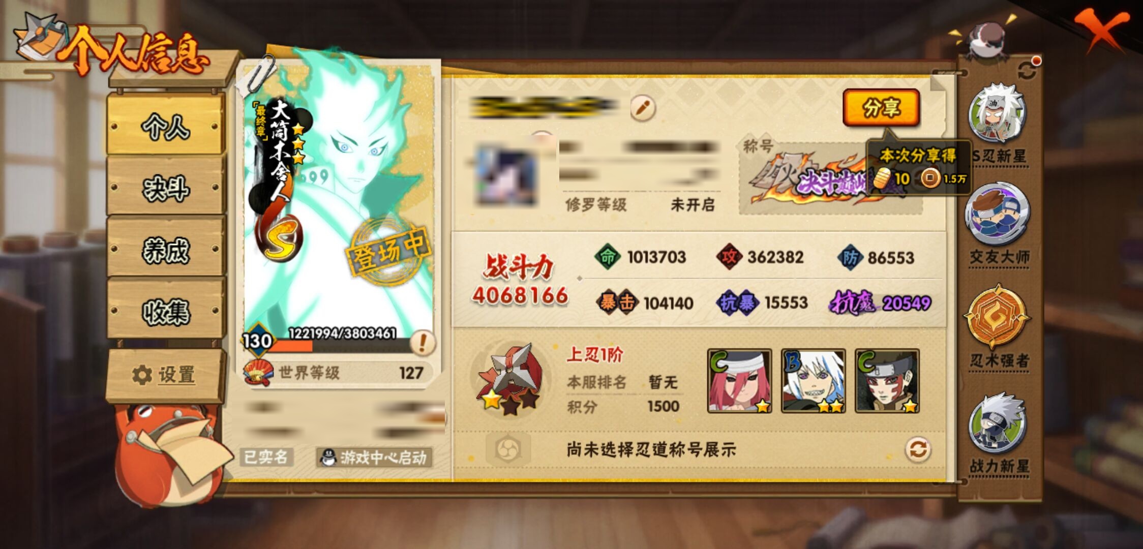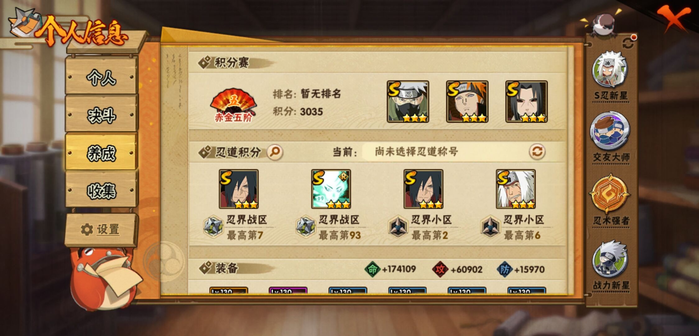 【火影忍者】【lyhy11449】战斗力:406w;段位:上忍1阶;本服排名:1012;vip:v6级;s忍:9个;a忍:19个;通灵兽:13个,s忍:秽土转生解宇智波斑|须佐能乎旗木卡卡西|天道佩恩|传说中的三忍自来也|漩涡鸣人宇智波佐助|秽土转生宇智波鼬|最终章大筒木舍人|舞之豪杰自来也|须佐能乎宇智波鼬__a忍:青春爆炸迈特凯|忍界大战李洛克|秽土转生角都|近松十人卫千代|百豪春野樱|忍界大战秋道丁次|秽土转生猿飞阿斯玛|疾风传咒印宇智波佐助|迪达拉(普通)|飞段(普通)|迈特凯(普通)|宇智波鼬(普通)|干柿鬼鲛(普通) 3星|绯流琥蝎|蝎(普通)|猿飞阿斯玛(普通) 4星|不缘|宇智波泉奈|侠隐江湖大野木__通灵兽:忍犬(普通)|蓝蛇|蛤蟆吉|忍龟|砂之守鹤|镰鼬|猿魔|山椒鱼|蜃|蛤蟆仙人|鲛鲨|蛤蟆健|乌鸦(普通)