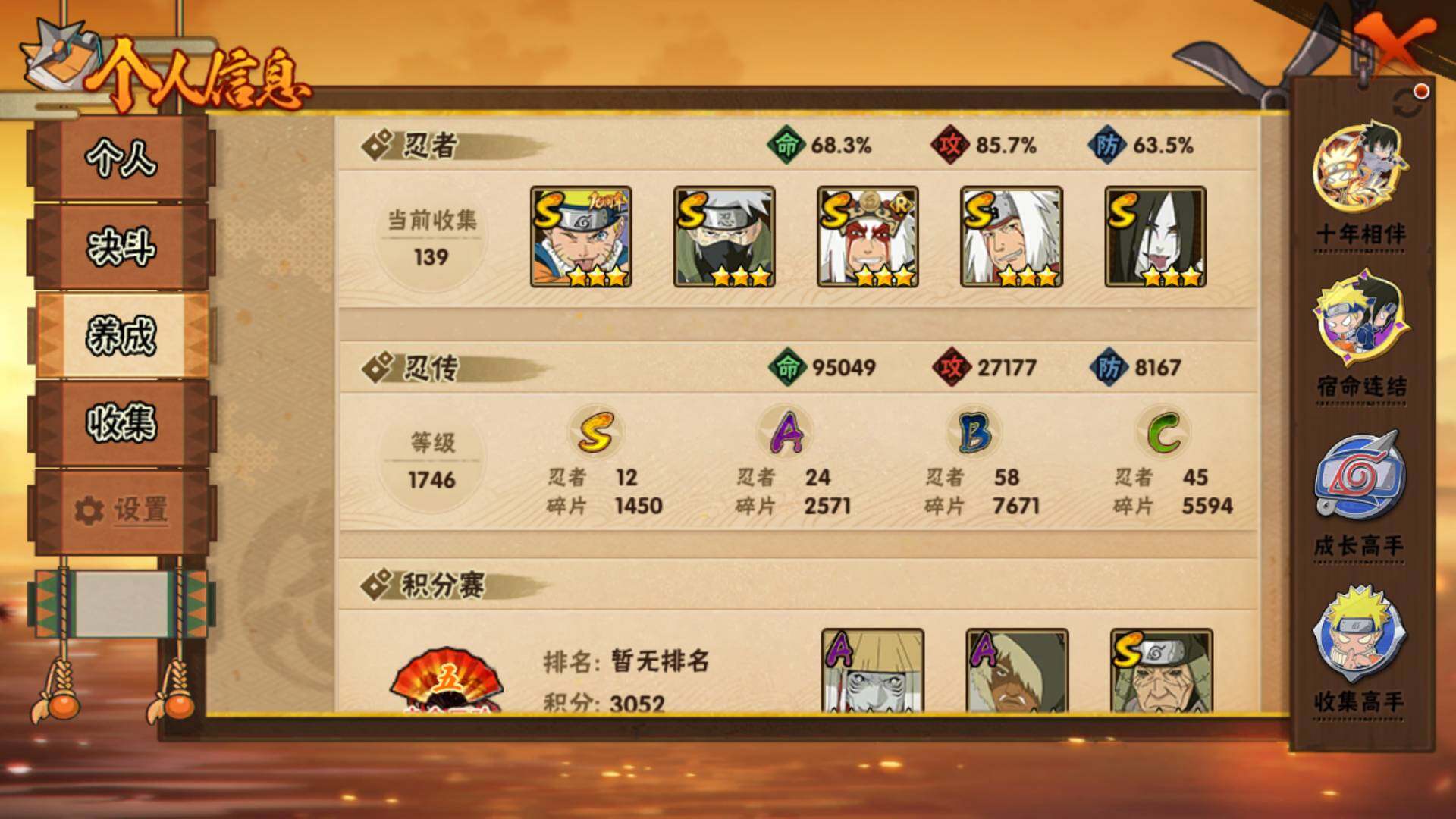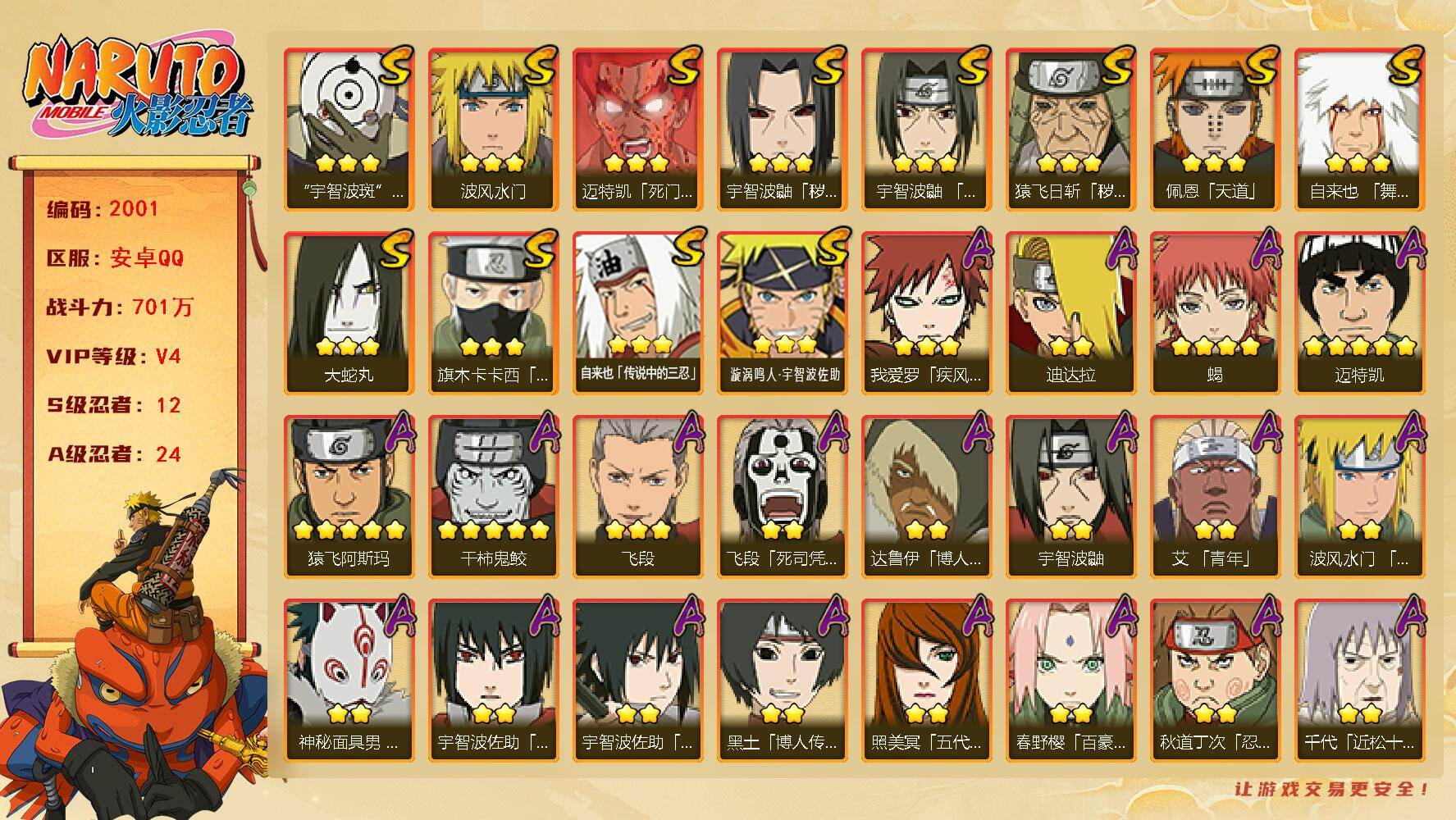[16541006](可免费转苹果 )v4701w战力,12s级忍者数-24a级忍者数,解斑57片,十尾带土48片,me2113 【s级忍者】:猿飞日斩「秽土转生」3星,宇智波鼬「秽土转生」3星,宇智波鼬「须佐能乎」3星,旗木卡卡西「须佐能乎」3星,自来也「舞之豪杰」3星,大蛇丸3星,自来也「传说中的三忍」3星,波风水门3星,迈特凯「死门」3星,佩恩「天道」3星,宇智波斑 「白面具」3星宇智波斑「白面具」,漩涡鸣人·宇智波佐助3星 【a级忍者】:艾「青年」2星,波风水门「青年」2星,达鲁伊「博人传」2星,迪达拉2星,飞段3星,飞段「死司凭血」2星,干柿鬼鲛5星,迈特凯5星,我爱罗「疾风传」3星,蝎4星,蝎「绯流琥」2星,猿飞阿斯玛5星,宇智波鼬2星,宇智波佐助「须佐能乎」2星,宇智波佐助「万花筒写轮眼」2星,照美冥「五代目水影」2星,神秘面具男「忍者之路」2星,李洛克「忍界大战」2星,黑土「博人传」2星,春野樱「百豪」2星,秋道丁次「忍界大战」2星,千代「近松十人卫」2星,宇智波泉奈2星,迈特凯「青春爆炸」2星