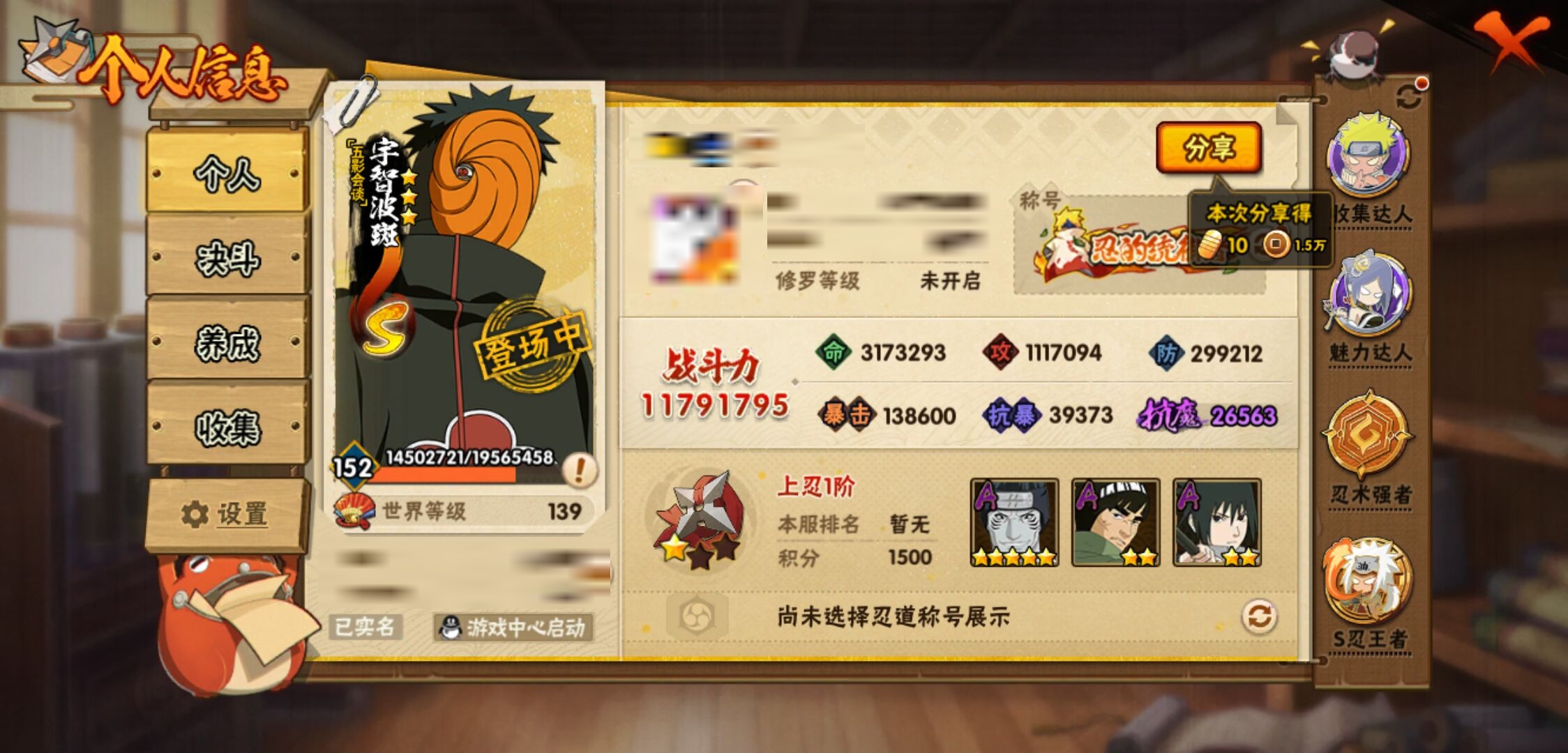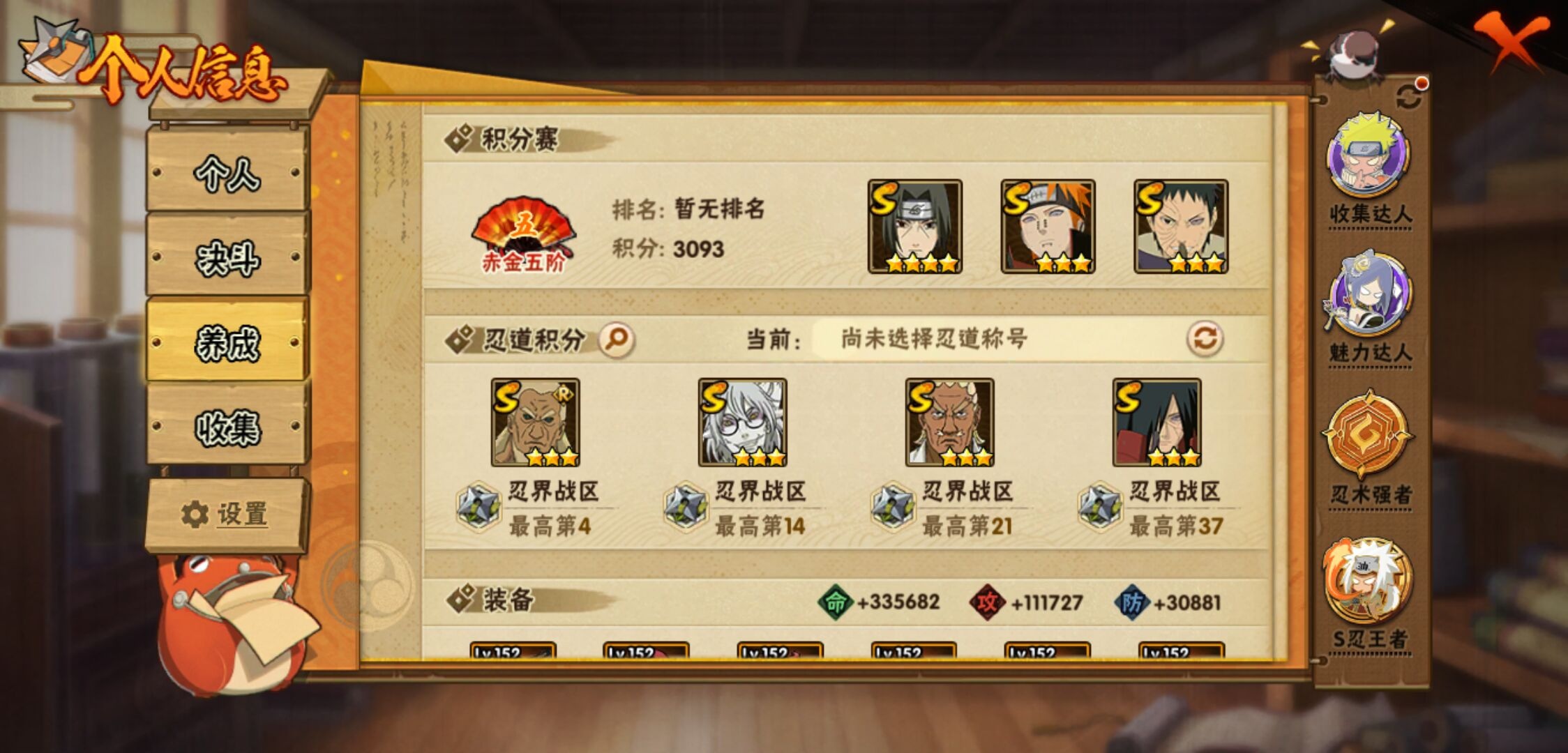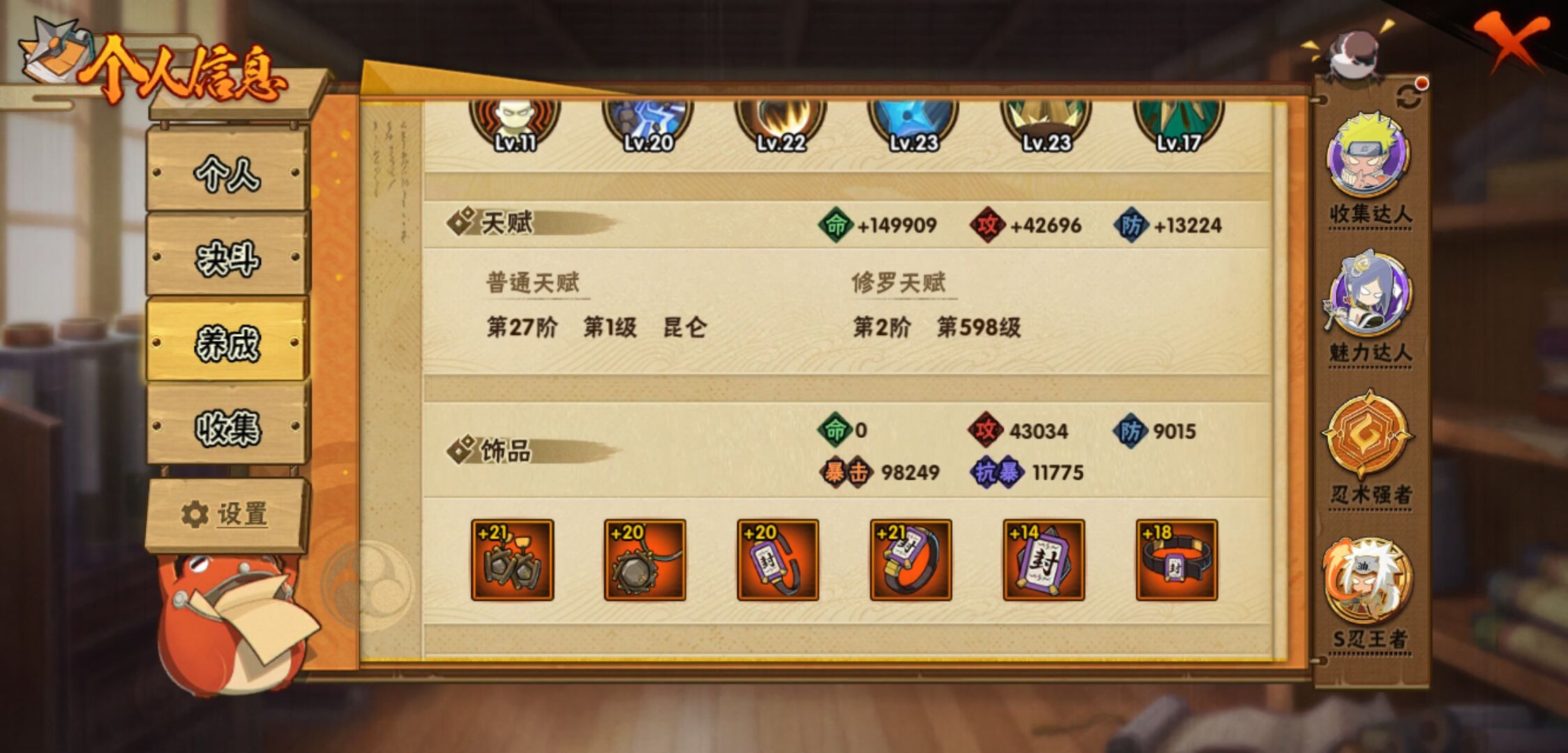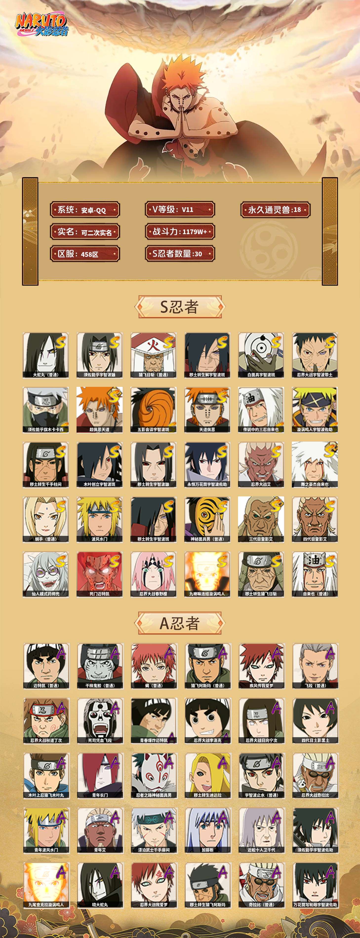 【火影忍者】【lyhy11450】战斗力:1179w;段位:上忍1阶;本服排名:159;vip:v11级;s忍:30个;a忍:45个;通灵兽:18个,s忍:秽土转生解宇智波斑|白面具宇智波斑|忍界大战宇智波带土|须佐能乎旗木卡卡西|超佩恩天道|五影会谈宇智波斑|天道佩恩|传说中的三忍自来也|漩涡鸣人宇智波佐助|秽土转生千手柱间|木叶创立宇智波斑|秽土转生宇智波鼬|永恒万花筒宇智波佐助|忍界大战艾|舞之豪杰自来也|大蛇丸(普通) 4星|纲手(普通)|波风水门|秽土转生宇智波斑|须佐能乎宇智波鼬 4星|神秘面具男(普通)|三代目雷影艾|四代目雷影艾|仙人模式药师兜|死门迈特凯|忍界大战春野樱|九喇嘛连结漩涡鸣人|猿飞日斩(普通) 4星|秽土转生猿飞日斩|自来也(普通)__a忍:青春爆炸迈特凯|忍界大战李洛克|忍界大战日向宁次|四代目土影黑土|木叶上忍猿飞木叶丸|青年长门|忍者之路神秘面具男|秽土转生迪达拉|宇智波止水(普通)|忍界大战奇拉比|青年波风水门|青年艾|漂泊武士千手扉间|加藤断|近松十人卫千代|须佐能乎宇智波佐助|九尾查克拉漩涡鸣人|晓大蛇丸|忍界大战秋道丁次 3星|忍界大战我爱罗|秽土转生猿飞阿斯玛|奇拉比(普通)|万花筒写轮眼宇智波佐助|五代目水影照美冥|五代目雷影达鲁伊|死司凭血飞段 3星|地怨虞角都|疾风传我爱罗 4星|迪达拉(普通)|飞段(普通) 4星|小南(普通)|仙人模式漩涡鸣人|万花筒写轮眼旗木卡卡西|迈特凯(普通) 5星|宇智波鼬(普通)|干柿鬼鲛(普通) 5星|秽土转生桃地再不斩|蝎(普通) 5星|绯流琥蝎|猿飞阿斯玛(普通) 5星|桃式显现漩涡博人|六代目水影长十郎|宇智波泉奈|忍界大战土台|初始形态机械鸣人__通灵兽:忍犬(普通)|蓝蛇|蛤蟆吉|忍龟|镰鼬|猿魔|山椒鱼|蜃|蛤蟆仙人|鲛鲨|蛤蟆健|砂之守鹤|乌鸦(普通)|蛞蝓(普通)|蛤蟆龙|蛤蟆广|梦貘|鹰1