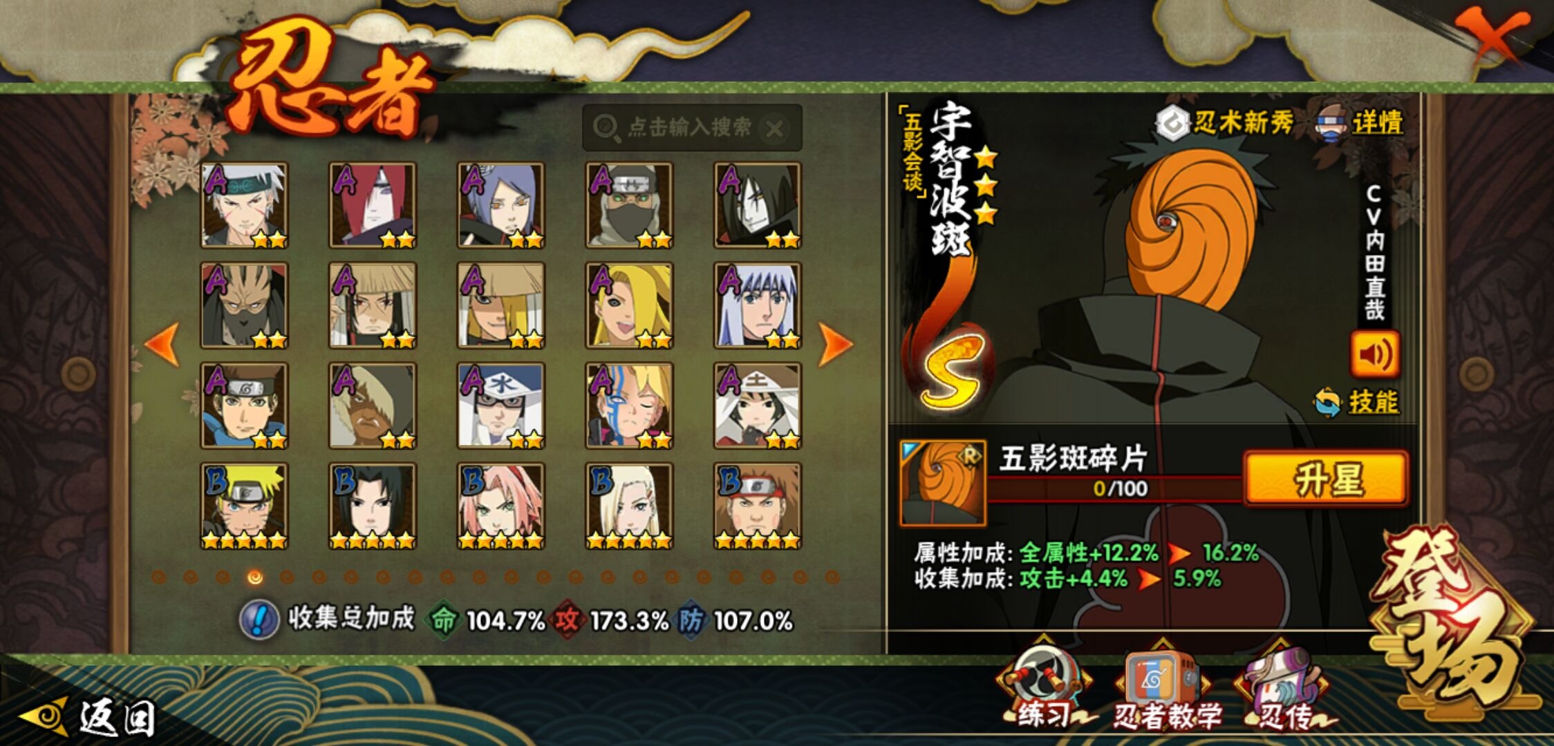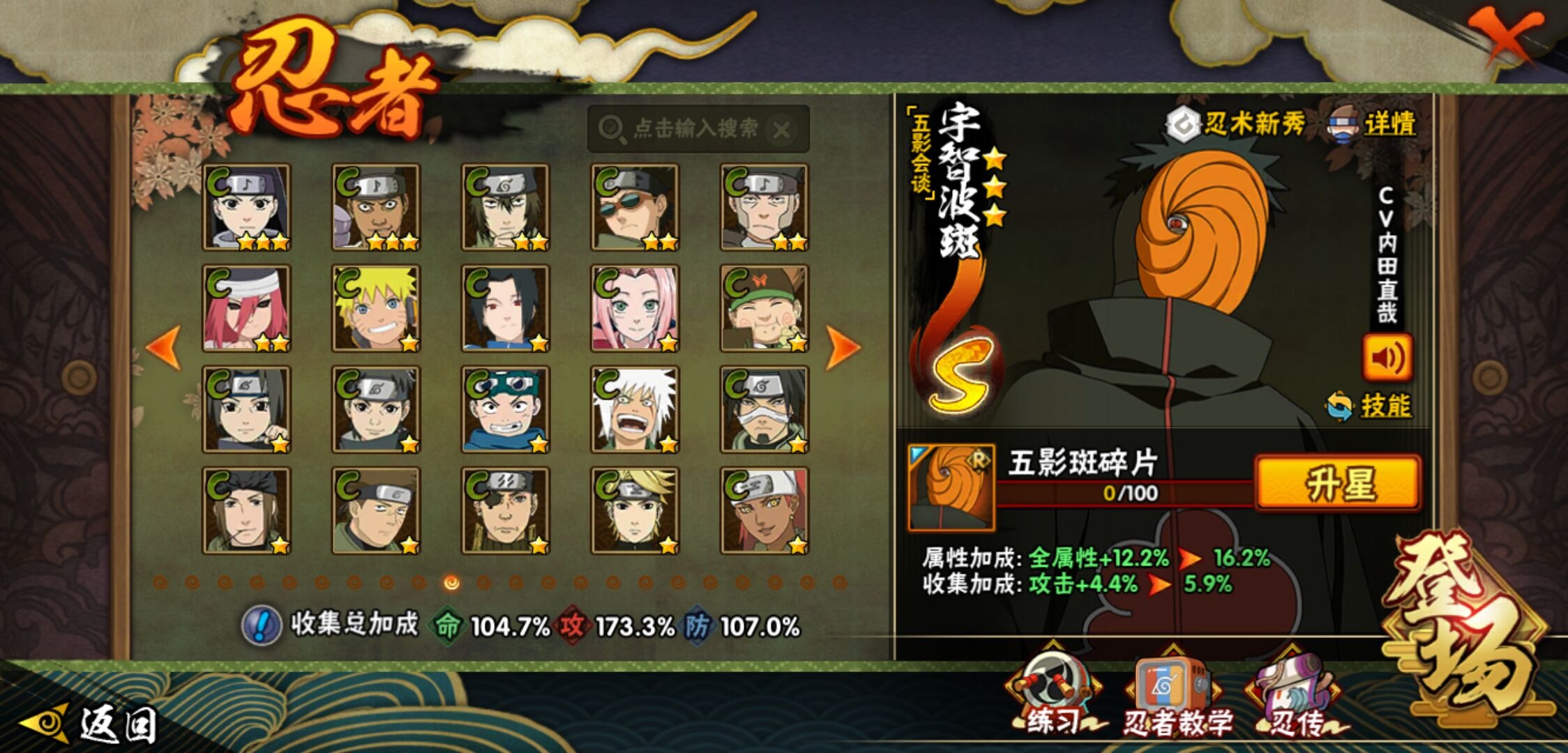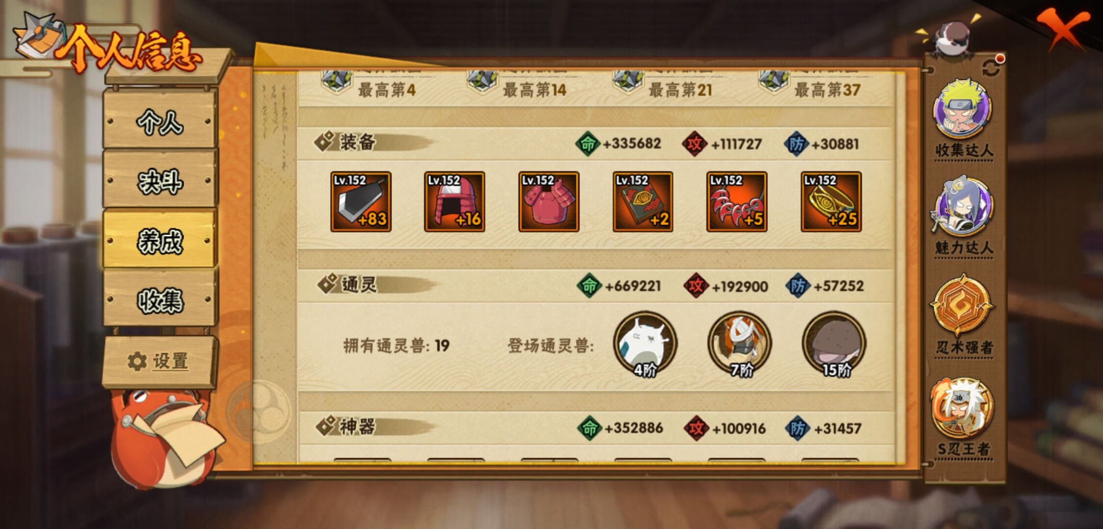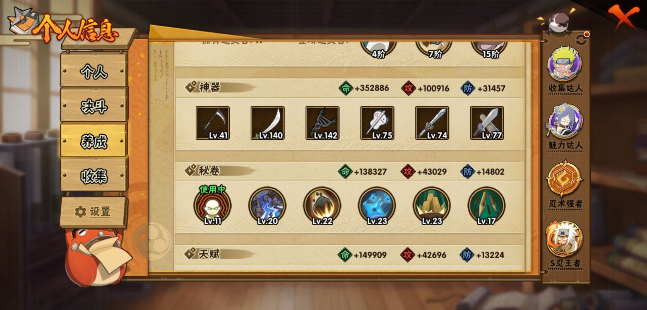 【火影忍者】【lyhy11450】战斗力:1179w;段位:上忍1阶;本服排名:159;vip:v11级;s忍:30个;a忍:45个;通灵兽:18个,s忍:秽土转生解宇智波斑|白面具宇智波斑|忍界大战宇智波带土|须佐能乎旗木卡卡西|超佩恩天道|五影会谈宇智波斑|天道佩恩|传说中的三忍自来也|漩涡鸣人宇智波佐助|秽土转生千手柱间|木叶创立宇智波斑|秽土转生宇智波鼬|永恒万花筒宇智波佐助|忍界大战艾|舞之豪杰自来也|大蛇丸(普通) 4星|纲手(普通)|波风水门|秽土转生宇智波斑|须佐能乎宇智波鼬 4星|神秘面具男(普通)|三代目雷影艾|四代目雷影艾|仙人模式药师兜|死门迈特凯|忍界大战春野樱|九喇嘛连结漩涡鸣人|猿飞日斩(普通) 4星|秽土转生猿飞日斩|自来也(普通)__a忍:青春爆炸迈特凯|忍界大战李洛克|忍界大战日向宁次|四代目土影黑土|木叶上忍猿飞木叶丸|青年长门|忍者之路神秘面具男|秽土转生迪达拉|宇智波止水(普通)|忍界大战奇拉比|青年波风水门|青年艾|漂泊武士千手扉间|加藤断|近松十人卫千代|须佐能乎宇智波佐助|九尾查克拉漩涡鸣人|晓大蛇丸|忍界大战秋道丁次 3星|忍界大战我爱罗|秽土转生猿飞阿斯玛|奇拉比(普通)|万花筒写轮眼宇智波佐助|五代目水影照美冥|五代目雷影达鲁伊|死司凭血飞段 3星|地怨虞角都|疾风传我爱罗 4星|迪达拉(普通)|飞段(普通) 4星|小南(普通)|仙人模式漩涡鸣人|万花筒写轮眼旗木卡卡西|迈特凯(普通) 5星|宇智波鼬(普通)|干柿鬼鲛(普通) 5星|秽土转生桃地再不斩|蝎(普通) 5星|绯流琥蝎|猿飞阿斯玛(普通) 5星|桃式显现漩涡博人|六代目水影长十郎|宇智波泉奈|忍界大战土台|初始形态机械鸣人__通灵兽:忍犬(普通)|蓝蛇|蛤蟆吉|忍龟|镰鼬|猿魔|山椒鱼|蜃|蛤蟆仙人|鲛鲨|蛤蟆健|砂之守鹤|乌鸦(普通)|蛞蝓(普通)|蛤蟆龙|蛤蟆广|梦貘|鹰1