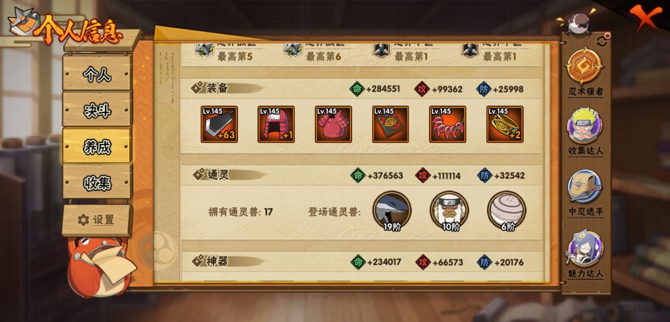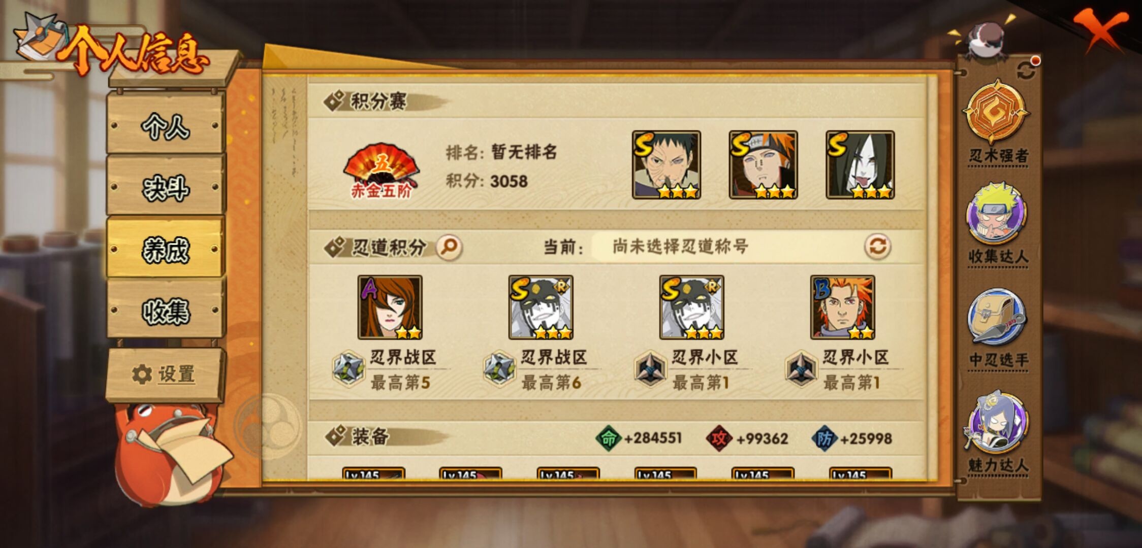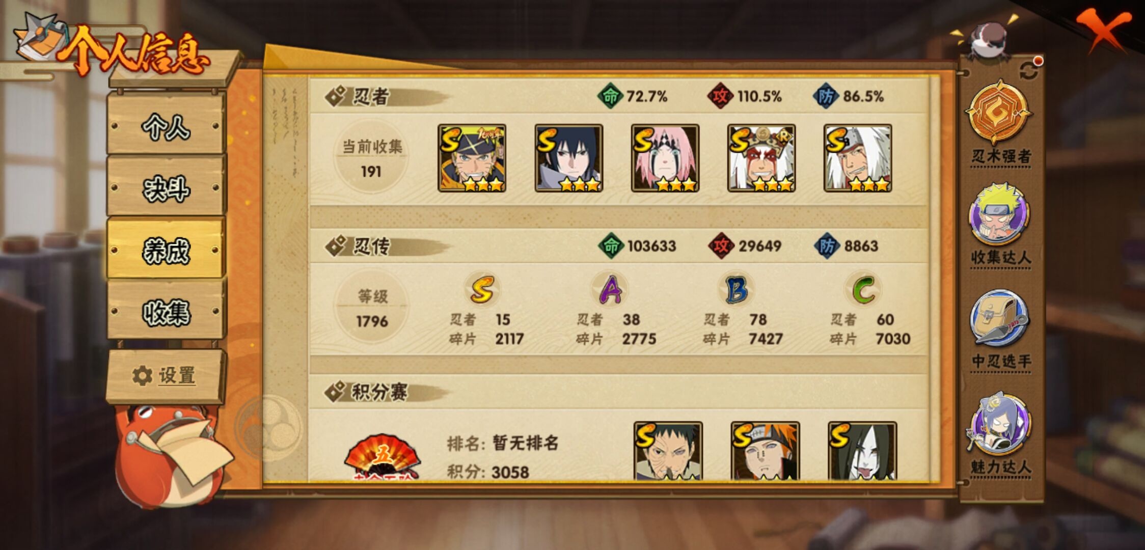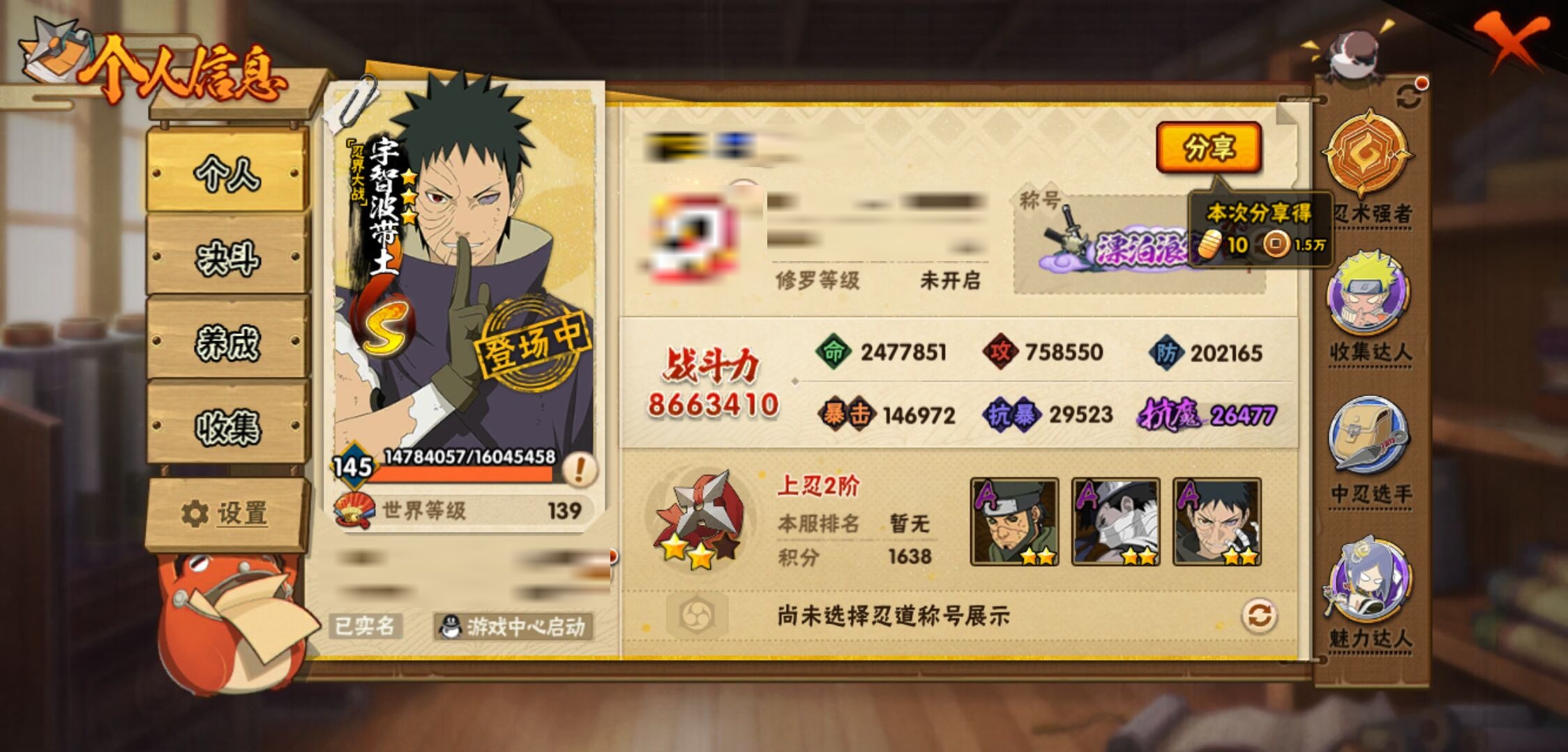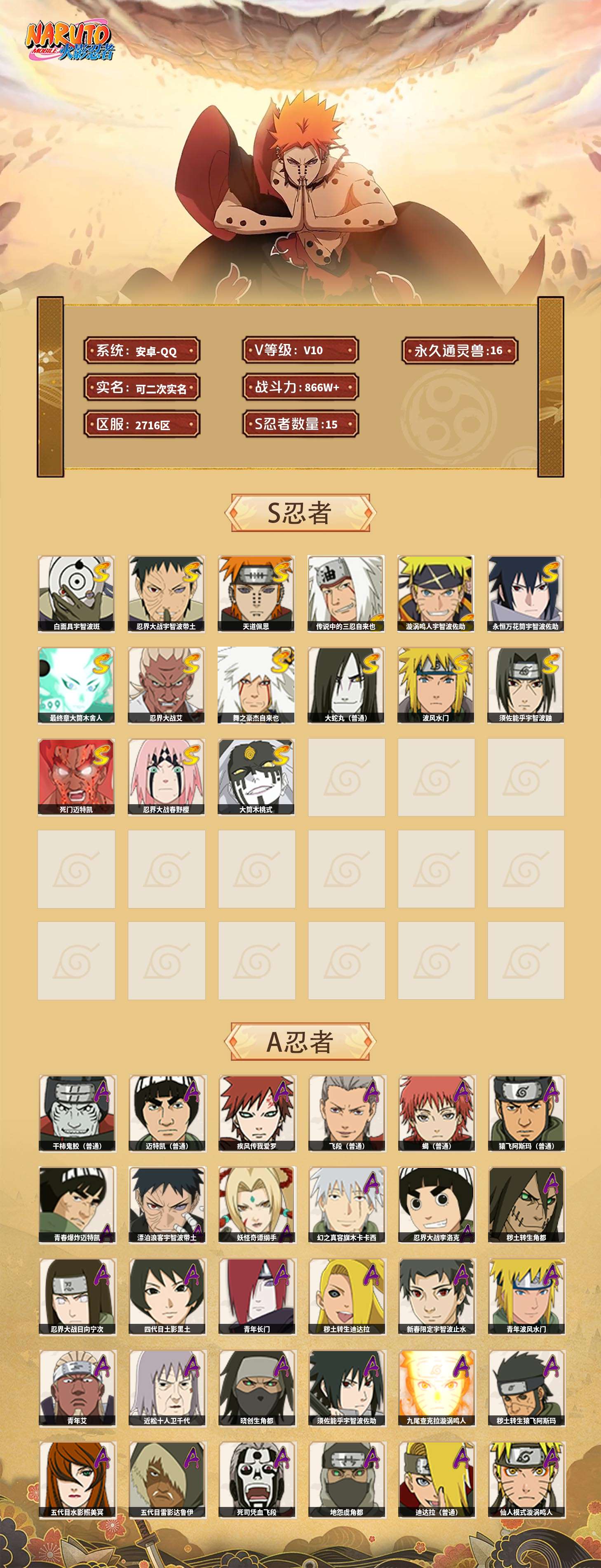 【火影忍者】【lyhy11452】战斗力:866w;段位:上忍2阶;本服排名:568;vip:v10级;s忍:15个;a忍:38个;通灵兽:16个,s忍:白面具宇智波斑|忍界大战宇智波带土|天道佩恩|传说中的三忍自来也|漩涡鸣人宇智波佐助|永恒万花筒宇智波佐助|最终章大筒木舍人|忍界大战艾|舞之豪杰自来也|大蛇丸(普通)|波风水门|须佐能乎宇智波鼬|死门迈特凯|忍界大战春野樱|大筒木桃式__a忍:青春爆炸迈特凯|漂泊浪客宇智波带土|妖怪奇谭纲手|幻之真容旗木卡卡西|忍界大战李洛克|秽土转生角都|忍界大战日向宁次|四代目土影黑土|青年长门|秽土转生迪达拉|新春限定宇智波止水|青年波风水门|青年艾|近松十人卫千代|晓创生角都|须佐能乎宇智波佐助|九尾查克拉漩涡鸣人|秽土转生猿飞阿斯玛|五代目水影照美冥|五代目雷影达鲁伊|死司凭血飞段|地怨虞角都|疾风传我爱罗 3星|迪达拉(普通)|飞段(普通) 3星|仙人模式漩涡鸣人|迈特凯(普通) 4星|宇智波鼬(普通)|干柿鬼鲛(普通) 5星|秽土转生桃地再不斩|蝎(普通) 3星|绯流琥蝎|猿飞阿斯玛(普通) 3星|桃式显现漩涡博人|最终章日向雏田|宇智波泉奈|羁绊神农|夏日限定黑土__通灵兽:忍犬(普通)|蓝蛇|蛤蟆吉|砂之守鹤|忍龟|镰鼬|猿魔|山椒鱼|蜃|蛤蟆仙人|鲛鲨|蛤蟆健|乌鸦(普通)|蛤蟆龙|蛞蝓(普通)|蛤蟆广【社交限制,但不影响游戏,介意勿拍】