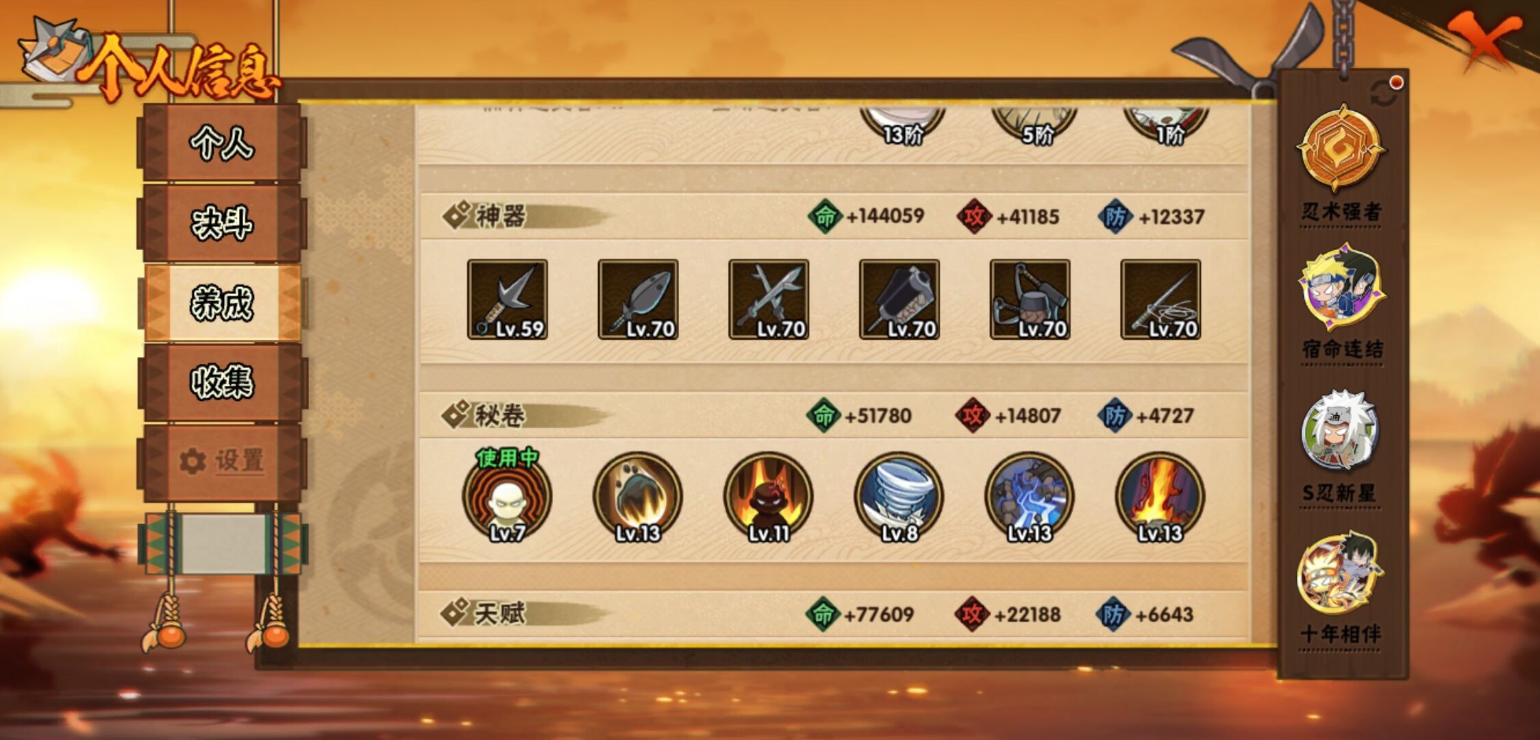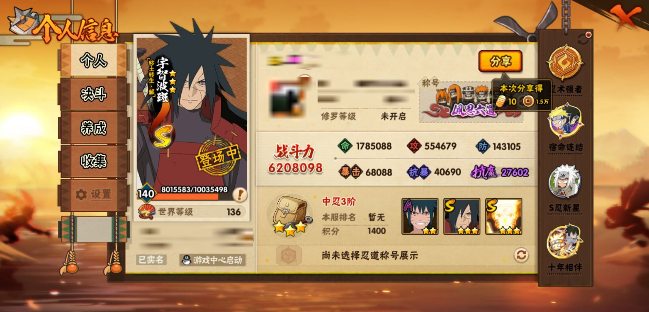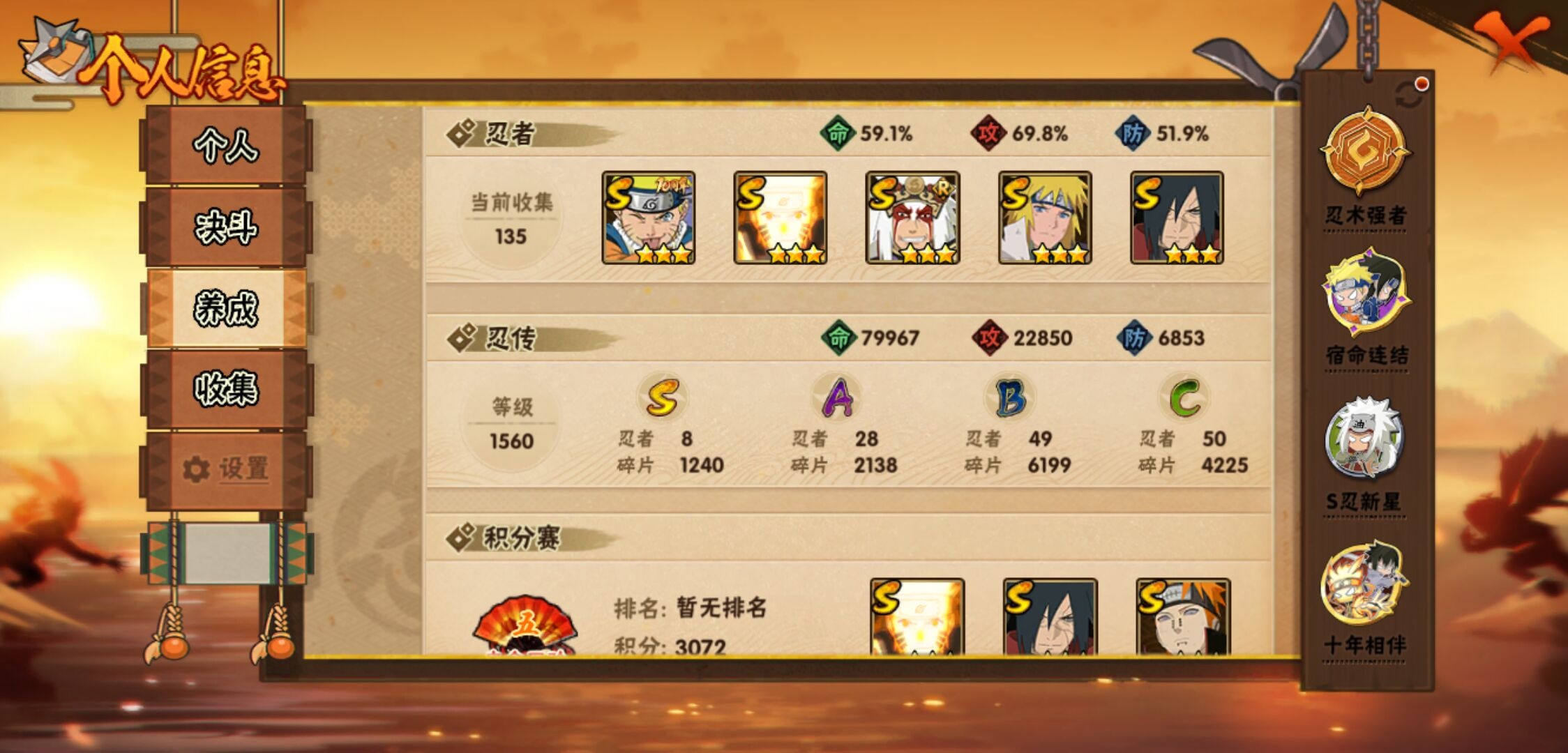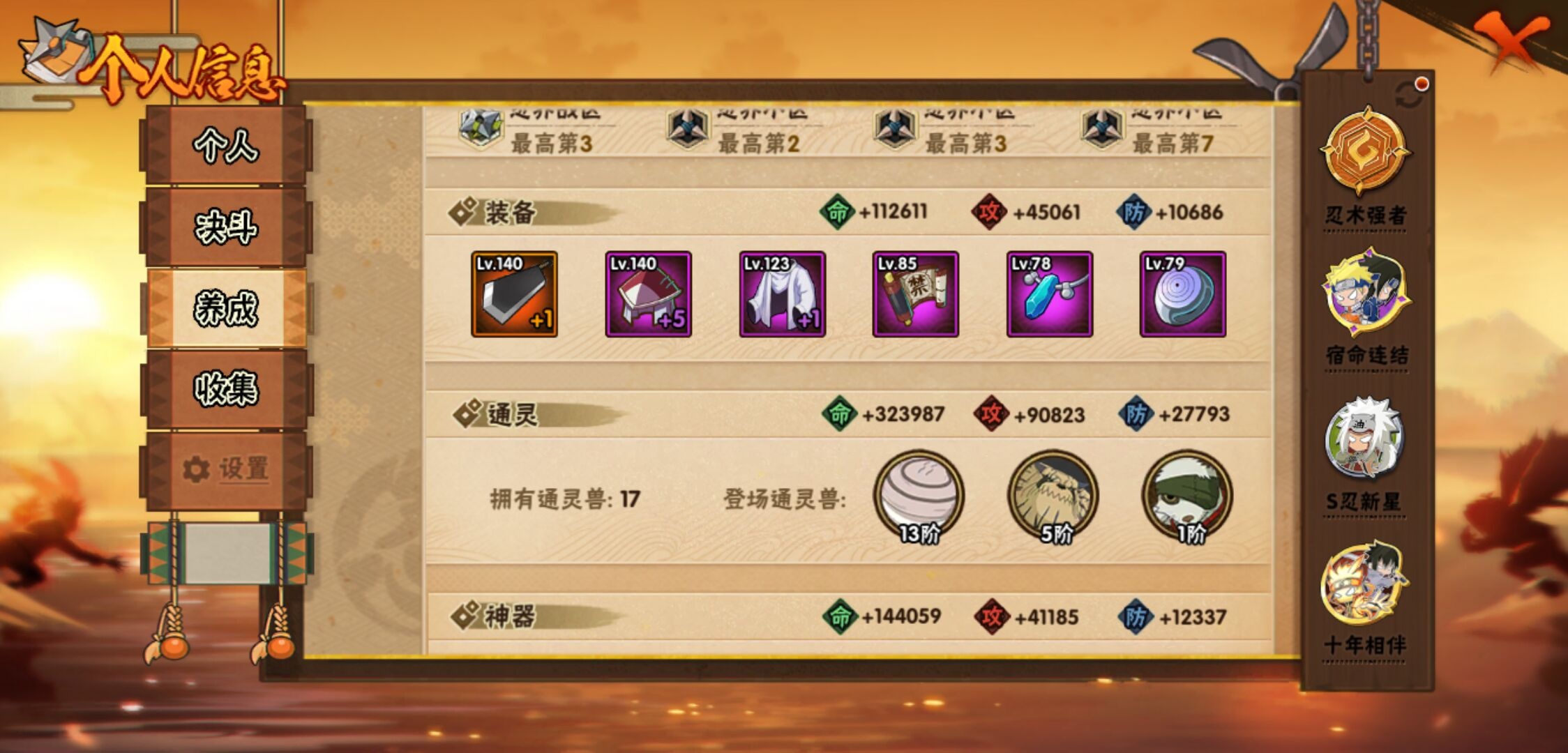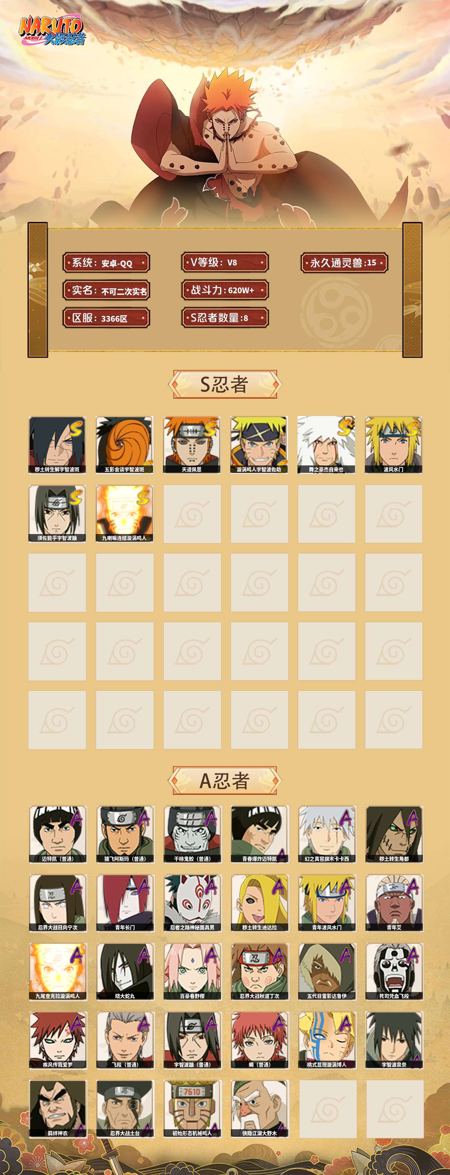 【火影忍者】【lyhy11455】战斗力:620w;段位:中忍3阶;本服排名:970;vip:v8级;s忍:8个;a忍:28个;通灵兽:15个,s忍:秽土转生解宇智波斑|五影会谈宇智波斑|天道佩恩|漩涡鸣人宇智波佐助|舞之豪杰自来也|波风水门|须佐能乎宇智波鼬|九喇嘛连结漩涡鸣人__a忍:青春爆炸迈特凯|幻之真容旗木卡卡西|秽土转生角都|忍界大战日向宁次|青年长门|忍者之路神秘面具男|秽土转生迪达拉|青年波风水门|青年艾|九尾查克拉漩涡鸣人|晓大蛇丸|百豪春野樱|忍界大战秋道丁次|五代目雷影达鲁伊|死司凭血飞段|疾风传我爱罗|飞段(普通)|迈特凯(普通) 5星|宇智波鼬(普通)|干柿鬼鲛(普通) 3星|蝎(普通)|猿飞阿斯玛(普通) 5星|桃式显现漩涡博人|宇智波泉奈|羁绊神农|忍界大战土台|初始形态机械鸣人|侠隐江湖大野木__通灵兽:忍犬(普通)|蓝蛇|蛤蟆吉|忍龟|镰鼬|猿魔|山椒鱼|蜃|蛤蟆仙人|鲛鲨|蛤蟆健|砂之守鹤|蛞蝓(普通)|乌鸦(普通)|蛤蟆龙