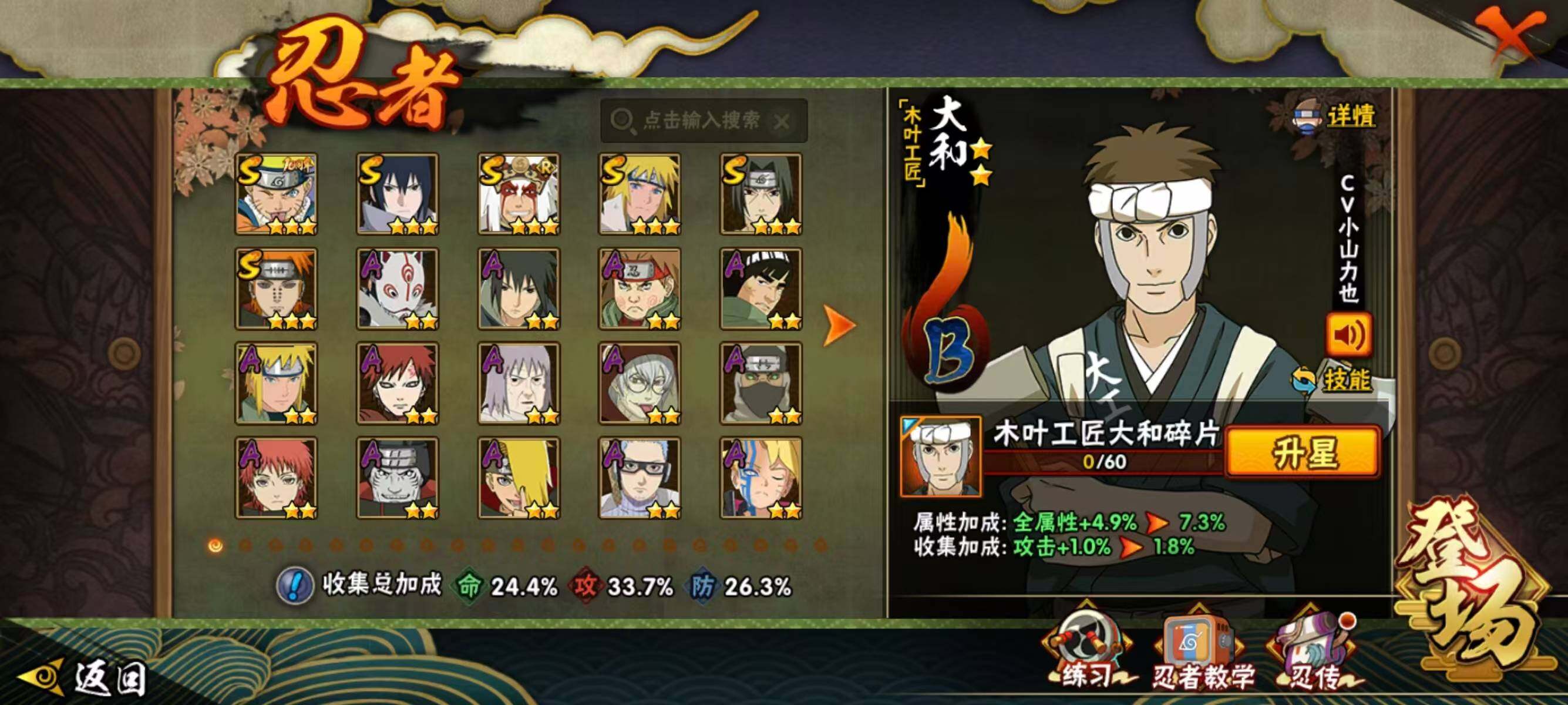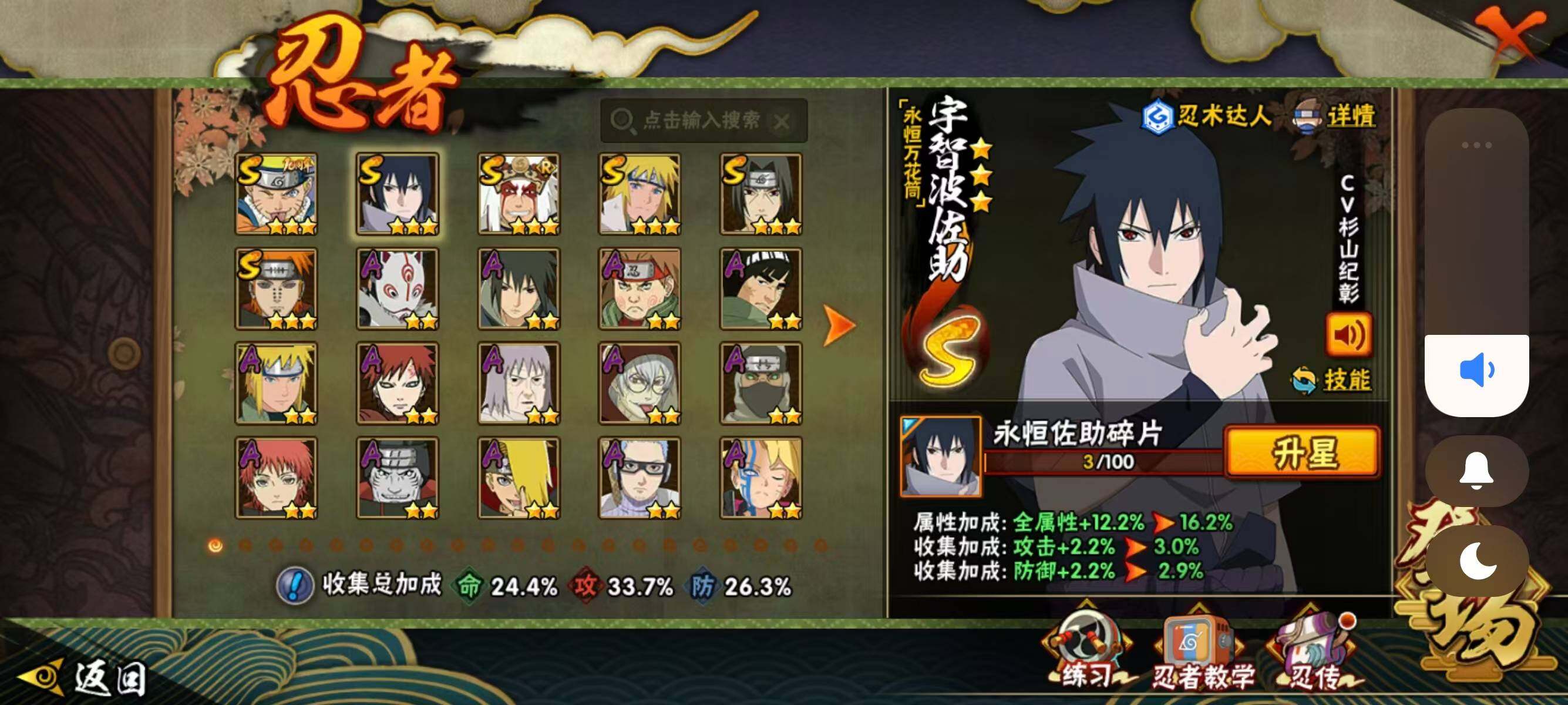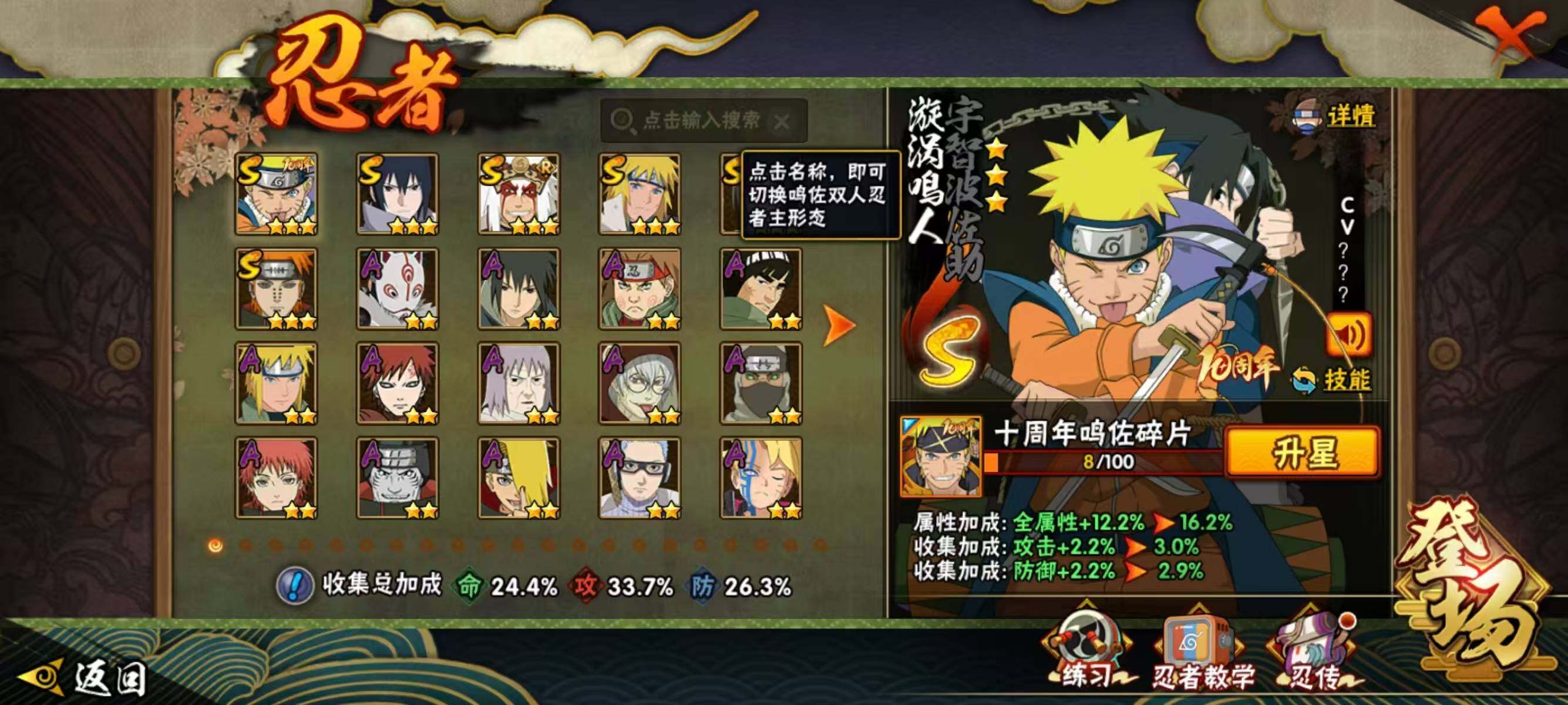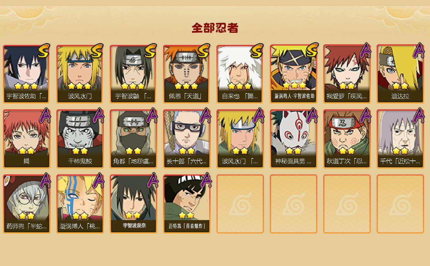 【209】【连体王者4传说】6s级忍者数-14a级忍者数 【s级忍者】:宇智波鼬「须佐能乎」3星,自来也「舞之豪杰」3星,波风水门3星,佩恩「天道」3星,宇智波佐助「永恒万花筒」3星,漩涡鸣人·宇智波佐助3星 【a级忍者】:波风水门「青年」2星,迪达拉2星,干柿鬼鲛2星,漩涡博人「桃式显现」2星,我爱罗「疾风传」2星,蝎2星,角都「地怨虞」2星,药师兜「半蛇斗篷」2星,长十郎「六代目水影」2星,神秘面具男「忍者之路」2星,秋道丁次「忍界大战」2星,千代「近松十人卫」2星,宇智波泉奈2星,迈特凯「青春爆炸」2星