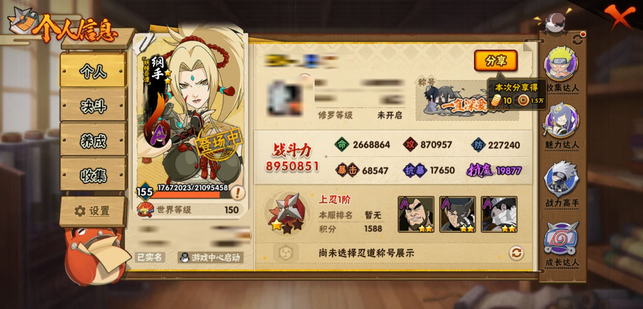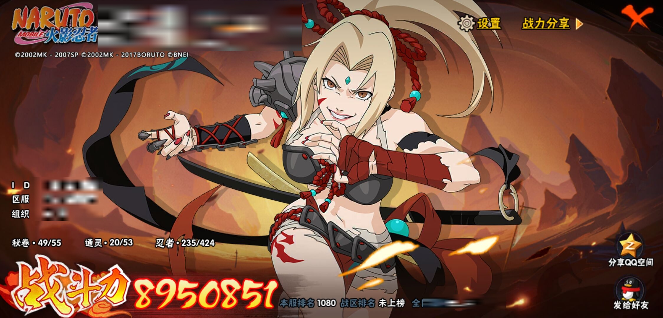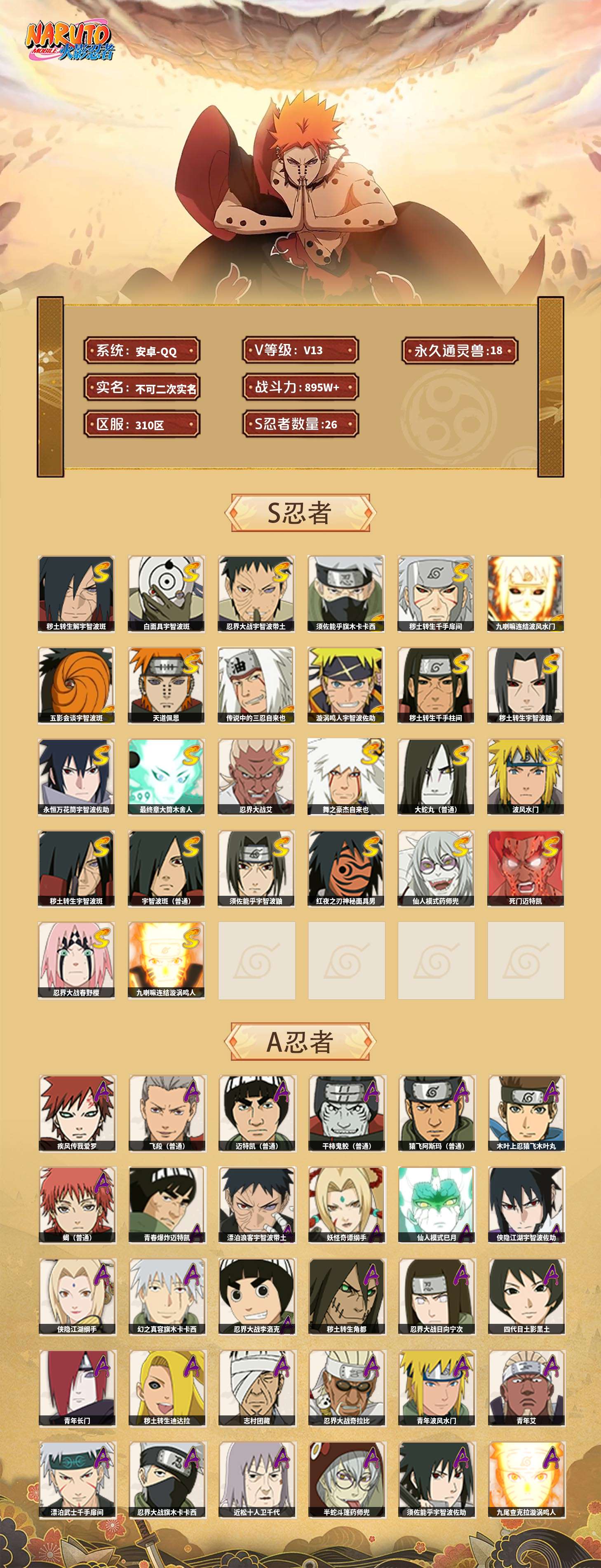 【火影忍者】【lyhy11461】战斗力:895w;段位:上忍1阶;本服排名:1080;vip:v13级;s忍:26个;a忍:51个;通灵兽:18个,s忍:秽土转生解宇智波斑|白面具宇智波斑|忍界大战宇智波带土|须佐能乎旗木卡卡西|秽土转生千手扉间|九喇嘛连结波风水门|五影会谈宇智波斑|天道佩恩|传说中的三忍自来也|漩涡鸣人宇智波佐助|秽土转生千手柱间|秽土转生宇智波鼬|永恒万花筒宇智波佐助|最终章大筒木舍人|忍界大战艾|舞之豪杰自来也|大蛇丸(普通)|波风水门|秽土转生宇智波斑|宇智波斑(普通)|须佐能乎宇智波鼬|红夜之刃神秘面具男|仙人模式药师兜|死门迈特凯|忍界大战春野樱|九喇嘛连结漩涡鸣人__a忍:青春爆炸迈特凯|漂泊浪客宇智波带土|妖怪奇谭纲手|仙人模式巳月|侠隐江湖宇智波佐助|侠隐江湖纲手|幻之真容旗木卡卡西|忍界大战李洛克|秽土转生角都|忍界大战日向宁次|四代目土影黑土|木叶上忍猿飞木叶丸 3星|青年长门|秽土转生迪达拉|志村团藏|忍界大战奇拉比|青年波风水门|青年艾|漂泊武士千手扉间|忍界大战旗木卡卡西|近松十人卫千代|半蛇斗篷药师兜|须佐能乎宇智波佐助|九尾查克拉漩涡鸣人|暴怒宇智波带土|晓大蛇丸|百豪春野樱|新春限定宇智波鼬|万花筒写轮眼宇智波佐助|五代目水影照美冥|五代目雷影达鲁伊|三船(普通)|死司凭血飞段|地怨虞角都|疾风传我爱罗 4星|飞段(普通) 4星|小南(普通)|仙人模式漩涡鸣人|万花筒写轮眼旗木卡卡西|迈特凯(普通) 4星|宇智波鼬(普通)|干柿鬼鲛(普通) 4星|秽土转生桃地再不斩|蝎(普通) 3星|绯流琥蝎|猿飞阿斯玛(普通) 4星|桃式显现漩涡博人|宇智波泉奈|羁绊神农|初始形态机械鸣人|侠隐江湖大野木__通灵兽:忍犬(普通)|蓝蛇|蛤蟆吉|忍龟|镰鼬|猿魔|山椒鱼|蜃|蛞蝓(普通)|蛤蟆仙人|鲛鲨|蛤蟆健|乌鸦(普通)|砂之守鹤|蛤蟆龙|蛤蟆广|梦貘|鹰