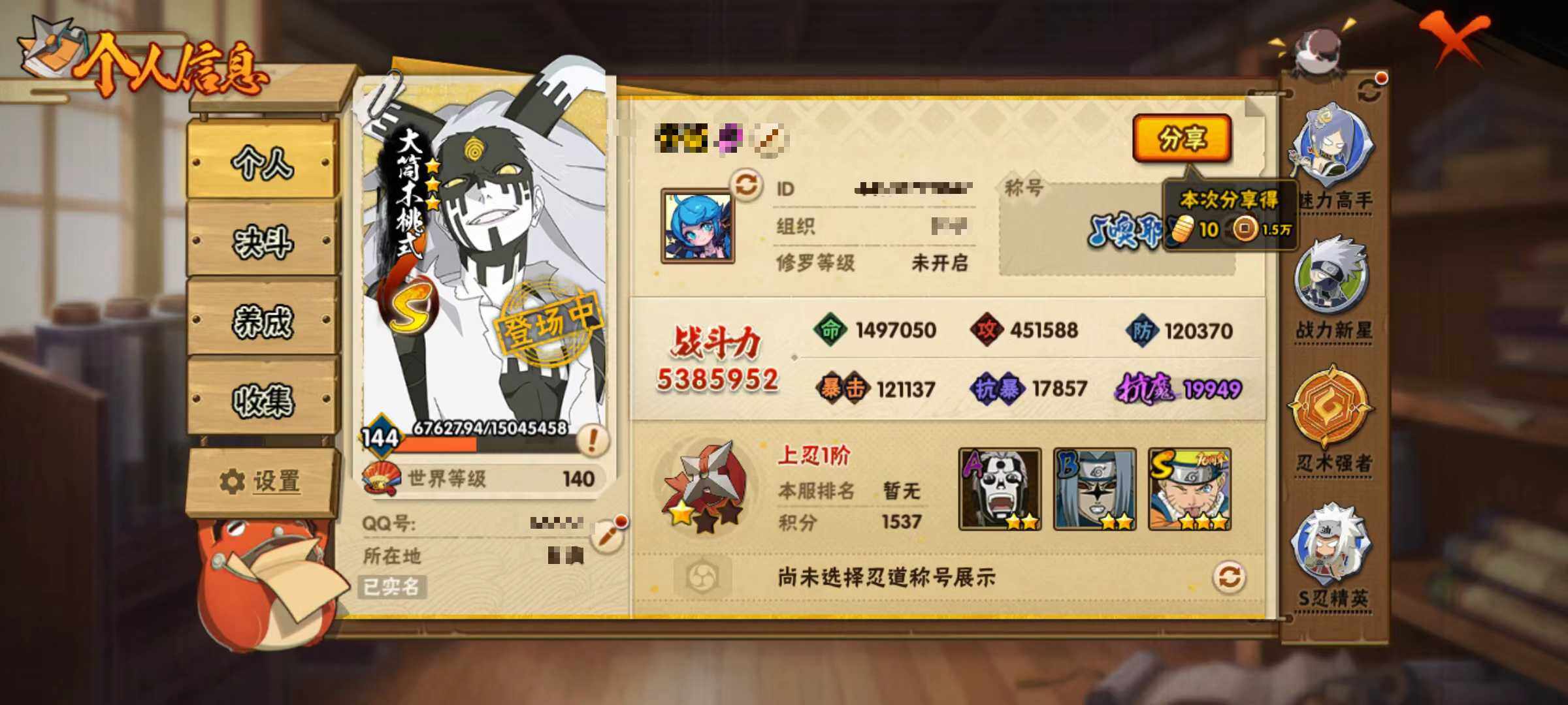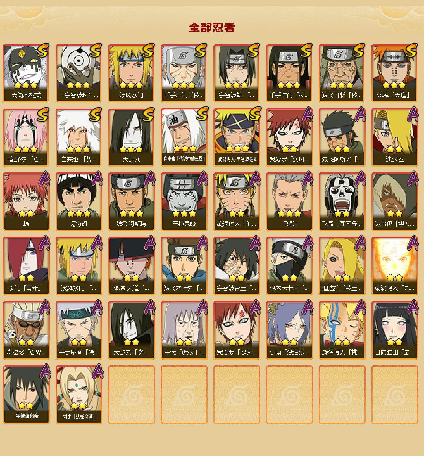 【hy550】13s级忍者数-29a级忍者数 【s级忍者】:猿飞日斩「秽土转生」3星,千手扉间「秽土转生」3星,千手柱间「秽土转生」3星,春野樱「忍界大战」3星,宇智波鼬「须佐能乎」3星,自来也「舞之豪杰」3星,大蛇丸3星,自来也「传说中的三忍」3星,波风水门3星,佩恩「天道」3星,宇智波斑 「白面具」3星宇智波斑「白面具」,大筒木桃式3星,漩涡鸣人·宇智波佐助3星 【a级忍者】:长门「青年」2星,波风水门「青年」2星,达鲁伊「博人传」2星,迪达拉2星,迪达拉「秽土转生」2星,大蛇丸「晓」2星,奇拉比「忍界大战」2星,飞段3星,飞段「死司凭血」2星,干柿鬼鲛3星,漩涡博人「桃式显现」2星,漩涡鸣人「仙人模式」2星,漩涡鸣人「九尾查克拉」2星,迈特凯3星,旗木卡卡西「忍界大战」2星,我爱罗「疾风传」2星,我爱罗「忍界大战」2星,蝎2星,小南「漂泊浪客」2星,猿飞阿斯玛3星,猿飞阿斯玛「秽土转生」2星,日向雏田「最终章」2星,宇智波带土「暴怒」2星,佩恩·六道「漂泊浪客」2星,猿飞木叶丸「博人传」2星,千手扉间「漂泊武士」2星,千代「近松十人卫」2星,宇智波泉奈2星,纲手「妖怪奇谭」2星