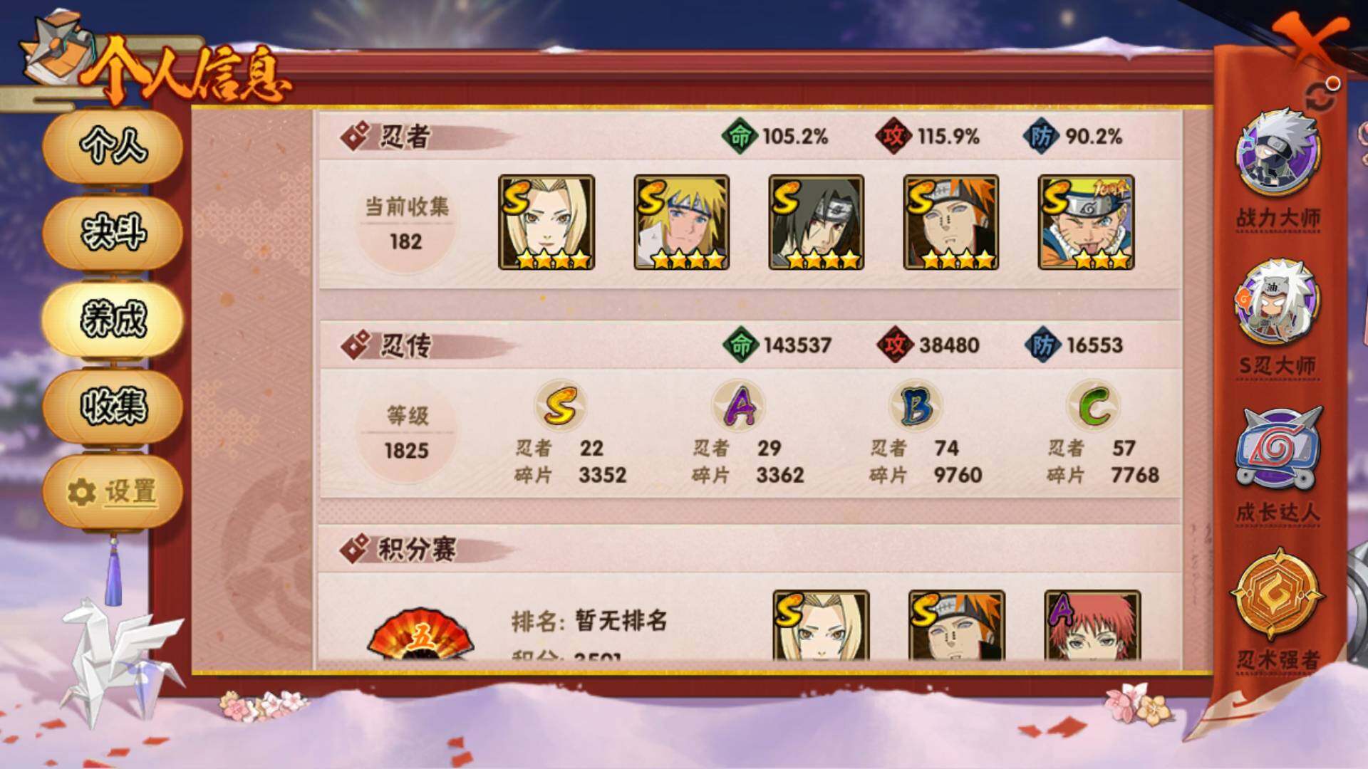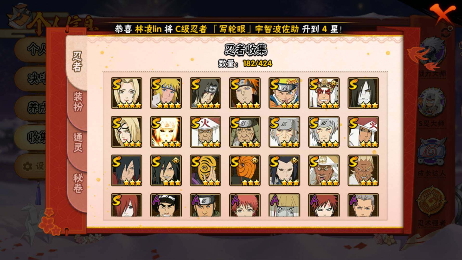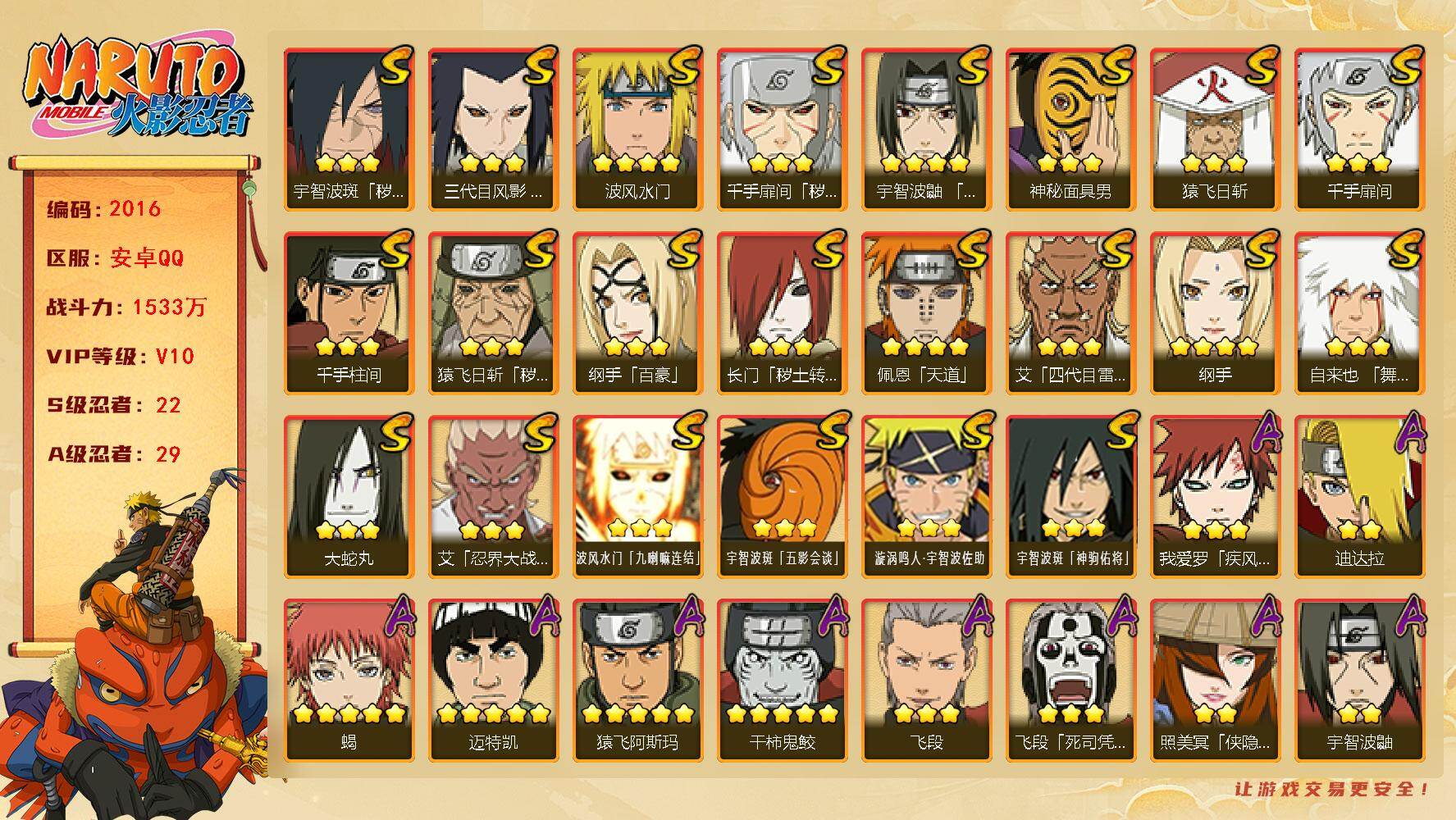 [16546256]可免费转苹果 v10 1533万战力 22s-29a 有熊猫 卡卡西78片 秽土柱间63片 传说自来也66片 ll5854 【s级忍者】:长门「秽土转生」3星,三代目风影「秽土转生」3星,猿飞日斩「秽土转生」3星,千手扉间「秽土转生」3星,宇智波斑「秽土转生·解」3星,艾「忍界大战」3星,宇智波鼬「须佐能乎」4星,艾「四代目雷影」3星,自来也「舞之豪杰」3星,大蛇丸3星,纲手4星,纲手「百豪」3星,千手柱间3星,千手扉间3星,猿飞日斩3星,波风水门4星,神秘面具男3星,佩恩「天道」4星,波风水门「九喇嘛连结」3星,宇智波斑「五影会谈」3星,漩涡鸣人·宇智波佐助3星,宇智波斑「神驹佑将」3星 【a级忍者】:波风水门「青年」2星,迪达拉2星,大蛇丸「晓」2星,奇拉比2星,飞段3星,飞段「死司凭血」3星,干柿鬼鲛5星,漩涡博人「桃式显现」2星,机械鸣人「初始形态」2星,迈特凯5星,旗木卡卡西「神威对决」2星,我爱罗「疾风传」3星,蝎5星,蝎「绯流琥」2星,猿飞阿斯玛5星,宇智波鼬2星,宇智波佐助「须佐能乎」2星,照美冥「侠隐江湖」2星,照美冥「五代目水影」2星,黑绝2星,神秘面具男「忍者之路」2星,李洛克「忍界大战」2星,秋道丁次「忍界大战」2星,千代「近松十人卫」2星,土台「忍界大战」2星,宇智波泉奈2星,不动2星,巳月「仙人模式」3星,迈特凯「青春爆炸」2星