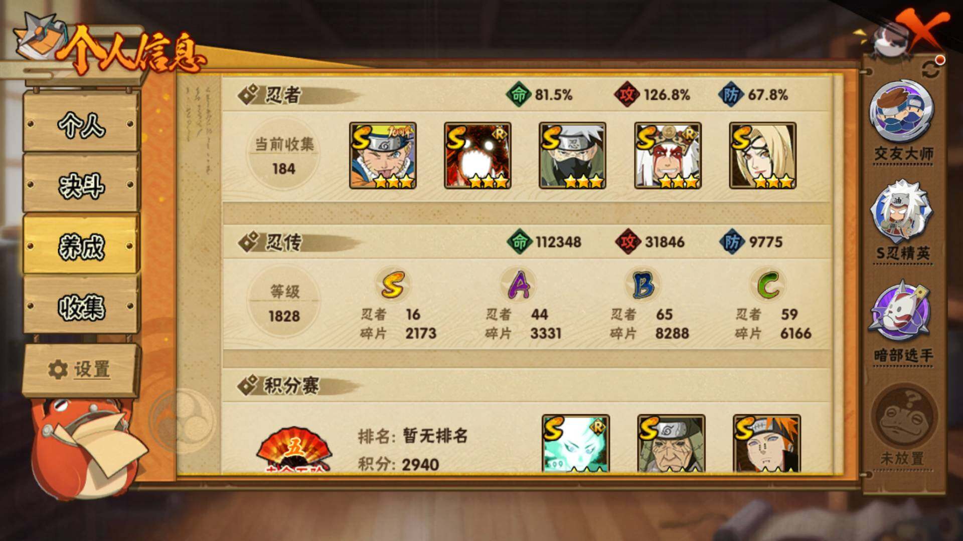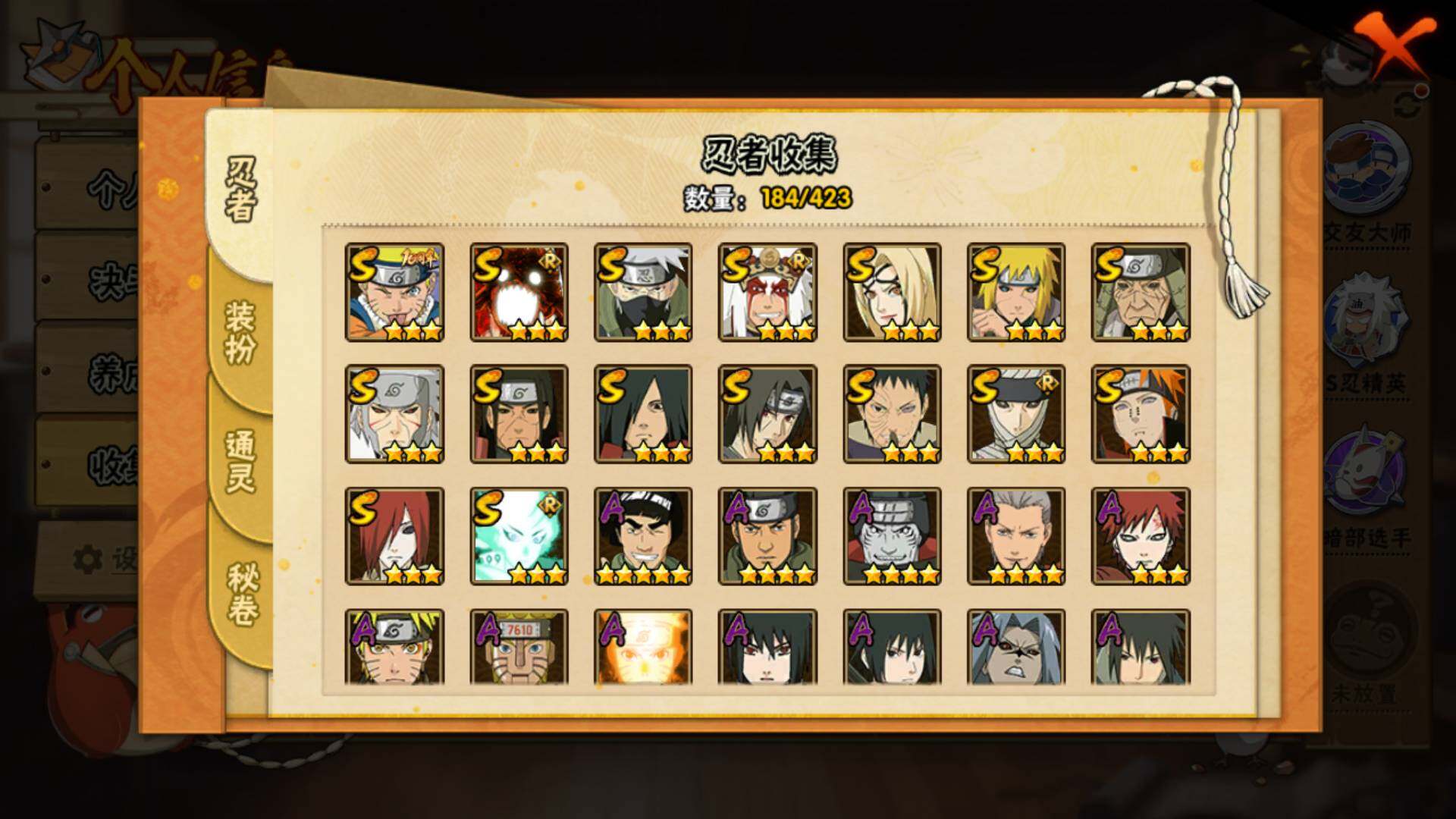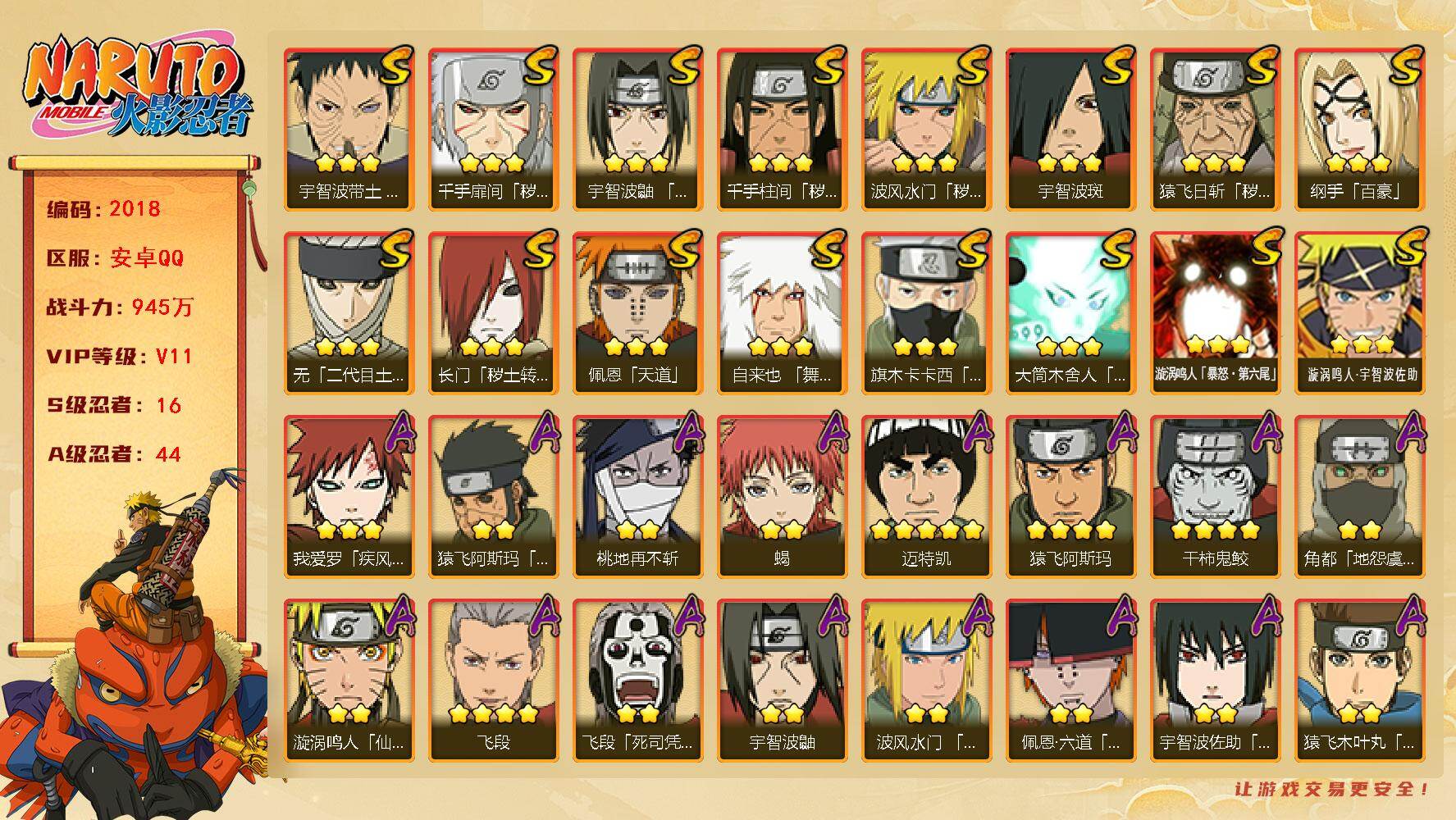 [16546407]可免费转苹果 v11 945万战力 16s-44a 有熊猫 天道超76片 九喇嘛水门64片 传说自来也86片 十尾带土83片 ll5856 【s级忍者】:长门「秽土转生」3星,猿飞日斩「秽土转生」3星,波风水门「秽土转生」3星,千手扉间「秽土转生」3星,千手柱间「秽土转生」3星,宇智波带土「忍界大战」3星,宇智波鼬「须佐能乎」3星,旗木卡卡西「须佐能乎」3星,无「二代目土影」3星,自来也「舞之豪杰」3星,纲手「百豪」3星,宇智波斑3星,佩恩「天道」3星,大筒木舍人「最终章」3星,漩涡鸣人「暴怒·第六尾」3星,漩涡鸣人·宇智波佐助3星 【a级忍者】:波风水门「青年」2星,大蛇丸「晓」2星,奇拉比「忍界大战」2星,飞段4星,飞段「死司凭血」2星,飞段「恶灵之影」2星,干柿鬼鲛4星,漩涡鸣人「仙人模式」2星,漩涡鸣人「九尾查克拉」2星,机械鸣人「初始形态」2星,迈特凯5星,旗木卡卡西「幻之真容」2星,桃地再不斩2星,桃地再不斩「秽土转生」2星,我爱罗「疾风传」3星,我爱罗「忍界大战」2星,蝎2星,小南「漂泊浪客」2星,角都「地怨虞」2星,角都「秽土转生」2星,猿飞阿斯玛4星,猿飞阿斯玛「秽土转生」2星,宇智波鼬2星,宇智波鼬「新春限定」2星,宇智波佐助「须佐能乎」2星,宇智波佐助「疾风传咒印」2星,宇智波佐助「万花筒写轮眼」2星,药师兜「半蛇斗篷」2星,照美冥「五代目水影」2星,宇智波带土「漂泊浪客」2星,佩恩·六道「漂泊浪客」2星,李洛克「忍界大战」2星,猿飞木叶丸「博人传」2星,黑土「夏日限定」2星,黑土「博人传」2星,春野樱「百豪」2星,秋道丁次「忍界大战」2星,千代「近松十人卫」2星,神农「羁绊」2星,土台「忍界大战」2星,地陆2星,宇智波泉奈2星,不动2星,迈特凯「青春爆炸」2星