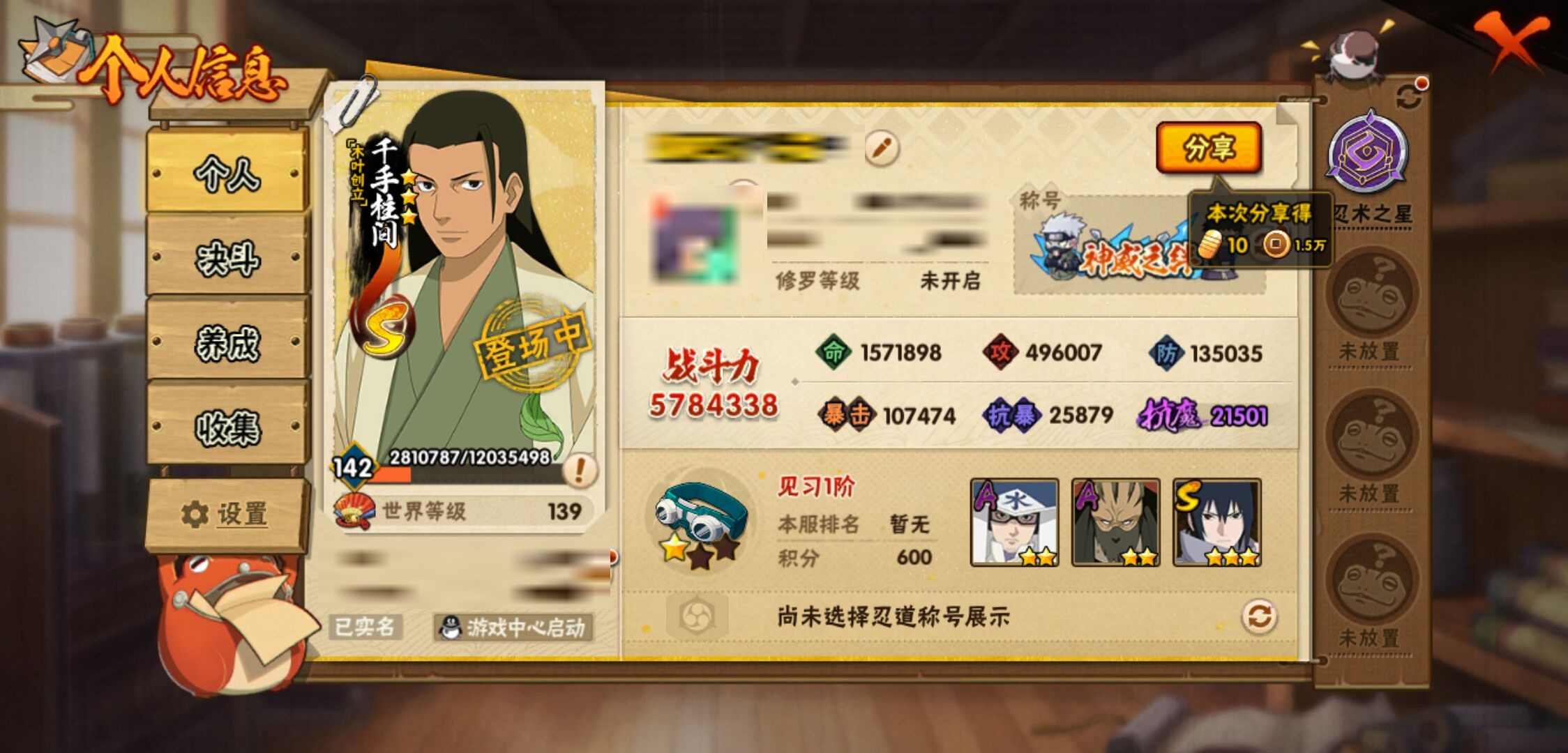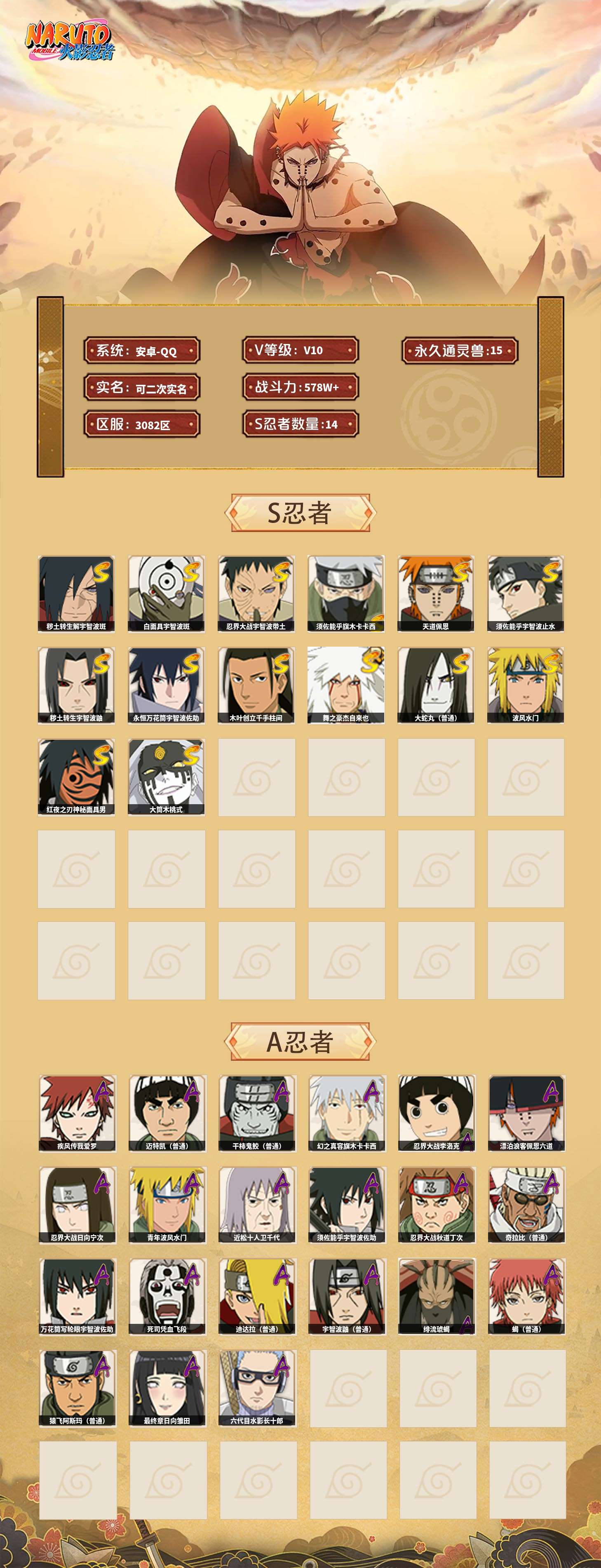 【火影忍者】【lyhy11474】战斗力:578w;段位:见习1阶;本服排名:1724;vip:v10级;s忍:14个;a忍:21个;通灵兽:15个,s忍:秽土转生解宇智波斑|白面具宇智波斑|忍界大战宇智波带土|须佐能乎旗木卡卡西|天道佩恩|须佐能乎宇智波止水|秽土转生宇智波鼬|永恒万花筒宇智波佐助|木叶创立千手柱间|舞之豪杰自来也|大蛇丸(普通)|波风水门|红夜之刃神秘面具男|大筒木桃式__a忍:幻之真容旗木卡卡西|忍界大战李洛克|漂泊浪客佩恩六道|忍界大战日向宁次|青年波风水门|近松十人卫千代|须佐能乎宇智波佐助|忍界大战秋道丁次|奇拉比(普通)|万花筒写轮眼宇智波佐助|死司凭血飞段|疾风传我爱罗 3星|迪达拉(普通)|迈特凯(普通) 3星|宇智波鼬(普通)|干柿鬼鲛(普通) 3星|绯流琥蝎|蝎(普通)|猿飞阿斯玛(普通)|最终章日向雏田|六代目水影长十郎__通灵兽:忍犬(普通)|蓝蛇|蛤蟆吉|忍龟|镰鼬|猿魔|山椒鱼|蜃|熊猫|砂之守鹤|蛤蟆仙人|鲛鲨|蛤蟆健|乌鸦(普通)|蛤蟆龙