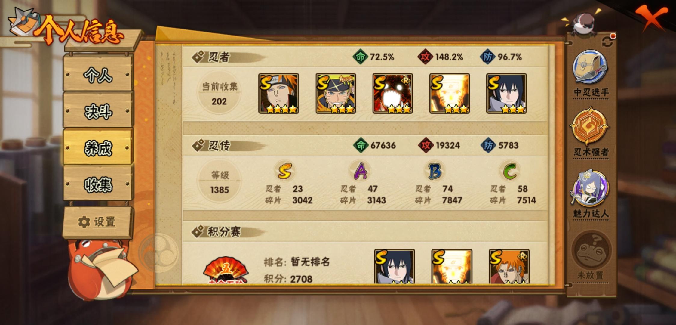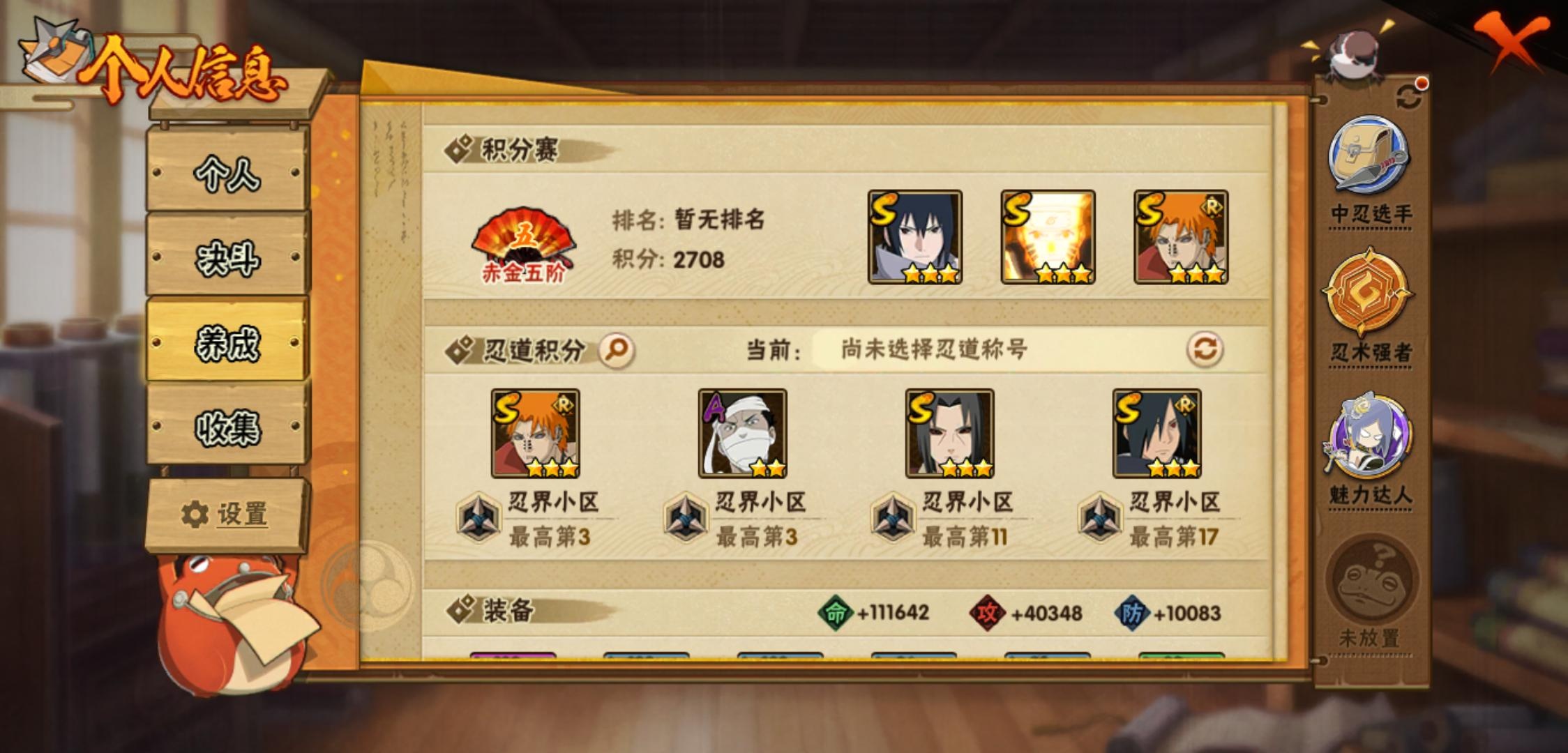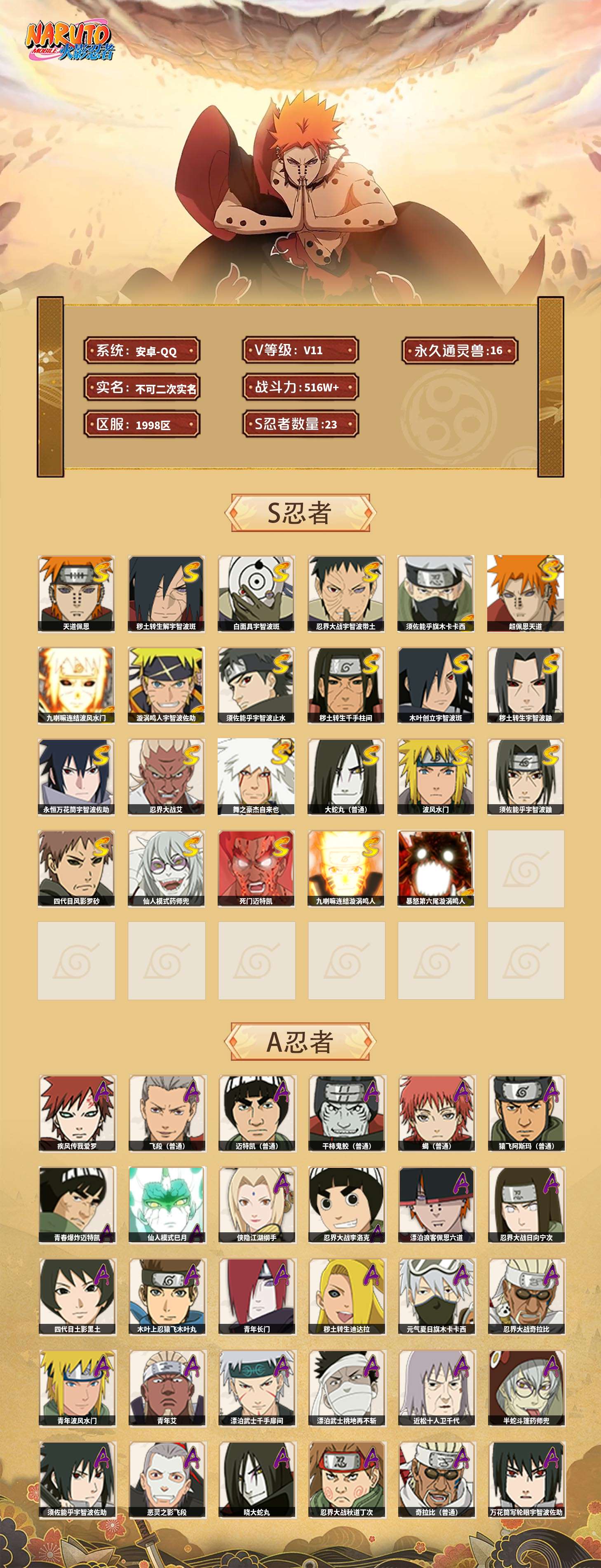 【火影忍者】【lyhy11470】战斗力:516w;段位:中忍1阶;vip:v11级;s忍:23个;a忍:47个;通灵兽:16个,s忍:秽土转生解宇智波斑|白面具宇智波斑|忍界大战宇智波带土|须佐能乎旗木卡卡西|超佩恩天道|九喇嘛连结波风水门|天道佩恩 4星|漩涡鸣人宇智波佐助|须佐能乎宇智波止水|秽土转生千手柱间|木叶创立宇智波斑|秽土转生宇智波鼬|永恒万花筒宇智波佐助|忍界大战艾|舞之豪杰自来也|大蛇丸(普通)|波风水门|须佐能乎宇智波鼬|四代目风影罗砂|仙人模式药师兜|死门迈特凯|九喇嘛连结漩涡鸣人|暴怒第六尾漩涡鸣人__a忍:青春爆炸迈特凯|仙人模式巳月|侠隐江湖纲手|忍界大战李洛克|漂泊浪客佩恩六道|忍界大战日向宁次|四代目土影黑土|木叶上忍猿飞木叶丸|青年长门|秽土转生迪达拉|元气夏日旗木卡卡西|忍界大战奇拉比|青年波风水门|青年艾|漂泊武士千手扉间|漂泊武士桃地再不斩|近松十人卫千代|半蛇斗篷药师兜|须佐能乎宇智波佐助|恶灵之影飞段|晓大蛇丸|忍界大战秋道丁次|奇拉比(普通)|万花筒写轮眼宇智波佐助|五代目水影照美冥|五代目雷影达鲁伊|死司凭血飞段|角都(普通)|疾风传我爱罗 4星|迪达拉(普通)|飞段(普通) 3星|漂泊浪客小南|仙人模式漩涡鸣人|迈特凯(普通) 3星|宇智波鼬(普通)|干柿鬼鲛(普通) 3星|秽土转生桃地再不斩|蝎(普通) 3星|绯流琥蝎|猿飞阿斯玛(普通) 3星|桃式显现漩涡博人|最终章日向雏田|六代目水影长十郎|不动|宇智波泉奈|羁绊神农|侠隐江湖大野木__通灵兽:忍犬(普通)|蓝蛇|蛤蟆吉|忍龟|镰鼬|猿魔|砂之守鹤|山椒鱼|蛞蝓(普通)|蜃|蛤蟆仙人|鲛鲨|蛤蟆健|熊猫|乌鸦(普通)|蛤蟆龙
