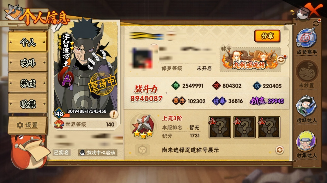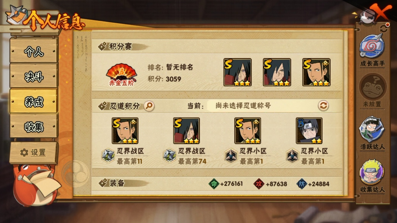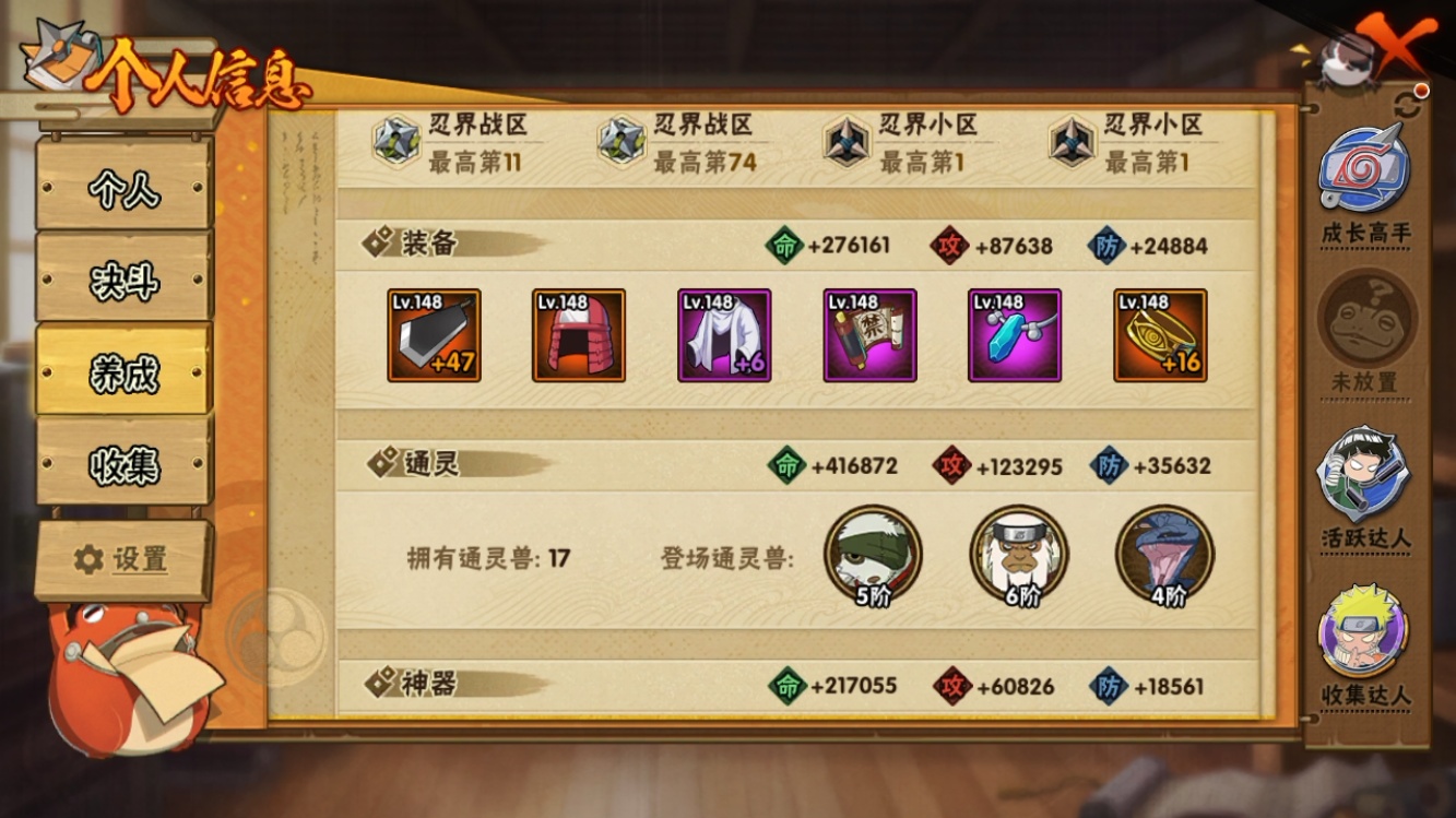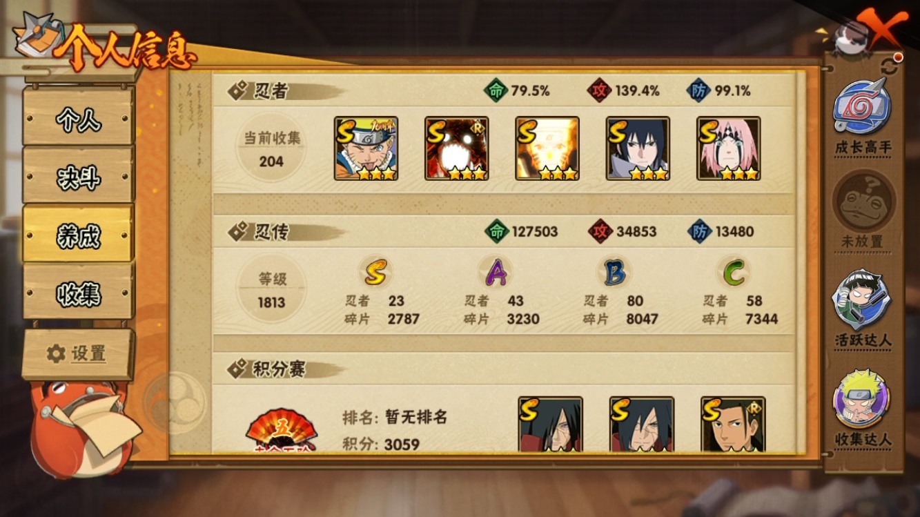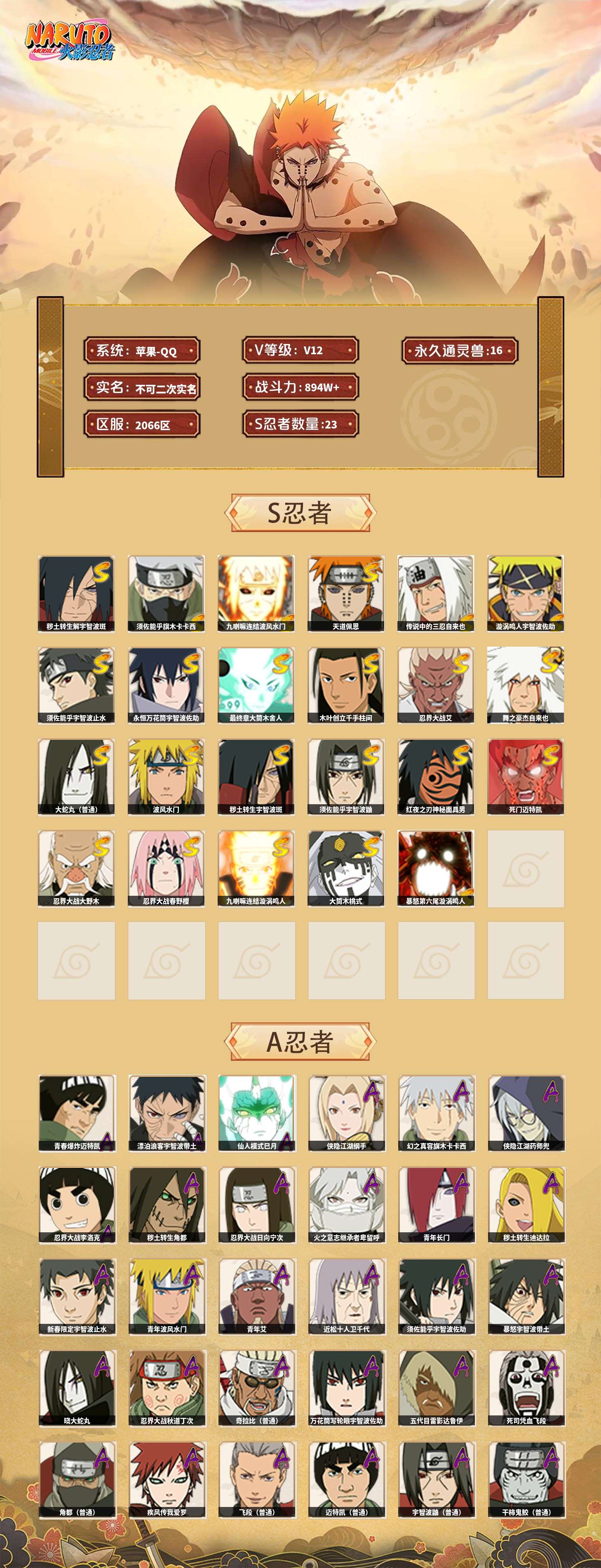 【火影忍者】【lyhy11479】战斗力:894w;段位:上忍3阶;本服排名:398;vip:v12级;s忍:23个;a忍:43个;通灵兽:16个,s忍:秽土转生解宇智波斑|须佐能乎旗木卡卡西|九喇嘛连结波风水门|天道佩恩|传说中的三忍自来也|漩涡鸣人宇智波佐助|须佐能乎宇智波止水|永恒万花筒宇智波佐助|最终章大筒木舍人|木叶创立千手柱间|忍界大战艾|舞之豪杰自来也|大蛇丸(普通)|波风水门|秽土转生宇智波斑|须佐能乎宇智波鼬|红夜之刃神秘面具男|死门迈特凯|忍界大战大野木|忍界大战春野樱|九喇嘛连结漩涡鸣人|大筒木桃式|暴怒第六尾漩涡鸣人__a忍:青春爆炸迈特凯|漂泊浪客宇智波带土|仙人模式巳月|侠隐江湖纲手|幻之真容旗木卡卡西|侠隐江湖药师兜|忍界大战李洛克|秽土转生角都|忍界大战日向宁次|火之意志继承者卑留呼|青年长门|秽土转生迪达拉|新春限定宇智波止水|青年波风水门|青年艾|近松十人卫千代|须佐能乎宇智波佐助|暴怒宇智波带土|晓大蛇丸|忍界大战秋道丁次|奇拉比(普通)|万花筒写轮眼宇智波佐助|五代目雷影达鲁伊|死司凭血飞段|角都(普通)|疾风传我爱罗|飞段(普通)|迈特凯(普通)|宇智波鼬(普通)|干柿鬼鲛(普通)|秽土转生桃地再不斩|绯流琥蝎|蝎(普通)|猿飞阿斯玛(普通)|桃式显现漩涡博人|最终章日向雏田|六代目水影长十郎|不缘|新春限定大蛇丸|不动|宇智波泉奈|羁绊神农|初始形态机械鸣人__通灵兽:忍犬(普通)|蓝蛇|蛤蟆吉|忍龟|镰鼬|猿魔|砂之守鹤|山椒鱼|蜃|蛤蟆仙人|鲛鲨|蛤蟆健|乌鸦(普通)|蛤蟆龙|蛞蝓侠隐江湖|蛤蟆广