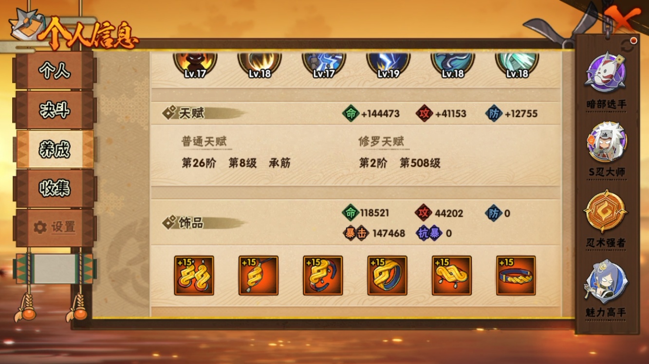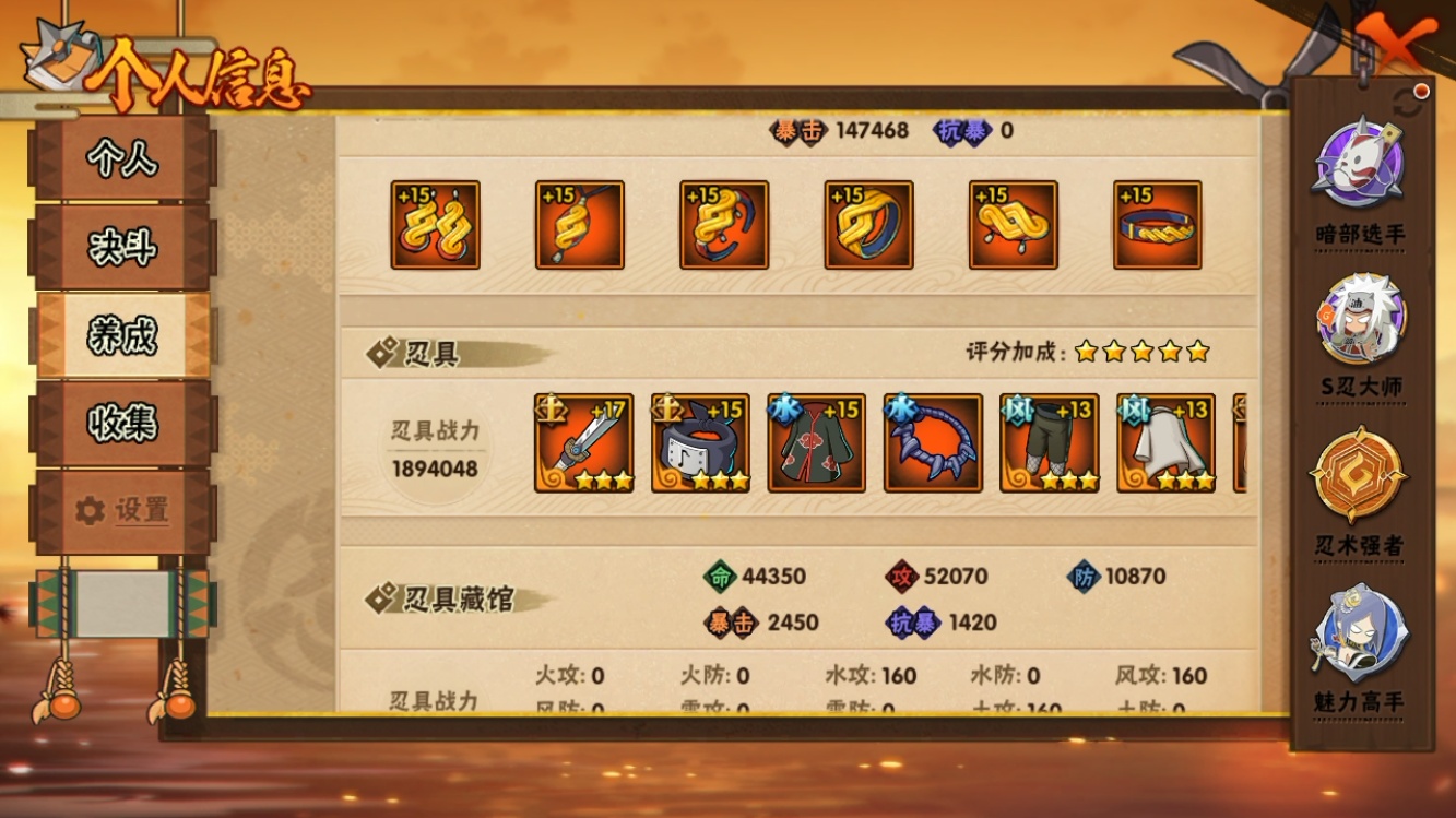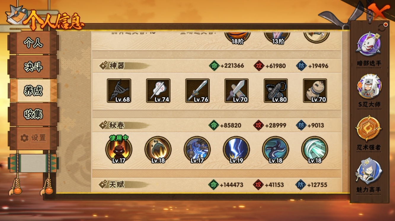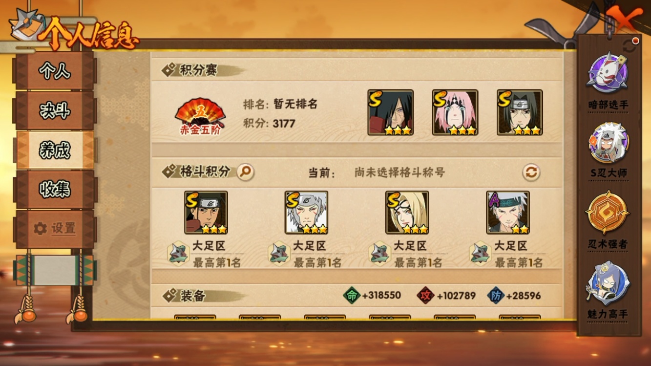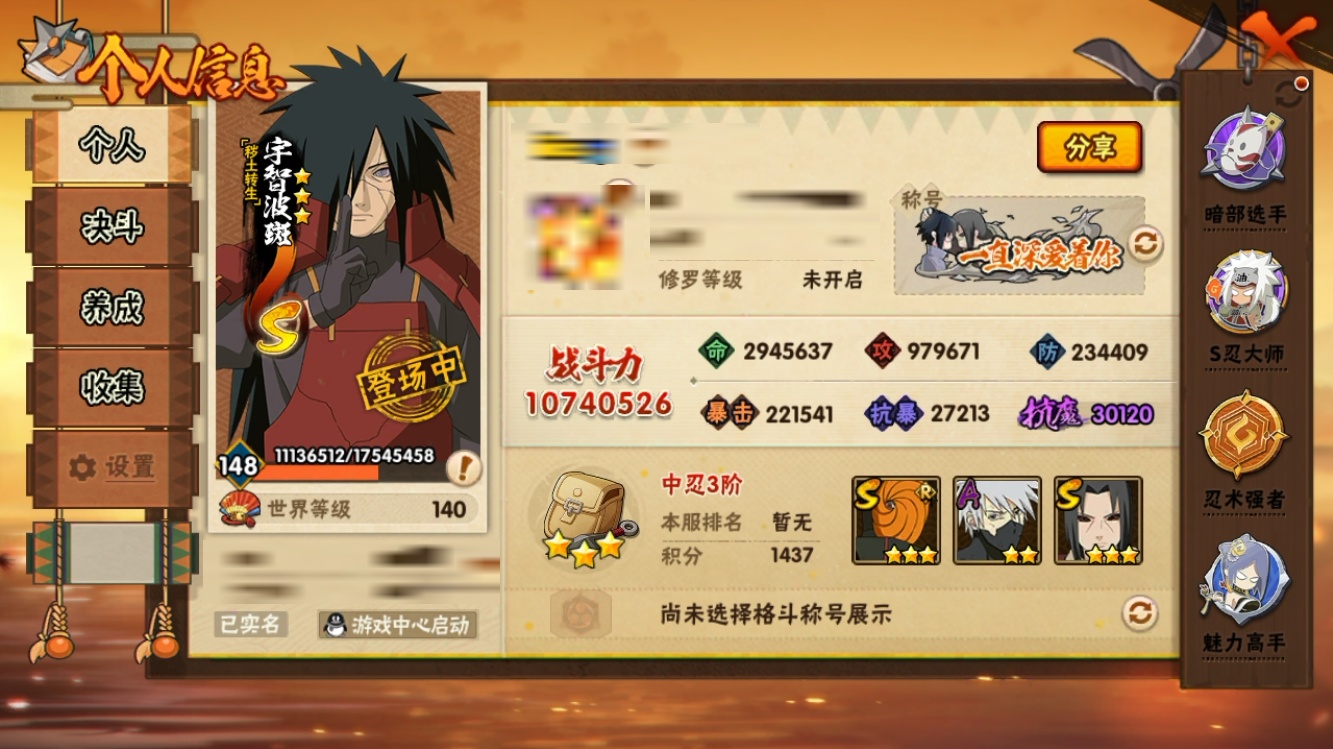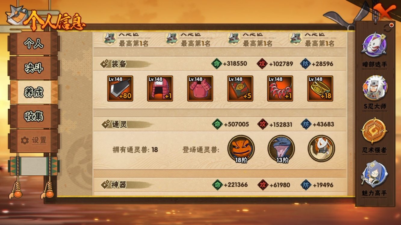 【火影忍者】【lyhy11454】战斗力:1074w;段位:中忍3阶;本服排名:241;vip:v9级;s忍:25个;a忍:39个;通灵兽:17个,s忍:秽土转生解宇智波斑|白面具宇智波斑|忍界大战宇智波带土|须佐能乎旗木卡卡西|秽土转生千手扉间|五影会谈宇智波斑|天道佩恩|漩涡鸣人宇智波佐助|秽土转生宇智波鼬|永恒万花筒宇智波佐助|忍界大战艾|舞之豪杰自来也|大蛇丸(普通)|百豪纲手|纲手(普通)|波风水门|秽土转生波风水门|千手扉间(普通)|千手柱间(普通)|秽土转生宇智波斑|须佐能乎宇智波鼬|仙人模式药师兜|忍界大战春野樱|九喇嘛连结漩涡鸣人|猿飞日斩(普通)__a忍:青春爆炸迈特凯|仙人模式巳月|幻之真容旗木卡卡西|忍界大战日向宁次|四代目土影黑土|木叶上忍猿飞木叶丸|秽土转生迪达拉|志村团藏|宇智波止水(普通)|青年波风水门|青年艾|漂泊武士千手扉间|近松十人卫千代|半蛇斗篷药师兜|须佐能乎宇智波佐助|九尾查克拉漩涡鸣人|百豪春野樱|忍界大战秋道丁次|忍界大战我爱罗|新春限定宇智波鼬|万花筒写轮眼宇智波佐助|五代目水影照美冥|死司凭血飞段|疾风传我爱罗|迪达拉(普通)|飞段(普通)|小南(普通)|仙人模式漩涡鸣人|万花筒写轮眼旗木卡卡西|迈特凯(普通)|宇智波鼬(普通)|夏日限定宇智波鼬|干柿鬼鲛(普通)|蝎(普通)|猿飞阿斯玛(普通)|桃式显现漩涡博人|六代目水影长十郎|宇智波泉奈|初始形态机械鸣人__通灵兽:忍犬(普通)|蓝蛇|蛤蟆吉|忍龟|镰鼬|猿魔|山椒鱼|蜃|蛤蟆仙人|鲛鲨|蛤蟆健|乌鸦(普通)|砂之守鹤|蛤蟆龙|蛤蟆广|蛞蝓(普通)|梦貘