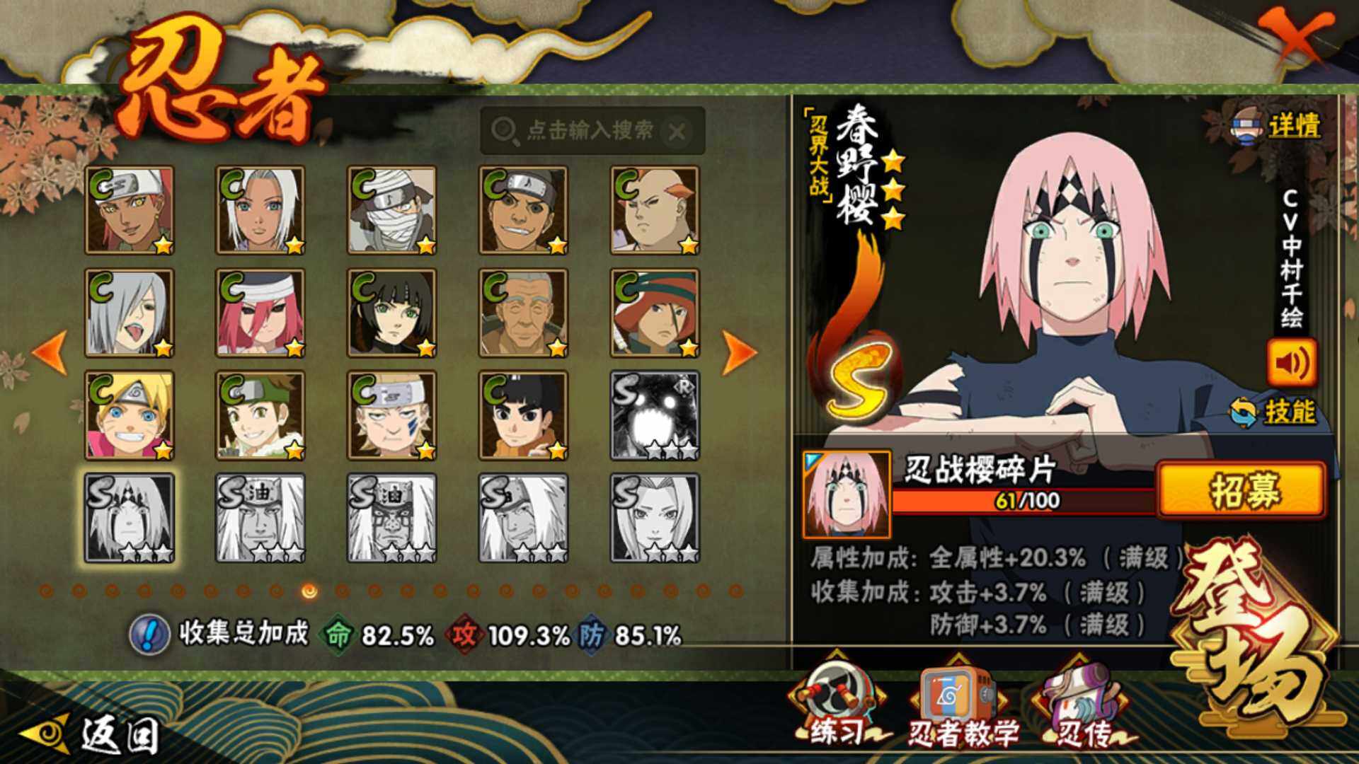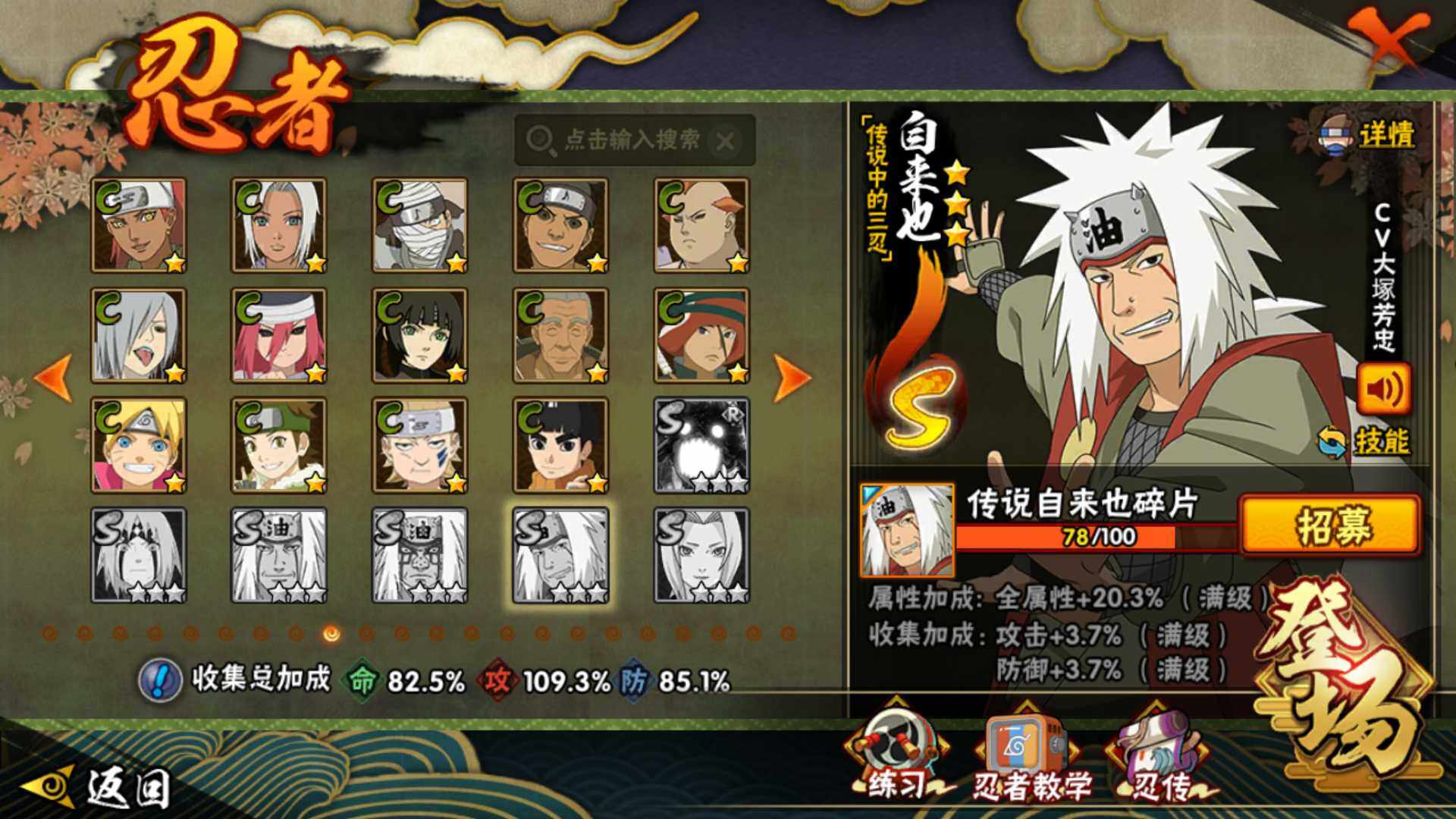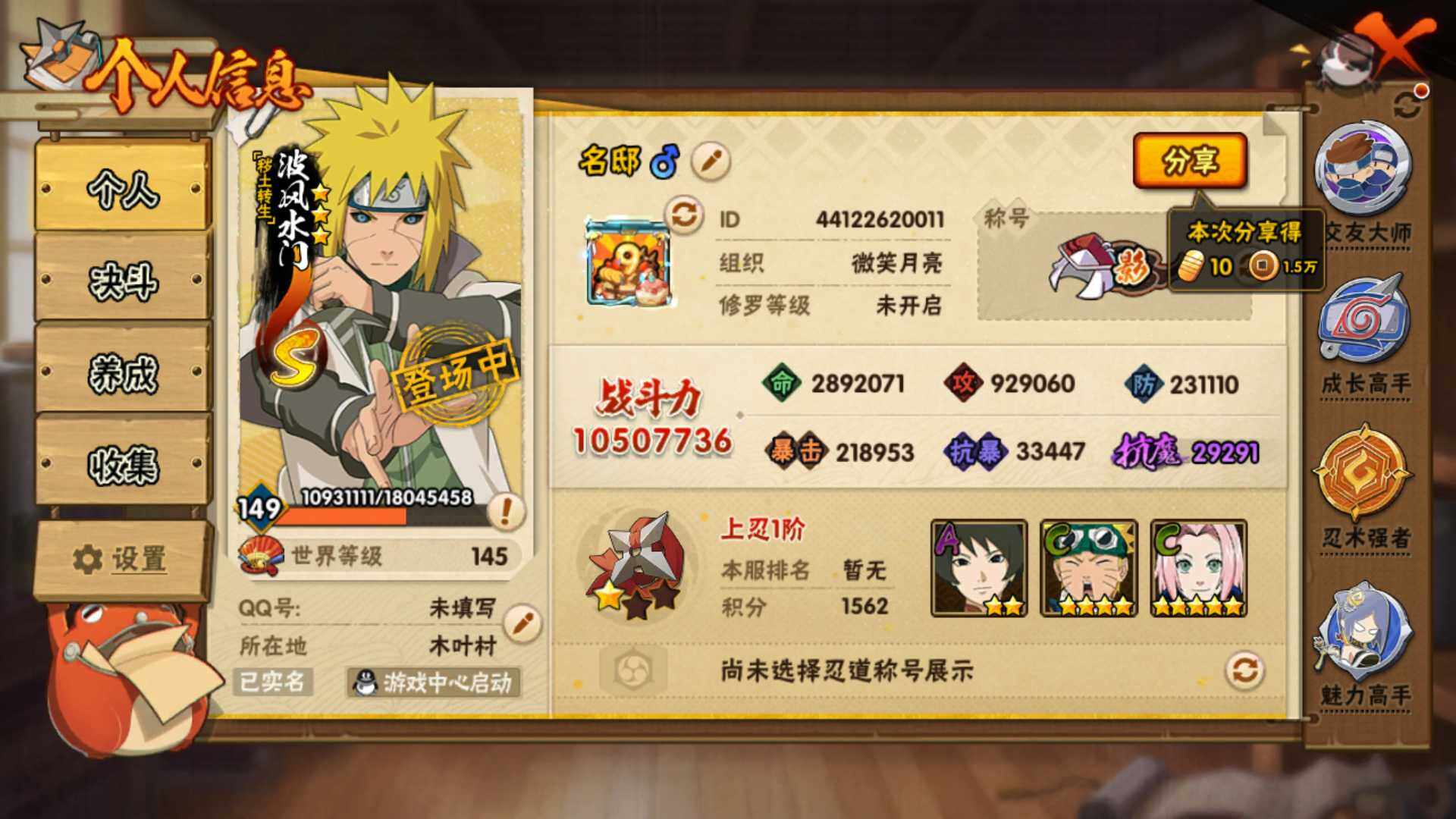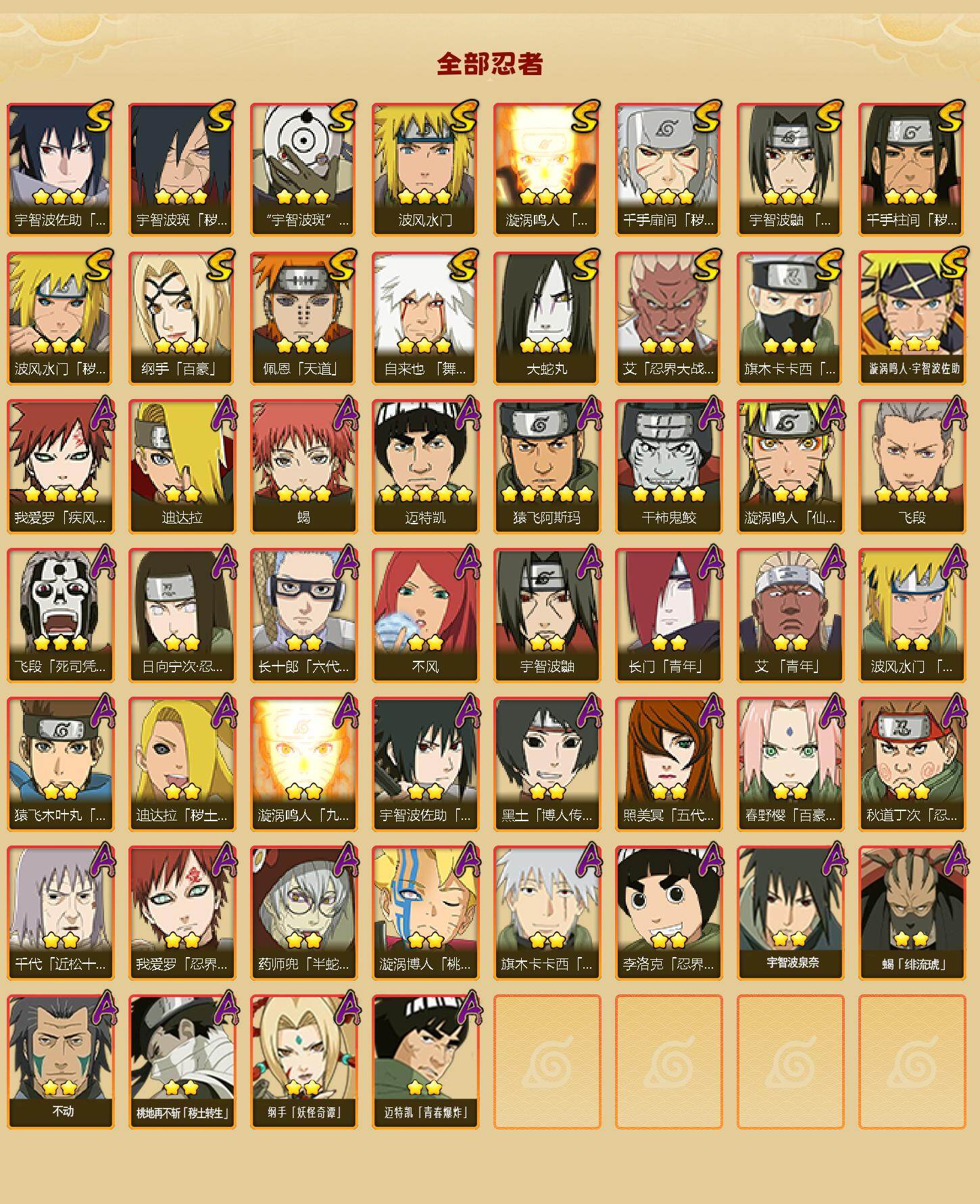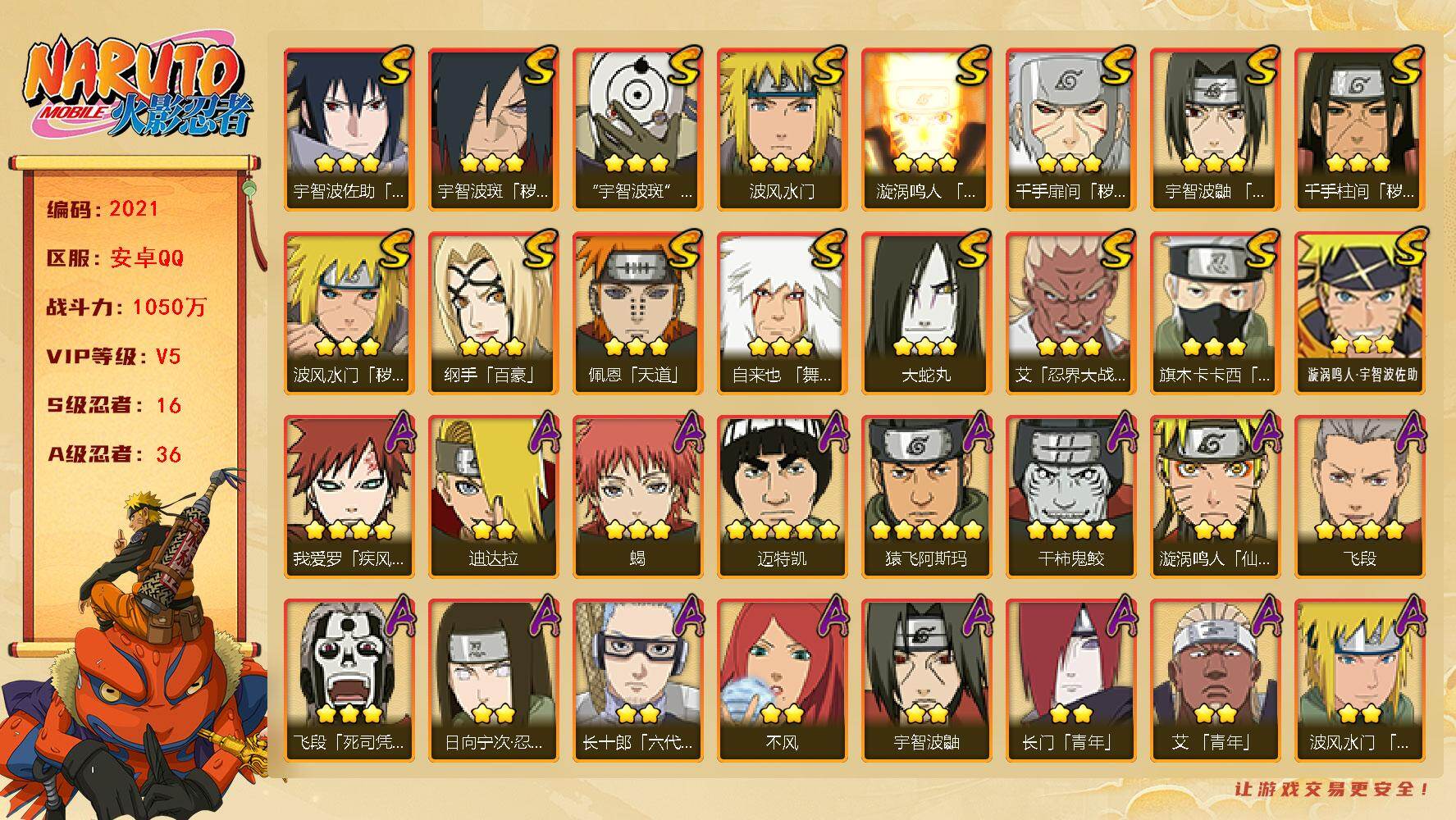 [16565466](可免费转苹果)v51050w战力,16s级忍者数-36a级忍者数,传说自来也78片,忍战樱61片,金水门66片,秽土斑63片,忍战带土79片。me2121 【s级忍者】:波风水门「秽土转生」3星,千手扉间「秽土转生」3星,千手柱间「秽土转生」3星,宇智波斑「秽土转生·解」3星,艾「忍界大战」3星,宇智波鼬「须佐能乎」3星,旗木卡卡西「须佐能乎」3星,自来也「舞之豪杰」3星,大蛇丸3星,纲手「百豪」3星,波风水门3星,漩涡鸣人「九喇嘛连结」3星,佩恩「天道」3星,宇智波佐助「永恒万花筒」3星,宇智波斑 「白面具」3星宇智波斑「白面具」,漩涡鸣人·宇智波佐助3星 【a级忍者】:艾「青年」2星,长门「青年」2星,波风水门「青年」2星,迪达拉2星,迪达拉「秽土转生」2星,飞段4星,飞段「死司凭血」3星,干柿鬼鲛4星,漩涡博人「桃式显现」2星,漩涡鸣人「仙人模式」2星,漩涡鸣人「九尾查克拉」2星,迈特凯5星,旗木卡卡西「幻之真容」2星,桃地再不斩「秽土转生」2星,我爱罗「疾风传」4星,我爱罗「忍界大战」2星,蝎3星,蝎「绯流琥」2星,猿飞阿斯玛5星,宇智波鼬2星,宇智波佐助「须佐能乎」2星,药师兜「半蛇斗篷」2星,照美冥「五代目水影」2星,日向宁次「忍界大战」2星,长十郎「六代目水影」2星,李洛克「忍界大战」2星,猿飞木叶丸「博人传」2星,黑土「博人传」2星,春野樱「百豪」2星,秋道丁次「忍界大战」2星,千代「近松十人卫」2星,不风2星,宇智波泉奈2星,不动2星,纲手「妖怪奇谭」2星,迈特凯「青春爆炸」2星